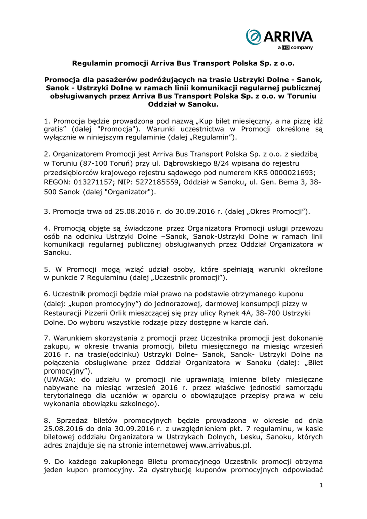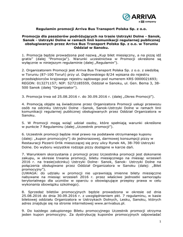 Regulamin promocji Arriva Bus Transport Polska Sp. z o.o. Promocja dla pasażerów podróżujących na trasie Ustrzyki Dolne - Sanok, Sanok - Ustrzyki Dolne w ramach linii komunikacji regularnej publicznej obsługiwanych przez Arriva Bus Transport Polska Sp. z o.o. w Toruniu Oddział w Sanoku. 1. Promocja będzie prowadzona pod nazwą „Kup bilet miesięczny, a na pizzę idź gratis” (dalej "Promocja"). Warunki uczestnictwa w Promocji określone są wyłącznie w niniejszym regulaminie (dalej „Regulamin”). 2. Organizatorem Promocji jest Arriva Bus Transport Polska Sp. z o.o. z siedzibą w Toruniu (87-100 Toruń) przy ul. Dąbrowskiego 8/24 wpisana do rejestru przedsiębiorców krajowego rejestru sądowego pod numerem KRS 0000021693; REGON: 013271157; NIP: 5272185559, Oddział w Sanoku, ul. Gen. Bema 3, 38500 Sanok (dalej "Organizator"). 3. Promocja trwa od 25.08.2016 r. do 30.09.2016 r. (dalej „Okres Promocji”). 4. Promocją objęte są świadczone przez Organizatora Promocji usługi przewozu osób na odcinku Ustrzyki Dolne –Sanok, Sanok-Ustrzyki Dolne w ramach linii komunikacji regularnej publicznej obsługiwanych przez Oddział Organizatora w Sanoku. 5. W Promocji mogą wziąć udział osoby, które spełniają warunki określone w punkcie 7 Regulaminu (dalej „Uczestnik promocji”). 6. Uczestnik promocji będzie miał prawo na podstawie otrzymanego kuponu (dalej: „kupon promocyjny”) do jednorazowej, darmowej konsumpcji pizzy w Restauracji Pizzerii Orlik mieszczącej się przy ulicy Rynek 4A, 38-700 Ustrzyki Dolne. Do wyboru wszystkie rodzaje pizzy dostępne w karcie dań. 7. Warunkiem skorzystania z promocji przez Uczestnika promocji jest dokonanie zakupu, w okresie trwania promocji, biletu miesięcznego na miesiąc wrzesień 2016 r. na trasie(odcinku) Ustrzyki Dolne- Sanok, Sanok- Ustrzyki Dolne na połączenia obsługiwane przez Oddział Organizatora w Sanoku (dalej: „Bilet promocyjny”). (UWAGA: do udziału w promocji nie uprawniają imienne bilety miesięczne nabywane na miesiąc wrzesień 2016 r. przez właściwe jednostki samorządu terytorialnego dla uczniów w oparciu o obowiązujące przepisy prawa w celu wykonania obowiązku szkolnego). 8. Sprzedaż biletów promocyjnych będzie prowadzona w okresie od dnia 25.08.2016 do dnia 30.09.2016 r. z uwzględnieniem pkt. 7 regulaminu, w kasie biletowej oddziału Organizatora w Ustrzykach Dolnych, Lesku, Sanoku, których adres znajduje się na stronie internetowej www.arrivabus.pl. 9. Do każdego zakupionego Biletu promocyjnego Uczestnik promocji otrzyma jeden kupon promocyjny. Za dystrybucję kuponów promocyjnych odpowiadać 1 będzie pracownik Organizatora zatrudniony w kasie biletowej. Kupony promocyjne są wydawane tylko łącznie z zakupem biletu promocyjnego. 10. Uczestnik promocji ma prawo do wykorzystania kuponu promocyjnego w terminie od 1 września 2016 do 31 października 2016 r. Po tym czasie kupon promocyjny traci swoją ważność. 11. Promocja, która jest określona w niniejszym Regulaminie łączy się z ulgami wynikającymi z przepisów powszechnie obowiązującego prawa polskiego lub z innymi ulgami handlowymi, stosowanymi przez Organizatora Promocji. 12. Promocja, która jest określona w niniejszym Regulaminie nie łączy się z innymi promocjami stosowanymi przez Organizatora Promocji. 13. Przyjmuje się, że Uczestnik promocji biorący udział w Promocji zapoznał się z treścią niniejszego Regulaminu i wyraża zgodę na udział w Promocji na zasadach w niej określonych. 14. Uczestnikowi promocji nie przysługuje prawo wymiany kuponu promocyjnego na ekwiwalent pieniężny lub domagania się w zamian za prawo do skorzystania z kuponu promocyjnego ekwiwalentu pieniężnego lub rzeczowego. 15. Niniejszy Regulamin Promocji będzie dostępny na tablicy ogłoszeń w kasie biletowej oddziału Organizatora w Ustrzykach Dolnych, Lesku oraz Sanoku oraz w serwisie internetowym Organizatora Promocji pod adresem http://www.arrivabus.pl. 16. Reklamacje rozpatruje Organizator Promocji. Rozpatrzeniu podlegają wyłącznie reklamacje zgłoszone w formie pisemnej na adres Oddziału Organizatora w Oddziale w Sanoku, ul. Gen. Bema 3, 38-500 Sanok. Pisemna reklamacja powinna zawierać minimum: imię, nazwisko, dokładny adres Uczestnika promocji, opis i wskazanie przyczyn reklamacji. 17. Reklamacje rozpatrywane są w terminie 14 dni od daty ich zgłoszenia. W przypadku, gdy reklamacja wymaga uzupełnienia termin na jej rozpatrzenie zaczyna bieg od daty jej prawidłowego uzupełnienia. 18. Organizator Promocji może odmówić rozpatrzenia reklamacji wniesionej po upływie 30 dni od daty zakupu biletu promocyjnego. 19. Prawa i obowiązki Organizatora Promocji i Uczestników promocji określone są wyłącznie w niniejszym Regulaminie oraz we właściwych przepisach obowiązującego prawa. Wszelkie informacje dostępne w materiałach reklamowych mają jedynie charakter informacyjny. 20. Organizator Promocji zastrzega sobie prawo do zmiany treści Regulaminu, w tym przedłużenia Okresu Promocji. Informacja o zmianie Regulaminu każdorazowo będzie zamieszczana zgodnie z pkt. 15. 21. Organizator zastrzega sobie prawo do zakończenia Promocji w dowolnym czasie przed upływem okresu, o którym mowa w pkt 3, jeżeli wyczerpie się pula posiadanych kuponów, o czym poinformuje zgodnie z pkt 15. Jednakże wszystkie kupony promocyjne wydane przed zakończeniem Promocji pozostaną w takim przypadku ważne do 31 października 2016 r. 2