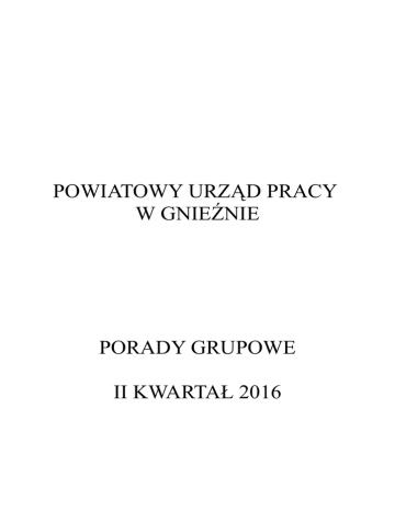 POWIATOWY URZĄD PRACY W GNIEŹNIE PORADY GRUPOWE II KWARTAŁ 2016 Terminy w kwietniu 2016r Czas trwania 04.04.16r 2 godziny Temat porady Zapisy p.10 „Moje działania w kierunku osiągnięcia celu zawodowego” 08.04.16r 2 godziny Warsztaty zawodoznawcze dla kandydatów na szkolenie „Spawanie metodą Mag i Tig” p. 20 15.04.16r 2 godziny „Określenie celów oraz oczekiwań zawodowych w ramach tworzenia IPD” p. 14 21.04.16r 2 godziny Warsztaty zawodoznawcze dla kandydatów na szkolenie „ Operator koparko-ładowarki” p. 19 25.04.16r 2 godziny Warsztaty zawodoznawcze dla kandydatów na szkolenie „Obsługa wózków jezdniowych” p.14 28.04.16r 2 godziny Warsztaty zawodoznawcze dla kandydatów na szkolenie „Obsługa wózków jezdniowych” p.14 Terminy w maju 2016r Czas trwania Temat porady Zapisy 19.05.16r 2 godziny Warsztaty zawodoznawcze dla kandydatów „Operator koparki jednonaczyniowej klasa III” p. 19 23.05.16r 2 godziny Warsztaty zawodoznawcze dla kandydatów na szkolenie „Księgowy ds płac i rozliczeń z ZUS” p. 14 30.05.16r 2 godziny Warsztaty zawodoznawcze dla kandydatów na szkolenie „Księgowy ds płac i rozliczeń z ZUS” p. 14 31.05.16r 2 godziny Warsztaty zawodoznawcze dla kandydatów na szkolenie „Kurs florystyczny z elementami obsługi kas fiskalnych i technikami dekoracji” p. 07 Terminy w maju 2016r Czas trwania 06.06.16r 2 godziny 17.06.16r 27.06.16r Temat porady Zapisy Poznaj siebie i swoje możliwości na rynku pracy. „Jak planować dalszą ścieżkę rozwoju zawodowego w oparciu o dostępne usługi PUP” p. 07 2 godziny Trening motywacji dla osób długotrwale bezrobotnych do 30 roku życia „Aby chciało nam się chcieć”. p. 20 2 godziny Analiza dotychczasowych doświadczeń zawodowych. Określenie słabych i mocnych cech osobowości. p. 19