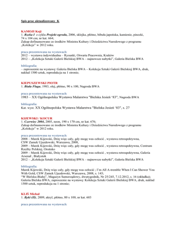 Spis prac aktualizowany K KAMOJI Koji 1. Rzeka I z cyklu Projekt ogrodu, 2006, sklejka, płótno, bibuła japońska, kamienie, pinezki, 74 x 104 cm; nr kat. 664; Zakup dofinansowano ze środków Ministra Kultury i Dziedzictwa Narodowego z programu „Kolekcje” w 2012 roku. praca prezentowana na wystawach: 2012 – wystawa indywidualna – Rysunki, Otwarta Pracownia, Kraków 2012 – „Kolekcja Sztuki Galerii Bielskiej BWA – najnowsze nabytki”, Galeria Bielska BWA bibliografia: – zaproszenie na wystawę: Galeria Bielska BWA – Kolekcja Sztuki Galerii Bielskiej BWA, druk, nakład 1500 sztuk, reprodukcja na 1 stronie; KIEPUSZEWSKI PIOTR 1. Biała Flaga, 1983, olej, płótno, 90 x 100, Nagroda BWA praca prezentowana na wystawach: 1983 – XX Ogólnopolska Wystawa Malarstwa "Bielska Jesień ‘83", Nagroda BWA bibliografia: Kat. wyst. XX Ogólnopolska Wystawa Malarstwa "Bielska Jesień ‘83", s. 27 KIJEWSKI / KOCUR 1. Czerwiec 2004, 2005, neon, 190 x 170 cm, nr kat. 676; Zakup dofinansowano ze środków Ministra Kultury i Dziedzictwa Narodowego z programu „Kolekcje” w 2012 roku. praca prezentowana na wystawach: 2008 – Marek Kijewski, Drżę więc cały, gdy mogę was ozłocić , wystawa retrospektywna, CSW Zamek Ujazdowski, Warszawa, 2008, 2009 – Marek Kijewski, Drżę więc cały, gdy mogę was ozłocić , wystawa retrospektywna, Centrum Rzeźby Polskiej, Orońsko 2009 – Marek Kijewski, Drżę więc cały, gdy mogę was ozłocić , wystawa retrospektywna, Galeria Arsenał , Białystok 2012 – „Kolekcja Sztuki Galerii Bielskiej BWA – najnowsze nabytki”, Galeria Bielska BWA bibliografia: Marek Kijewski, Drżę więc cały, gdy mogę was ozłocić ; I’m All A-tremble When I Can Shower You With Gold, CSW Zamek Ujazdowski, Warszawa, 2008, s. 145; “W Bielsku-Białej”, Magazyn Samorządowy, dwutygodnik, Nr 25/245, 7.12.2012, s. 16 (okładka); Galeria Bielska BWA, zaproszenie na wystawę: Kolekcja Sztuki Galerii Bielskiej BWA, druk, nakład 1500 sztuk, reprodukcja na 1 stronie; KLIŚ Michał 1. Byki (II), 2009, akryl, płótno, 80 x 100, nr kat. 603 praca prezentowana na wystawach: 2009 – „Byki”, wystawa indywidualna, Galeria Sztuki Współczesnej Oranżeria, PAN, Jabłonna 2009 – „Byki”, wystawa indywidualna, Galeria Bielska BWA, Bielsko-Biała 2009 – „Kleines Wien zur Gast in Wien / Mały Wiedeń z Wizytą w Wiedniu”, Galeria Time, Wiedeń, Austria; reprod.: kat. wyst., ss. 10, 24 2009 – „Byki”, wystawa indywidualna, Galeria Marchołt, Katowice reprod.: „Relacje–Interpretacje”, nr 3/2009, s. 2 i wewn. str. okładki; „Sztuka.pl”, portal internetowy [dostęp 14.02.2011] bibliografia: album Kolekcja Sztuki Galerii Bielskiej BWA, Galeria Bielska BWA, Bielsko-Biała 2011, s. 67, 218 Pozostałe prace artysty w zbiorach Galerii Bielskiej BWA 2. Byki (I), 2009, akryl, płótno, 80 x 100, nr kat. 602 3. Smuga, 1978, olej, płótno, 60 x 80, nr kat. 158 bibliografia: album Kolekcja Sztuki Galerii Bielskiej BWA, Galeria Bielska BWA, Bielsko-Biała 2011, s. 66, 4. Kompozycja I, 1978, olej, płótno, 54 x 73, nr kat. 27 5. Pejzaż, 1985/1986, olej, płótno, 80 x 100, nr kat. 102; sygn. p.d.: M. Kliś 85/86 bibliografia: album Kolekcja Sztuki Galerii Bielskiej BWA, Galeria Bielska BWA, Bielsko-Biała 2011, s. 66, 6. Pejzaż górski (burzowy), 1977, olej, płótno, 80 x 100, nr kat. 107 7. Oczekiwanie I, 1974, serigrafia, papier, 46 x 59, nr kat. 212 8. Oczekiwanie II, 1974, serigrafia, papier, 46 x 59, nr kat. 213 9. Wspomnienie IV, 1974, serigrafia, papier, 46 x 59, nr kat. 214 10. Wspomnienie, którego nie było, 1974, serigrafia, papier, 46 x 59, nr kat. 215 11. Wspomnienie I, 1974, serigrafia, papier, 46 x 59, nr kat. 216 12. Misterium, tryptyk, 2005, olej, płótno, 80 x 100, nr kat. 380 KMITA Katarzyna 1. Bajka, 2012, 100 x 100 cm, papier, praca w technice wycinanki; nr kat. 666; Zakup dofinansowano ze środków Ministra Kultury i Dziedzictwa Narodowego z programu „Kolekcje” w 2012 roku. praca prezentowana na wystawach: 2011/2012 – Must have it, Galeria Awangarda BWA, Wrocław 2012 – Katarzyna Kmita – Must have it, Galeria Bielska BWA 2012 – „Kolekcja Sztuki Galerii Bielskiej BWA – najnowsze nabytki”, Galeria Bielska BWA bibliografia: “W Bielsku-Białej”, Magazyn Samorządowy, dwutygodnik, Nr 25/245, 7.12.2012, s. 16 (okładka) Galeria Bielska BWA, zaproszenie na wystawę: Kolekcja Sztuki Galerii Bielskiej BWA, druk, nakład 1500 sztuk, reprodukcja na 1 stronie; KOKORYN Krzysztof 1. Dzik Ojciec, 2008, olej, płótno, 100 x 140, nr kat. 395 Boar Father, oil, canvas praca prezentowana na wystawach: 2009 – „Dzik”, wystawa indywidualna, Galeria Bielska BWA, Bielsko-Biała 2009 – „Neskrotný sen lesnej noci” (Nieokiełznany sen nocy leśnej), wystawa indywidualna, Liptovska Galeria Petra Michala Bohúňa, Liptovski Mikulaš, Słowacja 2010 – „50 obrazów”, Galeria Bielska BWA, Bielsko-Biała bibliografia: książka: Lokomotywa. Wpływ kultury na rozwój lokalny, Galeria Bielska BWA, 2011, repr. s. 100; album Kolekcja Sztuki Galerii Bielskiej BWA, Galeria Bielska BWA, Bielsko-Biała 2011, s. 68, 217 Pozostałe prace artysty w zbiorach Galerii Bielskiej BWA 2. Dziczek Brunatny, 50 x 65, nr kat. 396 3. Dziczek Szary, 50 x 65, nr kat. 397 4. Dziczek z różowym nosem, 50 x 65, nr kat. 398 5. Dziczek Uśmiechnięty, 50 x 65, nr kat. 399 prace prezentowane na wystawach: 2009 – „Dzik”, wystawa indywidualna, Galeria Bielska BWA, Bielsko-Biała 2009 – „Neskrotný sen lesnej noci” (Nieokiełznany sen nocy leśnej), wystawa indywidualna, Liptovska Galeria Petra Michala Bohúňa, Liptovski Mikulaš, Słowacja bibliografia: album Kolekcja Sztuki Galerii Bielskiej BWA, Galeria Bielska BWA, Bielsko-Biała 2011, s. 68, 69; KOKOSIŃSKI Bartosz 1. Bez tytułu, 2011, farba ftalowa, płótno, 80 x 105 x 16, nr kat. 779; Praca prezentowana na wystawach: 2013 – 41. Biennale Malarstwa „Bielska Jesień 2013”,