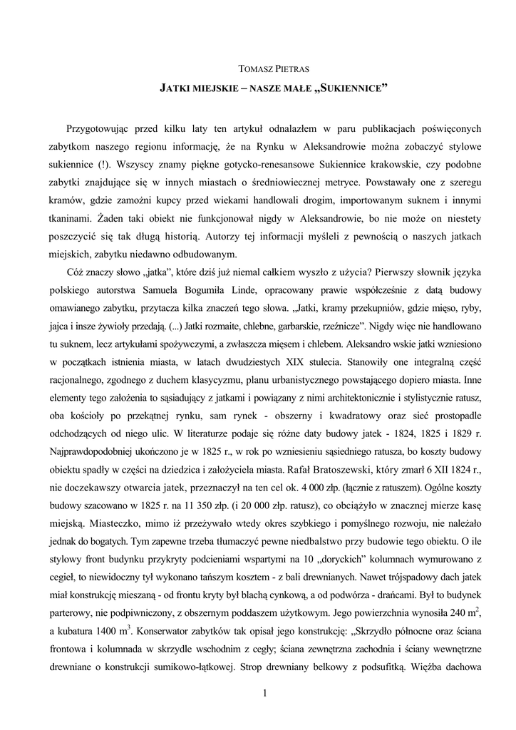 TOMASZ PIETRAS JATKI MIEJSKIE – NASZE MAŁE „SUKIENNICE” Przygotowując przed kilku laty ten artykuł odnalazłem w paru publikacjach poświęconych zabytkom naszego regionu informację, że na Rynku w Aleksandrowie można zobaczyć stylowe sukiennice (!). Wszyscy znamy piękne gotycko-renesansowe Sukiennice krakowskie, czy podobne zabytki znajdujące się w innych miastach o średniowiecznej metryce. Powstawały one z szeregu kramów, gdzie zamożni kupcy przed wiekami handlowali drogim, importowanym suknem i innymi tkaninami. Żaden taki obiekt nie funkcjonował nigdy w Aleksandrowie, bo nie może on niestety poszczycić się tak długą historią. Autorzy tej informacji myśleli z pewnością o naszych jatkach miejskich, zabytku niedawno odbudowanym. Cóż znaczy słowo „jatka”, które dziś już niemal całkiem wyszło z użycia? Pierwszy słownik języka polskiego autorstwa Samuela Bogumiła Linde, opracowany prawie współcześnie z datą budowy omawianego zabytku, przytacza kilka znaczeń tego słowa. „Jatki, kramy przekupniów, gdzie mięso, ryby, jajca i insze żywioły przedają. (...) Jatki rozmaite, chlebne, garbarskie, rzeźnicze”. Nigdy więc nie handlowano tu suknem, lecz artykułami spożywczymi, a zwłaszcza mięsem i chlebem. Aleksandro wskie jatki wzniesiono w początkach istnienia miasta, w latach dwudziestych XIX stulecia. Stanowiły one integralną część racjonalnego, zgodnego z duchem klasycyzmu, planu urbanistycznego powstającego dopiero miasta. Inne elementy tego założenia to sąsiadujący z jatkami i powiązany z nimi architektonicznie i stylistycznie ratusz, oba kościoły po przekątnej rynku, sam rynek - obszerny i kwadratowy oraz sieć prostopadle odchodzących od niego ulic. W literaturze podaje się różne daty budowy jatek - 1824, 1825 i 1829 r. Najprawdopodobniej ukończono je w 1825 r., w rok po wzniesieniu sąsiedniego ratusza, bo koszty budowy obiektu spadły w części na dziedzica i założyciela miasta. Rafał Bratoszewski, który zmarł 6 XII 1824 r., nie doczekawszy otwarcia jatek, przeznaczył na ten cel ok. 4 000 złp. (łącznie z ratuszem). Ogólne koszty budowy szacowano w 1825 r. na 11 350 złp. (i 20 000 złp. ratusz), co obciążyło w znacznej mierze kasę miejską. Miasteczko, mimo iż przeżywało wtedy okres szybkiego i pomyślnego rozwoju, nie należało jednak do bogatych. Tym zapewne trzeba tłumaczyć pewne niedbalstwo przy budowie tego obiektu. O ile stylowy front budynku przykryty podcieniami wspartymi na 10 „doryckich” kolumnach wymurowano z cegieł, to niewidoczny tył wykonano tańszym kosztem - z bali drewnianych. Nawet trójspadowy dach jatek miał konstrukcję mieszaną - od frontu kryty był blachą cynkową, a od podwórza - drańcami. Był to budynek parterowy, nie podpiwniczony, z obszernym poddaszem użytkowym. Jego powierzchnia wynosiła 240 m2, a kubatura 1400 m3. Konserwator zabytków tak opisał jego konstrukcję: „Skrzydło północne oraz ściana frontowa i kolumnada w skrzydle wschodnim z cegły; ściana zewnętrzna zachodnia i ściany wewnętrzne drewniane o konstrukcji sumikowo-łątkowej. Strop drewniany belkowy z podsufitką. Więźba dachowa 1 drewniana typu krokwiowego z jętką”. Z pobliskim ratuszem połączono jatki krytą galerią, dzięki czemu stworzyły wyjątkowy zespół architektoniczny. Projektantem całości był Henryk Marconi. Ich przeznaczenie dokładnie tłumaczy oficjalna nazwa: Jatki Rzeźniczo-Piekarskie. Przez 100 lat istnienia jatek znajdowały się tu sklepiki rzeźników i piekarzy aleksandrowskich oraz ich skromne mieszkania. Władze miasta wydzierżawiały poszczególne sklepy - jatki w drodze publicznej licytacji. Zachowała się dokumentacja tych licytacji i umowy z dzierżawcami z lat 1834-1866. Dla przykładu w 1838 r. w wyniku licytacji wydzierżawiono aleksandrowskim rzemieślnikom 16 jatek rzeźniczych i 12 piekarskich. Wśród wymienionych dzierżawców widzimy zarówno nazwiska niemieckie (np. rzeźnicy Gottlib Braunke, Gottlib Lechelt, Johan Kühn czy piekarze Wilhelm Engel i Friedrich Walter), żydowskie (np. piekarze Juda Layb Colek czy Lewek Pomarantzcz), jak i polskie (np. rzeźnicy Jan Krakowski czy Franciszek Dąbrowski). Na umowach dzierżawy można dostrzec podpisy alfabetem łacińskim, hebrajskim i... trzema krzyżykami. Niektórzy rzeźnicy i piekarze wydzierżawiali po kilka sklepików (np. Wilhelm Engel aż 6). Rzeźnicy i piekarze wpłacali do kasy miejskiej tytułem dzierżawy pewne, dosyć zróżnicowane zresztą, sumy. Stanowiły one niemałą część dochodów miasta (np. w 1838 r - 631 złp.). Spośród produktów sprzedawanych w jatkach w latach (1827 r.) funt chleba kosztował 16 gr. funt mięsa wołowego 11 gr, a wieprzowiny 9 gr., przy zarobkach przeciętnego tkacza ok. 50 złp. na tydzień. Już wkrótce po ukończeniu jatek, miasto zaczęło spłacać cenę za „oszczędności” poczynione przy ich budowie, mimo że w oficjalnym raporcie burmistrza Antoniego Bobowskiego do władz z 1860 r. pisano o jatkach „masiv murowanych”. Już w 1845 r. mówi się o konieczności remontu „z powodu pogarszającego się stanu (...) a mianowicie dachu, który pokryty cynkiem przez wiatr połamanym i podziurawionym został” i „z powodu, że do jatek przecieka”, czego podjął się pewien miejscowy przedsiębiorca żydowski. Starania u władz zwierzchnich o pieniądze na naprawę dachu, których miasto nie miało, ciągnęły się dobre 7 lat. Reperacja ta na długo jednak nie wystarczyła. Już w 1859 r. konieczny okazał się gruntowny remont, który „z powodu braku funduszów w kasie miejskiej, zdeklarowali uskutecznić dziedzic miasta (Tadeusz Kossowski) i mieszkańcy własnym sumptem”. Były to już lata, gdy Aleksandrów przegrywał wyścig do nowoczesności z sąsiednią Łodzią i powoli stawał się sennym, opustoszałym miasteczkiem. Jatki były wtedy obiektem tak użytecznym, że wielu obywateli miasta zgo