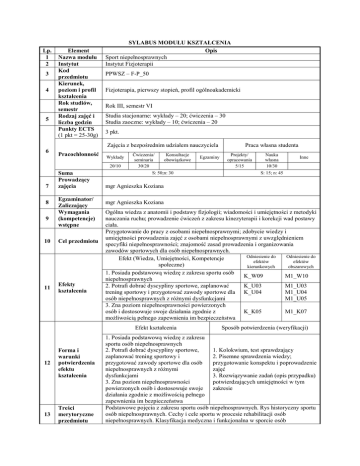 Lp. 1 2 3 4 5 Element Nazwa modułu Instytut Kod przedmiotu Kierunek, poziom i profil kształcenia Rok studiów, semestr Rodzaj zajęć i liczba godzin Punkty ECTS (1 pkt = 25-30g) SYLABUS MODUŁU KSZTAŁCENIA Opis Sport niepełnosprawnych Instytut Fizjoterapii PPWSZ – F-P_50 Fizjoterapia, pierwszy stopień, profil ogólnoakademicki Rok III, semestr VI Studia stacjonarne: wykłady – 20; ćwiczenia – 30 Studia zaoczne: wykłady – 10; ćwiczenia – 20 3 pkt. Zajęcia z bezpośrednim udziałem nauczyciela 6 Pracochłonność Wykłady 20/10 7 8 9 Suma Prowadzący zajęcia Egzaminator/ Zaliczający Wymagania (kompetencje) wstępne 10 Cel przedmiotu 11 Efekty kształcenia Ćwiczenia/ seminaria 30/20 Konsultacje obowiązkowe S: 50;n: 30 12 13 Treści merytoryczne przedmiotu Projekty/ opracowania 5/15 Nauka własna 10/30 Inne S: 15; n: 45 mgr Agnieszka Koziana mgr Agnieszka Koziana Ogólna wiedza z anatomii i podstawy fizjologii; wiadomości i umiejętności z metodyki nauczania ruchu; prowadzenie ćwiczeń z zakresu kinezyterapii i korekcji wad postawy ciała. Przygotowanie do pracy z osobami niepełnosprawnymi; zdobycie wiedzy i umiejętności prowadzenia zajęć z osobami niepełnosprawnymi z uwzględnieniem specyfiki niepełnosprawności; znajomość zasad prowadzenia i organizowania zawodów sportowych dla osób niepełnosprawnych. Odniesienie do Odniesienie do Efekt (Wiedza, Umiejętności, Kompetencje efektów efektów społeczne) kierunkowych obszarowych 1. Posiada podstawową wiedzę z zakresu sportu osób K_W09 M1_W10 niepełnosprawnych 2. Potrafi dobrać dyscypliny sportowe, zaplanować K_U03 M1_U03 trening sportowy i przygotować zawody sportowe dla K_U04 M1_U04 osób niepełnosprawnych z różnymi dysfunkcjami M1_U05 3. Zna poziom niepełnosprawności powierzonych osób i dostosowuje swoje działania zgodnie z K_K05 M1_K07 możliwością pełnego zapewnienia im bezpieczeństwa Efekt kształcenia Forma i warunki potwierdzenia efektu kształcenia Egzaminy Praca własna studenta Sposób potwierdzenia (weryfikacji) 1. Posiada podstawową wiedzę z zakresu sportu osób niepełnosprawnych 2. Potrafi dobrać dyscypliny sportowe, 1. Kolokwium, test sprawdzający zaplanować trening sportowy i 2. Pisemne sprawdzenia wiedzy; przygotować zawody sportowe dla osób przygotowanie konspektu i poprowadzenie niepełnosprawnych z różnymi zajęć dysfunkcjami 3. Rozwiązywanie zadań (opis przypadku) 3. Zna poziom niepełnosprawności potwierdzających umiejętności w tym powierzonych osób i dostosowuje swoje zakresie działania zgodnie z możliwością pełnego zapewnienia im bezpieczeństwa Podstawowe pojęcia z zakresu sportu osób niepełnosprawnych. Rys historyczny sportu osób niepełnosprawnych. Cechy i cele sportu w procesie rehabilitacji osób niepełnosprawnych. Klasyfikacja medyczna i funkcjonalna w sporcie osób 14 Wykaz literatury podstawowej 15 Wykaz literatury uzupełniającej (pomocniczej) niepełnosprawnych w zależności od rodzaju schorzenia. Organizacja sportu osób niepełnosprawnych na Świecie i w Polsce. Wybrane dyscypliny sportu dla osób z różnymi dysfunkcjami. Sport dla osób niewidomych, głuchych, z upośledzeniem umysłowym i z dysfunkcją narządu ruchu. Gry sportowe dla niepełnosprawnych. Specyfika dyscyplin indywidualnych letnich uprawianych przez osoby niepełnosprawne. Sporty zimowe uprawiane przez osoby niepełnosprawne. Jazda aktywna i sport na wózku inwalidzkim. Trening sportowy i organizacja zawodów sportowych dla osób niepełnosprawnych. Uwagi do planowania metodyki zajęć osób niepełnosprawnych. Przepisy regulujące poszczególne dyscypliny sportowe osób niepełnosprawnych. 1. Kosmal A.: Teoria i praktyka sportu niepełnosprawnych. AWF Warszawa 2008 2. Kowalik S.: Kultura fizyczna osób z niepełnosprawnością. Gdańsk 2009 3. Gawlik K., Zwierzchowska A.: Wychowanie fizyczne niewidomych i słabowidzących. Podręcznik dla studentów. AWF Katowice 2004 4. Orzech J., Sobiecka J.: Sport osób niepełnosprawnych. AWF Kraków 1989 5. Plinta R.: Sport osób niepełnosprawnych. W: A. Zembaty (red.), Kinezyterapia. Ćwiczenia kinezyterapii i metody kinezyterapeutyczne. Kraków 2003: Wydawnictwo „Kasper” Sp.z.o.o., t. II, 167-206 6. Praca zbiorowa: Vademecum Sportu Niepełnosprawnych – Polski Związek Sportu Niepełnosprawnych Oficyna Wydawnicza „Aba”, Warszawa 2008 7. Ronikier A.: Diagnostyka czynnościowa osób niepełnosprawnych. Skrypt AWF Warszawa 1997 8. Sozański H.: Podstawy teorii treningu sportowego. Biblioteka Trenera. COS Warszawa 1999 9. Szczepankowski B.: Niesłyszący - Głusi - Głuchoniemi. Wyrównanie szans. WSziP Warszawa 1999 10. Tasiemski T.: Podstawy narciarstwa zjazdowego osób z urazami rdzenia kręgowego. Stowarzyszenie Sportowe Inwalidów „START” Poznań 1997 11. Tasiemski T.: Urazy rdzenia kręgowego. Trening samoobsługi i techniki jazdy wózkiem inwalidzkim. FAR Warszawa 2000. 1. Beck J.: Sport w rehabilitacji inwalidów. AWF Warszawa 1977 2. Migasiewicz J., Bolach E.: Aktywność ruchowa osób niepełnosprawnych. AWF Wrocław 2004 3. Sozański H.: Podstawy teorii treningu sportowego AWF Warszawa 1999 4. Sport niepełnosprawnych. Biuletyn Informacyjny Polskiego Związku Sportu Niepełnosprawnych „Start”. Wydawany kwartalnie 5. Ślężyński J.: Sport w rehabilitacji niepełnosprawnych. Studio Wydawnicze AGAT, Katowice 2004 6. Talaga J.: A - Z sprawności fizycznej. Atlas ćwiczeń. Warszawa 1995