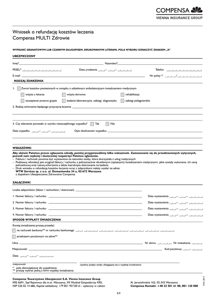 Wniosek o refundację kosztów leczenia Compensa MULTI Zdrowie WYPE¸NIĆ GRANATOWYM LUB CZARNYM D¸UGOPISEM, DRUKOWANYMI LITERAMI, POLA WYBORU OZNACZYĆ ZNAKIEM „X“ UBEZPIECZONY Imię* Nazwisko* PESEL* Telefon Data urodzenia E-mail: Nr polisy *: / RODZAJ ZDARZENIA 1. Zwrot kosztów poniesionych w związku z udzielonym ambulatoryjnym świadczeniem medycznym wizyta u lekarza wizyta domowa rehabilitacja szczepienie przeciw grypie badania laboratoryjne, zabiegi, diagnostyka zabiegi pielęgniarskie 2. Rodzaj schorzenia będącego przyczyną leczenia 3. Czy zdarzenie powstało w wyniku nieszczęśliwego wypadku? Data wypadku Tak Nie Opis okoliczności wypadku: WSKAZÓWKI Aby ułatwić Państwu proces zgłaszania szkody, poniżej przygotowaliśmy kilka wskazówek. Zastosowanie się do przedstawionych wytycznych, pozwoli nam szybciej i skuteczniej rozpatrzyć Państwa zgłoszenie. – Faktura / rachunek powinna być wystawiona na nazwisko osoby, która skorzystała z usług medycznych – Podstawą refundacji jest oryginał faktury / rachunku z jednoznacznie określonymi (opisanymi) świadczeniami medycznymi, jakie zostały wykonane, ich ceną jednostkową oraz nazwą schorzenia a także kserokopia skierowania na badania – Druk wniosku o refundację kosztów leczenia wraz z załącznikami należy wysłać na adres: WTW Services sp. z o.o. ul. Domaniewska 34 a, 02-672 Warszawa z dopiskiem Ubezpieczenia Zdrowotne Compensa ZAŁĄCZNIKI Liczba załączników (faktur / rachunków / skierowań) 1. Numer faktury / rachunku Data wystawienia 2. Numer faktury / rachunku Data wystawienia 3. Numer faktury / rachunku Data wystawienia 4. Numer faktury / rachunku Data wystawienia SPOSÓB WYPŁATY ŚWIADCZENIA Kwotę świadczenia proszę przesłać: na rachunek bankowy** nr rachunku bankowego przekazem pocztowym na adres** Nr domu Ulica Miejscowość Nr mieszkania Kod pocztowy Data miejscowość czytelny podpis osoby ubiegającej się o wypłatę świadczenia Compensa Towarzystwo Ubezpieczeń S.A. Vienna Insurance Group KRS 6691, Sąd Rejonowy dla m.st. Warszawy, XII Wydzia∏ Gospodarczy KRS, NIP 526 02 14 686, Kapita∏ zak∏adowy: 179 851 957,00 z∏ – op∏acony w ca∏ości Al. Jerozolimskie 162, 02-342 Warszawa Compensa Kontakt: +48 22 501 61 00, 801 120 000 1/1 19.01.2017 * pola obowiązkowe do wypełnienia ** proszę wybrać jedną z form wypłaty świadczenia