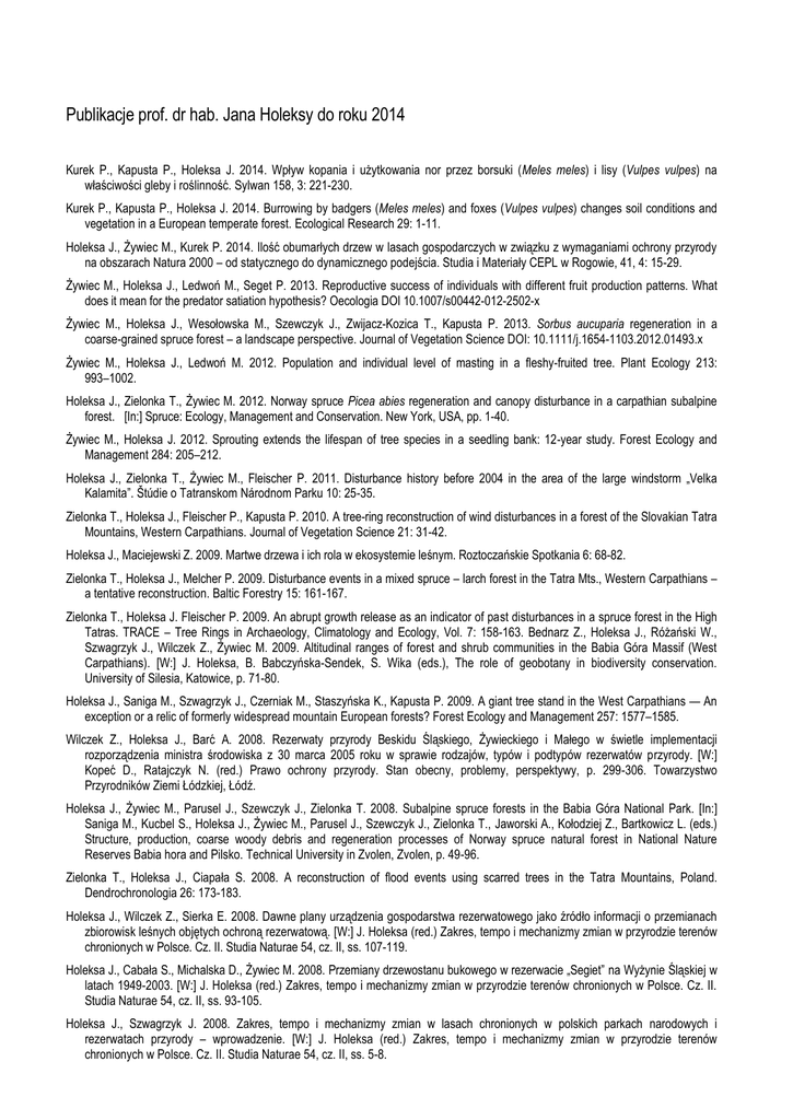 Publikacje prof. dr hab. Jana Holeksy do roku 2014 Kurek P., Kapusta P., Holeksa J. 2014. Wpływ kopania i użytkowania nor przez borsuki (Meles meles) i lisy (Vulpes vulpes) na właściwości gleby i roślinność. Sylwan 158, 3: 221-230. Kurek P., Kapusta P., Holeksa J. 2014. Burrowing by badgers (Meles meles) and foxes (Vulpes vulpes) changes soil conditions and vegetation in a European temperate forest. Ecological Research 29: 1-11. Holeksa J., Żywiec M., Kurek P. 2014. Ilość obumarłych drzew w lasach gospodarczych w związku z wymaganiami ochrony przyrody na obszarach Natura 2000 – od statycznego do dynamicznego podejścia. Studia i Materiały CEPL w Rogowie, 41, 4: 15-29. Żywiec M., Holeksa J., Ledwoń M., Seget P. 2013. Reproductive success of individuals with different fruit production patterns. What does it mean for the predator satiation hypothesis? Oecologia DOI 10.1007/s00442-012-2502-x Żywiec M., Holeksa J., Wesołowska M., Szewczyk J., Zwijacz-Kozica T., Kapusta P. 2013. Sorbus aucuparia regeneration in a coarse-grained spruce forest – a landscape perspective. Journal of Vegetation Science DOI: 10.1111/j.1654-1103.2012.01493.x Żywiec M., Holeksa J., Ledwoń M. 2012. Population and individual level of masting in a fleshy-fruited tree. Plant Ecology 213: 993–1002. Holeksa J., Zielonka T., Żywiec M. 2012. Norway spruce Picea abies regeneration and canopy disturbance in a carpathian subalpine forest. [In:] Spruce: Ecology, Management and Conservation. New York, USA, pp. 1-40. Żywiec M., Holeksa J. 2012. Sprouting extends the lifespan of tree species in a seedling bank: 12-year study. Forest Ecology and Management 284: 205–212. Holeksa J., Zielonka T., Żywiec M., Fleischer P. 2011. Disturbance history before 2004 in the area of the large windstorm „Velka Kalamita”. Štúdie o Tatranskom Národnom Parku 10: 25-35. Zielonka T., Holeksa J., Fleischer P., Kapusta P. 2010. A tree-ring reconstruction of wind disturbances in a forest of the Slovakian Tatra Mountains, Western Carpathians. Journal of Vegetation Science 21: 31-42. Holeksa J., Maciejewski Z. 2009. Martwe drzewa i ich rola w ekosystemie leśnym. Roztoczańskie Spotkania 6: 68-82. Zielonka T., Holeksa J., Melcher P. 2009. Disturbance events in a mixed spruce – larch forest in the Tatra Mts., Western Carpathians – a tentative reconstruction. Baltic Forestry 15: 161-167. Zielonka T., Holeksa J. Fleischer P. 2009. An abrupt growth release as an indicator of past disturbances in a spruce forest in the High Tatras. TRACE – Tree Rings in Archaeology, Climatology and Ecology, Vol. 7: 158-163. Bednarz Z., Holeksa J., Różański W., Szwagrzyk J., Wilczek Z., Żywiec M. 2009. Altitudinal ranges of forest and shrub communities in the Babia Góra Massif (West Carpathians). [W:] J. Holeksa, B. Babczyńska-Sendek, S. Wika (eds.), The role of geobotany in biodiversity conservation. University of Silesia, Katowice, p. 71-80. Holeksa J., Saniga M., Szwagrzyk J., Czerniak M., Staszyńska K., Kapusta P. 2009. A giant tree stand in the West Carpathians — An exception or a relic of formerly widespread mountain European forests? Forest Ecology and Management 257: 1577–1585. Wilczek Z., Holeksa J., Barć A. 2008. Rezerwaty przyrody Beskidu Śląskiego, Żywieckiego i Małego w świetle implementacji rozporządzenia ministra środowiska z 30 marca 2005 roku w sprawie rodzajów, typów i podtypów rezerwatów przyrody. [W:] Kopeć D., Ratajczyk N. (red.) Prawo ochrony przyrody. Stan obecny, problemy, perspektywy, p. 299-306. Towarzystwo Przyrodników Ziemi Łódzkiej, Łódź. Holeksa J., Żywiec M., Parusel J., Szewczyk J., Zielonka T. 2008. Subalpine spruce forests in the Babia Góra National Park. [In:] Saniga M., Kucbel S., Holeksa J., Żywiec M., Parusel J., Szewczyk J., Zielonka T., Jaworski A., Kołodziej Z., Bartkowicz L. (eds.) Structure, production, coarse woody debris and regeneration processes of Norway spruce natural forest in National Nature Reserves Babia hora and Pilsko. Technical University in Zvolen, Zvolen, p. 49-96. Zielonka T., Holeksa J., Ciapała S. 2008. A reconstruction of flood events using scarred trees in the Tatra Mountains, Poland. Dendrochronologia 26: 173-183. Holeksa J., Wilczek Z., Sierka E. 2008. Dawne plany urządzenia gospodarstwa rezerwatowego jako źródło informacji o przemianach zbiorowisk leśnych objętych ochroną rezerwatową. [W:] J. Holeksa (red.) Zakres, tempo i mechanizmy zmian w przyrodzie terenów chronionych w Polsce. Cz. II. Studia Naturae 54, cz. II, ss. 107-119. Holeksa J., Cabała S., Michalska D., Żywiec M. 2008. Przemiany drzewostanu bukowego w rezerwacie „Segiet” na Wyżynie Śląskiej w latach 1949-2003. [W:] J. Holeksa (red.) Zakres, tempo i mechanizmy zmian w przyrodzie terenów chronionych w Polsce. Cz. II. Studia Naturae 54, cz. II, ss. 93-105. Holeksa J., Szwagrzyk J. 2008. Zakres, tempo i mechanizmy zmian w lasach chronionych w polskich parkach narodowych i rezerwatach przyrody – wprowadzenie. [W:] J. Holeksa (red.) Zakres, tempo i mechanizmy zmian w przyrodzie terenów chronionych w Polsce. Cz. II. Studia Naturae 54, cz. II, ss. 5-8. Holeksa J. 2008. Naturalny gospodarz tatrzańskich lasów. Tatry 3 (25): 62-63. Holeksa J, Zielonka T, Żywiec M. 2008. Modeling the decay of coarse woody debris in a subalpine Norway spruce forest of the West Carpathians, Poland. Canadian Journal of Forest Research 38: 415-428. Wilczek Z., Holeksa J., Romańczyk M. 2008. Szata roślinna rezerwatu „Żaki” w Kotlinie Oświęcimskiej – zagrożenia i perspektywy ochrony. Chrońmy przyrodę ojczystą 64, 2: 93-99. Holeksa J., Saniga M., Szwagrzyk J., Dziedzic T., Ferenc S., Wodka M. 2007. Altitudinal variability of stand structure and regeneration in the subalpine spruce forests of the Pol’ana biosphere reserve, Central Slovakia. Eur. J. Forest Res. 126: 303–313. Holeksa J., Szwagrzyk. J. 2007. Zakres, tempo i mechanizmy zmian w przyrodzie terenów chroniony