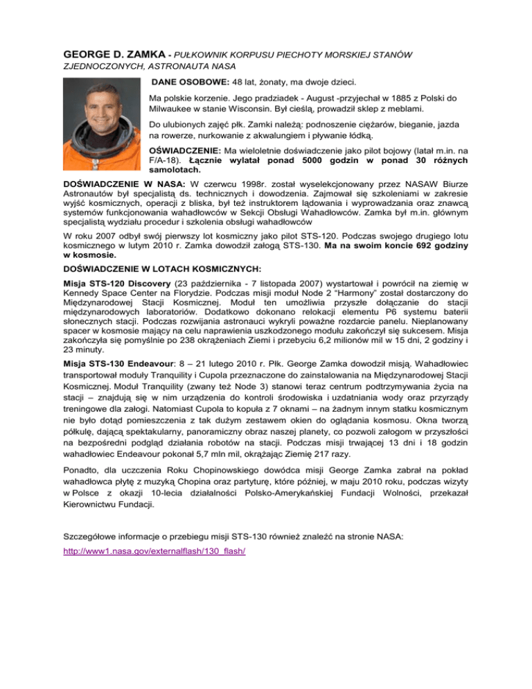 GEORGE D. ZAMKA - PUŁKOWNIK KORPUSU PIECHOTY MORSKIEJ STANÓW ZJEDNOCZONYCH, ASTRONAUTA NASA DANE OSOBOWE: 48 lat, żonaty, ma dwoje dzieci. Ma polskie korzenie. Jego pradziadek - August -przyjechał w 1885 z Polski do Milwaukee w stanie Wisconsin. Był cieślą, prowadził sklep z meblami. Do ulubionych zajęć płk. Zamki należą: podnoszenie ciężarów, bieganie, jazda na rowerze, nurkowanie z akwalungiem i pływanie łódką. OŚWIADCZENIE: Ma wieloletnie doświadczenie jako pilot bojowy (latał m.in. na F/A-18). Łącznie wylatał ponad 5000 godzin w ponad 30 różnych samolotach. DOŚWIADCZENIE W NASA: W czerwcu 1998r. został wyselekcjonowany przez NASAW Biurze Astronautów był specjalistą ds. technicznych i dowodzenia. Zajmował się szkoleniami w zakresie wyjść kosmicznych, operacji z bliska, był też instruktorem lądowania i wyprowadzania oraz znawcą systemów funkcjonowania wahadłowców w Sekcji Obsługi Wahadłowców. Zamka był m.in. głównym specjalistą wydziału procedur i szkolenia obsługi wahadłowców W roku 2007 odbył swój pierwszy lot kosmiczny jako pilot STS-120. Podczas swojego drugiego lotu kosmicznego w lutym 2010 r. Zamka dowodził załogą STS-130. Ma na swoim koncie 692 godziny w kosmosie. DOŚWIADCZENIE W LOTACH KOSMICZNYCH: Misja STS-120 Discovery (23 października - 7 listopada 2007) wystartował i powrócił na ziemię w Kennedy Space Center na Florydzie. Podczas misji moduł Node 2 “Harmony” został dostarczony do Międzynarodowej Stacji Kosmicznej. Moduł ten umożliwia przyszłe dołączanie do stacji międzynarodowych laboratoriów. Dodatkowo dokonano relokacji elementu P6 systemu baterii słonecznych stacji. Podczas rozwijania astronauci wykryli poważne rozdarcie panelu. Nieplanowany spacer w kosmosie mający na celu naprawienia uszkodzonego modułu zakończył się sukcesem. Misja zakończyła się pomyślnie po 238 okrążeniach Ziemi i przebyciu 6,2 milionów mil w 15 dni, 2 godziny i 23 minuty. Misja STS-130 Endeavour: 8 – 21 lutego 2010 r. Płk. George Zamka dowodził misją. Wahadłowiec transportował moduły Tranquility i Cupola przeznaczone do zainstalowania na Międzynarodowej Stacji Kosmicznej. Moduł Tranquility (zwany też Node 3) stanowi teraz centrum podtrzymywania życia na stacji – znajdują się w nim urządzenia do kontroli środowiska i uzdatniania wody oraz przyrządy treningowe dla załogi. Natomiast Cupola to kopuła z 7 oknami – na żadnym innym statku kosmicznym nie było dotąd pomieszczenia z tak dużym zestawem okien do oglądania kosmosu. Okna tworzą półkulę, dającą spektakularny, panoramiczny obraz naszej planety, co pozwoli załogom w przyszłości na bezpośredni podgląd działania robotów na stacji. Podczas misji trwającej 13 dni i 18 godzin wahadłowiec Endeavour pokonał 5,7 mln mil, okrążając Ziemię 217 razy. Ponadto, dla uczczenia Roku Chopinowskiego dowódca misji George Zamka zabrał na pokład wahadłowca płytę z muzyką Chopina oraz partyturę, które później, w maju 2010 roku, podczas wizyty w Polsce z okazji 10-lecia działalności Polsko-Amerykańskiej Fundacji Wolności, przekazał Kierownictwu Fundacji. Szczegółowe informacje o przebiegu misji STS-130 również znaleźć na stronie NASA: http://www1.nasa.gov/externalflash/130_flash/ Załoga w kabinie wahadłowca Endeavour podczas misji STS-130 w lutym 2010 r. Na zdjęciu – zgodnie z ruchem wskazówek zegara, od góry: dowódca George Zamka, pilot Terry Virts oraz specjaliści misji: Kathryn Hire, Nicholas Patrick, Robert Behnken I Stephen Robinson.