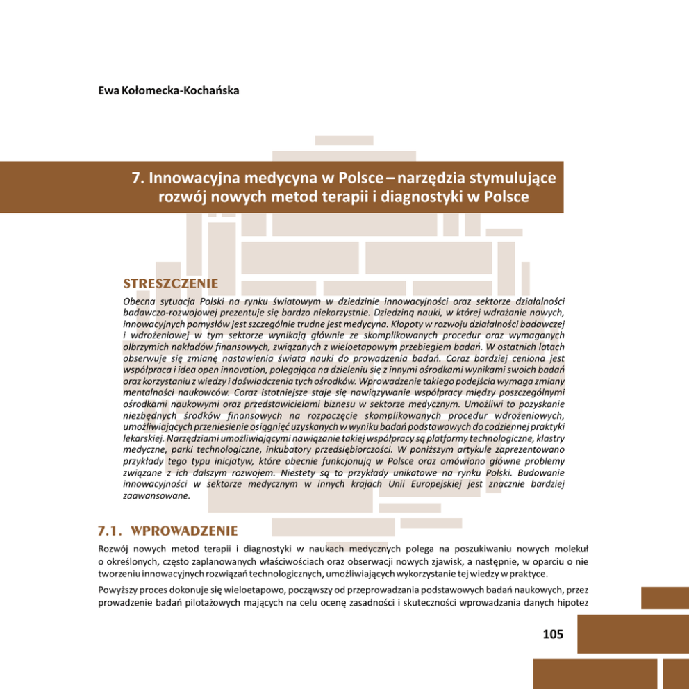 Ewa Ko³omecka-Kochañska 7. Innowacyjna medycyna w Polsce – narzêdzia stymuluj¹ce rozwój nowych metod terapii i diagnostyki w Polsce STRESZCZENIE Obecna sytuacja Polski na rynku œwiatowym w dziedzinie innowacyjnoœci oraz sektorze dzia³alnoœci badawczo-rozwojowej prezentuje siê bardzo niekorzystnie. Dziedzin¹ nauki, w której wdra¿anie nowych, innowacyjnych pomys³ów jest szczególnie trudne jest medycyna. K³opoty w rozwoju dzia³alnoœci badawczej i wdro¿eniowej w tym sektorze wynikaj¹ g³ównie ze skomplikowanych procedur oraz wymaganych olbrzymich nak³adów finansowych, zwi¹zanych z wieloetapowym przebiegiem badañ. W ostatnich latach obserwuje siê zmianê nastawienia œwiata nauki do prowadzenia badañ. Coraz bardziej ceniona jest wspó³praca i idea open innovation, polegaj¹ca na dzieleniu siê z innymi oœrodkami wynikami swoich badañ oraz korzystaniu z wiedzy i doœwiadczenia tych oœrodków. Wprowadzenie takiego podejœcia wymaga zmiany mentalnoœci naukowców. Coraz istotniejsze staje siê nawi¹zywanie wspó³pracy miêdzy poszczególnymi oœrodkami naukowymi oraz przedstawicielami biznesu w sektorze medycznym. Umo¿liwi to pozyskanie niezbêdnych œrodków finansowych na rozpoczêcie skomplikowanych procedur wdro¿eniowych, umo¿liwiaj¹cych przeniesienie osi¹gniêæ uzyskanych w wyniku badañ podstawowych do codziennej praktyki lekarskiej. Narzêdziami umo¿liwiaj¹cymi nawi¹zanie takiej wspó³pracy s¹ platformy technologiczne, klastry medyczne, parki technologiczne, inkubatory przedsiêbiorczoœci. W poni¿szym artykule zaprezentowano przyk³ady tego typu inicjatyw, które obecnie funkcjonuj¹ w Polsce oraz omówiono g³ówne problemy zwi¹zane z ich dalszym rozwojem. Niestety s¹ to przyk³ady unikatowe na rynku Polski. Budowanie innowacyjnoœci w sektorze medycznym w innych krajach Unii Europejskiej jest znacznie bardziej zaawansowane. 7.1. WPROWADZENIE Rozwój nowych metod terapii i diagnostyki w naukach medycznych polega na poszukiwaniu nowych moleku³ o okreœlonych, czêsto zaplanowanych w³aœciwoœciach oraz obserwacji nowych zjawisk, a nastêpnie, w oparciu o nie tworzeniu innowacyjnych rozwi¹zañ technologicznych, umo¿liwiaj¹cych wykorzystanie tej wiedzy w praktyce. Powy¿szy proces dokonuje siê wieloetapowo, pocz¹wszy od przeprowadzania podstawowych badañ naukowych, przez prowadzenie badañ pilota¿owych maj¹cych na celu ocenê zasadnoœci i skutecznoœci wprowadzania danych hipotez 105 do praktyki, koñcz¹c na wielooœrodkowych badaniach oceniaj¹cych bezpiecznoœæ i porównuj¹cych dan¹ metodê z powszechnie dostêpnymi. W podobny sposób przebiegaj¹ etapy wprowadzania nowych i niekiedy rewolucyjnych odkryæ w innych dziedzinach nauki. Wzrost gospodarczy i spo³eczny kraju jest œciœle powi¹zany ze stopniem rozwoju, poziomem dzia³alnoœci naukowobadawczej oraz mo¿liwoœciami wykorzystania tych osi¹gniêæ jako si³y napêdzaj¹cej gospodarkê. Dzia³alnoœæ badawczorozwojowa i wdro¿eniowa wymaga czêsto ogromnych nak³adów finansowych, co generuje szereg problemów i opóŸnieñ cywilizacyjnych. Rysunek 1. Wydatki na badania i rozwój (procent PKB) ród³o: Dokument (…) Komisji Europejskiej: Ocena Strategii Lizboñskiej http://ec.europa.eu/europe2020/pdf/lisbon_strategy_evaluation_pl.pdf 106 Odgórnie zaplanowane rozwi¹zania w zakresie budowania europejskiej gospodarki opartej o wiedzê nie przynios³y oczekiwanych rezultatów. Strategia Lizboñska przyjêta przez Uniê Europejsk¹ mia³a na celu przyspieszenie wzrostu gospodarczego miêdzy innymi dziêki zbli¿eniu sektorów nauki i gospodarki. Zak³ada³a ona wzrost nak³adów na dzia³alnoœæ badawczo-rozwojow¹ do 3% PKB oraz znaczn¹ redukcjê biurokracji i utrudnieñ dla przedsiêbiorców, co mia³o przyczyniæ siê do zwiêkszenia efektywnoœci inwestycji w wiedzê i rozwój innowacji we wszystkich obszarach ¿ycia spo³eczno-gospodarczego ( LISBONA AGENDA EUR ACTIV 2004). Jeœli uznaæ, ¿e miar¹ znaczenia innowacyjnoœci w rozwoju kraju s¹ wydatki na badania i rozwój, to Polska plasuje siê poni¿ej œredniej unijnej i zajmuje 20 pozycjê na 27 krajów Unii Europejskiej (KRAJOWY PROGRAM REFORM NA LATA 2008-2011 NA RZECZ REALIZACJI STRATEGII LIZBOÑSKIEJ). Tabela 1. Innowacyjnoœæ w krajach Unii Europejskiej ród³o: R. Wolniak, Innowacyjnoœæ w kontekœcie sytuacji gospodarki w krajach Unii Europejskiej, „Zeszyty Naukowe”, Akademia Morska w Szczecinie 2010, 24(96), s. 141-147. 107 Jeœli jednak uwzglêdniæ wartoœæ PKB przypadaj¹c¹ na mieszkañca kraju, Polska w 2010 r. plasuje siê na 24 miejscu wœród 27 pañstw nale¿¹cych do Unii Europejskiej (WOLNIAK 2010: S. 142-147). W œwiatowym rankingu konkurencyjnoœci gospodarki The Global Competitiveness Report 2011-2012, opracowanym przez World Economic Forum, Polska zajmuje 41 miejsce na 142 oceniane pañstwa. Po uzyskanym przez ostatnie lata awansie o 6 miejsc, w ci¹gu ostatniego roku Polska spad³a z 39 pozycji o 2 miejsca w dó³, pomimo pozytywnej oceny wszystkich podstawowych 12 filarów branych pod uwagê w raporcie. W sektorze dotycz¹cym innowacji i wspó³pracy nauki z biznesem Polska zajmuje dopiero 57 miejsce (THE GLOBAL COMPETITIVENESS REPORT 2011-2012). Dane te s¹ bardzo niepokoj¹ce i œwiadcz¹ o tym, ¿e Polska plasuje siê pod wzglêdem rozwoju innowacyjnoœci na szarym koñcu Unii Europejskiej. Obecnie szacuje siê, ¿e wydatki przeznaczone na dzia³alnoœæ badawczo-rozwojow¹ w krajach Unii Europejskiej wynosz¹ œrednio 2,2% PKB, podczas gdy w Polsce mniej ni¿ 1% PKB. Rysunek 2. ród³a finansowania nauki w wybranych krajach w roku 2010 ród³o: EUROSTAT. W programie finansowania nauki zak³ada siê, ¿e 1/3 wydatków na dzia³alnoœæ badawczo-rozwojow¹ powinna pochodziæ z bud¿etu pañstwa, pozosta³e 2/3 powinno byæ finansowane ze Ÿróde³ prywatnych. W Polsce proporcja ta jest 108 odwrócona. W latach 2007-2008 ponad 50% Ÿróde³ finansowania nauki pochodzi³o 