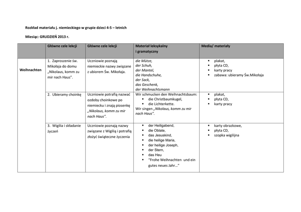 Rozkład materiału j. niemieckiego w grupie dzieci 4-5 – letnich Miesiąc: GRUDZIEŃ 2013 r. Weihnachten Główne cele lekcji Główne cele lekcji Materiał leksykalny i gramatyczny 1. Zaproszenie św. Mikołaja do domu „Nikolaus, komm zu mir nach Haus”. Uczniowie poznają niemieckie nazwy związane z ubiorem Św. Mikołaja. 2. Ubieramy choinkę Uczniowie potrafią nazwać ozdoby choinkowe po niemiecku i znają piosenkę „Nikolaus, komm zu mir nach Haus”. die Mütze, der Schuh, der Mantel, die Handschuhe, der Sack, das Geschenk, der Weihnachtsmann Wir schmucken den Weihnachtsbaum: die Christbaumkugel, die Lichterkette. Wir singen „Nikolaus, komm zu mir nach Haus”. 3. Wigilia i składanie życzeń Uczniowie poznają nazwy związane z Wigilią i potrafią złożyć świąteczne życzenia der Heiligabend, die Oblate, das Jesuskind, die heilige Maria, der heilige Joseph, der Stern, das Heu “Frohe Weihnachten und ein gutes neues Jahr…” Media/ materiały plakat, płyta CD, karty pracy zabawa: ubieramy Św.Mikołaja plakat, płyta CD, karty pracy karty obrazkowe, płyta CD, szopka wigilijna 4. Utrwalenie poznanych nazw - dzieci znają nazwy związane z Świętami Bożego Narodzenia; - dziecko śpiewa piosenkę przy wsparciu grupy i/albo CD 5. Pory roku – gr. II - dziecko zna i wymienia po niemiecku pory roku Zna dziecko na pamięć zwrot: „Nikolaus, komm zu mir nach Haus” płyta CD, karty obrazkowe, zabawa grupowa “Frohe Weihnachten und ein gutes neues Jahr…” Wie heissen die Jahreszeiten? der Frühling, der Sommer, der Winter, der Herbst, płyta CD, karty obrazkowe, zabawa grupowa