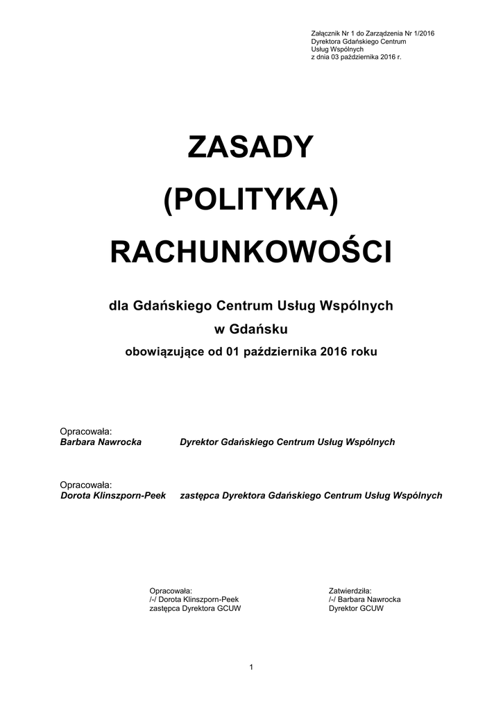 Załącznik Nr 1 do Zarządzenia Nr 1/2016 Dyrektora Gdańskiego Centrum Usług Wspólnych z dnia 03 października 2016 r. ZASADY (POLITYKA) RACHUNKOWOŚCI dla Gdańskiego Centrum Usług Wspólnych w Gdańsku obowiązujące od 01 października 2016 roku Opracowała: Barbara Nawrocka Dyrektor Gdańskiego Centrum Usług Wspólnych Opracowała: Dorota Klinszporn-Peek zastępca Dyrektora Gdańskiego Centrum Usług Wspólnych Opracowała: /-/ Dorota Klinszporn-Peek zastępca Dyrektora GCUW Zatwierdziła: /-/ Barbara Nawrocka Dyrektor GCUW 1 Załącznik Nr 1 do Zarządzenia Nr 1/2016 Dyrektora Gdańskiego Centrum Usług Wspólnych z dnia 03 października 2016 r. ZASADY PROWADZENIA KSIĄG RACHUNKOWYCH Ustalenia ogólne I. 1) Podstawa prawna: ustawa z dnia 29 września 1994 roku o rachunkowości (t.j. Dz. U. z 2013 r., poz. 330 ze zm.), zwana dalej ustawą o rachunkowości, ustawa z dnia 27 sierpnia 2009 r. o finansach publicznych (t.j. Dz. U. z 2013, poz. 885 ze zm.), zwana dalej ustawą o finansach publicznych, rozporządzenie Ministra Finansów z dnia 5 lipca 2010 roku w sprawie szczególnych zasad rachunkowości oraz planów kont dla budżetu państwa, budżetów jednostek samorządu terytorialnego, budżetowych, państwowych jednostek budżetowych, funduszy celowych samorządowych oraz państwowych zakładów jednostek budżetowych mających siedzibę poza granicami Rzeczpospolitej Polskiej (t.j. Dz. U. z 2013 r., poz.289), zwane dalej „rozporządzeniem”. 2) Użyte w zasadach (polityce) rachunkowości wyrażenia: „jednostka”, „kierownik jednostki”, „księgi rachunkowe”, „rok obrotowy”, „aktywa trwałe”, aktywa obrotowe”, „fundusze”, „zobowiązania krótkoterminowe” lub inne są zdefiniowane w art. 3 ust. 1 pkt. 1-48 ustawy o rachunkowości, działalność podstawowa oznacza działalność stanowiącą główny cel utworzenia jednostki i jest określona w statucie jednostki, działalność pomocnicza – działalność, której celem jest przede wszystkim świadczenie usług na potrzeby działalności podstawowej, w tym także zakładowa działalność socjalna. 3) Za wykonanie obowiązków w zakresie rachunkowości określonych ustawą odpowiada Kierownik jednostki (art.4 us.5 ustawy o rachunkowości), który korzystając z delegacji zawartej w art. 4 ust. 4 stawy o rachunkowości ustala, że nie ujmuje się w księgach rachunkowych rozliczeń międzyokresowych kosztów, jeżeli ich poziom jest nieistotny. Ustala się próg istotności na poziomie 0,5% sumy bilansowej. Nie ujmuje się biernych rozliczeń międzyokresowych kosztów wynikających z obowiązku wykonywania przyszłych świadczeń na rzecz pracowników, w tym świadczeń emerytalnych. 4) Na podstawie art. 54 ust. 1 ustawy o finansach publicznych Kierownik jednostki powierza Głównemu Księgowemu jednostki obowiązki i odpowiedzialność w zakresie: 2 Załącznik Nr 1 do Zarządzenia Nr 1/2016 Dyrektora Gdańskiego Centrum Usług Wspólnych z dnia 03 października 2016 r. a) prowadzenia rachunkowości jednostki, b) wykonywania dyspozycji środkami pieniężnymi, c) dokonywania wstępnej kontroli zgodności operacji gospodarczych i finansowych z planem finansowym, d) dokonywania wstępnej kontroli kompletności i rzetelności dokumentów dotyczących operacji gospodarczych i finansowych. II. Charakterystyka jednostki oraz miejsce prowadzenia ksiąg rachunkowych Gdańskie Centrum Usług Wspólnych w Gdańsku jest jednostką organizacyjną sektora finansów publicznych nieposiadającą osobowości prawnej, działającą w formie jednostki budżetowej. Jednostka działa na podstawie Uchwały Nr XXVIII/711/16 Rady Miasta Gdańska z dnia 25 sierpnia 2016r. w sprawie utworzenia jednostki budżetowej „Gdańskie Centrum Usług Wspólnych” poprzez połączenie Centrum Obsługi Placówek Oświatowych Nr 1 w Gdańsku i Zespołu Ekonomiczno Administracyjnego Szkół w Gdańsku oraz nadanie jej statutu. Podstawą działalności jednostki jest plan dochodów i wydatków. Za całość gospodarki finansowej odpowiada Kierownik jednostki, z wyjątkiem spraw powierzonych pracownikom, określonych w imiennych upoważnieniach lub w Regulaminie Organizacyjnym. Podstawowa (operacyjna) działalność jednostki obejmuje: - obsługę finansowo księgową jednostek oświatowych, - sporządzanie sprawozdawczości budżetowej, - prowadzenie ewidencji syntetycznej i analitycznej środków trwałych. Księgi rachunkowe jednostki prowadzone są w siedzibie jednostki pod adresem Gdańskie Centrum Usług Wspólnych, Al. Gen. J. Hallera 16/18, 80-426 Gdańsk przez pracowników służb finansowo – księgowych w zakresie opisanym w załączniku Nr 5 pkt. 1 i 2. Baza danych systemu finansowo – księgowego jednostki znajduje się na serwerze Gdańskiej Platformy Edukacyjnej zlokalizowanej w Gdańsku (80-172), przy ul. Trzy Lipy 3, administrowanym przez wyspecjalizowanych administratorów podlegających bezpośrednio Wydziałowi Rozwoju Społecznego. Księgi rachunkowe prowadzi się w języku polskim i walucie polskiej. III. Określenie roku obrotowego oraz okresów sprawozdawczych Rokiem obrotowym jest rok kalendarzowy od 1 stycznia do 31 grudnia pokrywający się z rokiem budżetowym. 3 Załącznik Nr 1 do Zarządzenia Nr 1/2016 Dyrektora Gdańskiego Centrum Usług Wspólnych z dnia 03 października 2016 r. Okresy sprawozdawcze obejmują miesiące, kwartały, półrocze i rok. Sprawozdania okresowe sporządza się według wzorów oraz w terminach określonych we właściwych przepisach. IV. Zakres i technika prowadzenia ksiąg rachunkowych 1) Księgi rachunkowe jednostki, począwszy od dnia 01.10.2016 r., prowadzone są przy zastosowaniu systemu finansowo – księgowego jednostki budżetowej (zwanym dalej systemem FK GPE) zaprojektowanego i wykonanego przez Konsorcjum trzech firm: Young Digital Planet S.A (lider Konsorcjum), Zakład Usług Informatycznych OTAGO Sp. z o.o., VULCAN Sp. z o.o. zgodnie z umową nr BZL-271-041/W