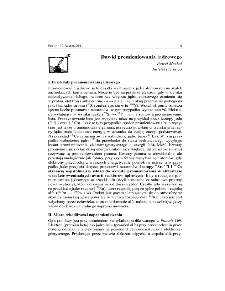 FOTON 112, Wiosna 2011 9 Dawki promieniowania jądrowego Paweł Moskal Instytut Fizyki UJ I. Przykłady promieniowania jądrowego Promieniowanie jądrowe są to cząstki wylatujące z jąder atomowych na skutek zachodzących tam przemian. Może to być na przykład elektron, gdy w wyniku oddziaływania słabego, neutron we wnętrzu jądra atomowego zamienia się w proton, elektron i antyneutrino (n → p + e + ν). Takiej przemianie podlega na przykład jądro strontu (90Sr) zmieniając się w itr (90Y). Wskaźnik górny oznacza łączną liczbę protonów i neutronów, w tym przypadku wynosi ona 90. Elektrony wylatujące w wyniku reakcji 90Sr → 90Y + e + ν stanowią promieniowanie beta. Promieniowanie beta jest wysyłane także na przykład przez izotopy jodu (131I) i cezu (137Cs). Lecz w tym przypadku oprócz promieniowania beta wysyłane jest także promieniowanie gamma, ponieważ powstałe w wyniku przemiany jądra mają dodatkową energię w stosunku do swojej energii podstawowej. Na przykład 137Cs zamienia się na wzbudzone jądro baru (137Ba). W tym przypadku wzbudzone jądro 137Ba przechodzi do stanu podstawowego wysyłając kwant promieniowania elektromagnetycznego o energii 0,66 MeV. Kwanty promieniowania o tak dużej energii (milion razy większej od kwantów światła) nazywane są promieniowaniem gamma. Kwanty gamma są niewidzialne, ale powstają analogicznie jak fotony, przy czym fotony wysyłane są z atomów, gdy elektrony przechodzą z wyższych energetycznie powłok na niższe, a w przypadku jąder przejścia dotyczą protonów i neutronów. Izotopy 90Sr, 131I i 137Cs stanowią najistotniejszy wkład do wzrostu promieniowania w atmosferze w trakcie ewentualnych awarii reaktorów jądrowych. Innym rodzajem promieniowania jądrowego są cząstki alfa (czyli połączone ze sobą dwa protony i dwa neutrony), które odrywają się od dużych jąder. Cząstki alfa wysyłane są na przykład z jąder radonu (222Rn), które rozpadają się na jądro polonu i cząstkę alfa (222Rn → 218Po + α). Radon jest gazem ulatniającym się do atmosfery ze skorupy ziemskiej gdzie powstaje w wyniku rozpadu radu 226Ra. Jako gaz jest wdychany przez człowieka, a promieniowanie alfa radonu stanowi największy wkład do dawek naturalnego napromieniowania. II. Miara szkodliwości napromieniowania Opis poniższy jest przypomnieniem z artykułu opublikowanego w Fotonie 109. Elektron (promień beta) lub jądro helu (promień alfa) przy przechodzeniu przez materię oddziałuje z elektronami za pośrednictwem oddziaływania elektromagnetycznego. Przelatując przez materię elektron odpycha, a cząstka alfa przy- 10 FOTON 112, Wiosna 2011 ciąga do siebie elektrony związane w atomach naświetlanej substancji. W obu przypadkach w wyniku tego oddziaływania elektrony materii przeskakują na wyższe powłoki energetyczne lub są całkowicie odrywane od atomów. W sumie promień beta lub cząstka alfa o energii około 1 MeV może uwolnić kilkadziesiąt tysięcy elektronów. Pośrednio podobne skutki wywołuje promieniowanie gamma. Kwant gamma wpadając do wnętrza materii przekazuje jednemu z elektronów całość lub część swojej energii, a następnie wybity elektron oddziałuje z materią jak promień beta. Zatem miarą napromieniowania może być liczba zjonizowanych atomów lub też energia zdeponowana w materiale. Energię zdeponowaną na jednostkę masy nazywa się dawką pochłoniętą, a jej jednostką jest Gy (grej), gdzie Gy = J/kg. W organizmach żywych skutki biologiczne napromieniowania zależą nie tylko od zdeponowanej energii, ale także od tego, czy dana energia została zużyta na zjonizowanie małej czy dużej liczby komórek. Ponieważ takie same sumaryczne zniszczenia atomów rozłożone na większą liczbę komórek dają większe szanse, iż komórki się zregenerują lub też, że zmiany będą nieistotne z punktu widzenia ich funkcjonowania. Pod tym względem promieniowanie gamma i beta wywołują takie same skutki biologiczne, a są one znacznie mniejsze niż skutki wywołane przez promieniowanie alfa. Energia cząstek alfa i elektronów wysyłanych w przemianach jądrowych jest rzędu MeV. Cząstki alfa mają około 8000 razy większą masę i dwa razy większy ładunek niż elektrony i dlatego poruszają się znacznie wolniej i szybciej wytracają energię wyhamowując na drodze rzędu kilkudziesięciu mikrometrów (czyli średnio tylko w kilku komórkach). Natomiast cząstki beta o podobnej energii przebywają w organizmie drogę średnio kilku milimetrów, czyli wywołują jonizację w około 100 razy większej liczbie komórek, ale za to jonizacja w każdej z komórek jest około 100 razy mniejsza niż przy przejściu cząstki alfa. Dlatego jeśli chodzi o skutki biologiczne lepszą miarą napromieniowania jest dawka równoważna, którą otrzymuje się poprzez przemnożenie dawki pochłoniętej przez odpowiedni współczynnik szkodliwości charakteryzujący rodzaj promieniowania. Okazuje się, że szkody biologiczne powodowane przez cząstki alfa są dwadzieścia razy większe niż przez cząstki beta czy kwanty gamma. Dlatego współczynnik ten wynosi 1 dla promieniowania beta i gamma oraz 20 dla promieniowania alfa. Choć fizyczną jednostką dawki równoważnej jest J/kg, tak samo jak dawki pochłoniętej, to dla odróżnienia charakteru biologicznego dawki równoważnej jej jednostką nie jest Gy lecz Sv (siwert). Nazwa pochodzi od nazwiska pioniera ochrony radiologicznej dr. Rolfa Sieverta. Molekuły istotne dla życia komórek mogą być uszkadzane zarówno na skutek bezpośredniego zrywania wiązań pomiędzy stanowiącymi je atomami jak również na skutek jonizacji molekuł z otoczenia, z którymi następnie wchodzą w reakcje chemiczne. Na przykład molekuły DNA mogą ulegać utlenieniu rodnikami OH, które powstają w ciągu reakcji chemicznych w wy- FOTON 112, Wiosna 2011 11 niku jonizacji cząsteczek wody. W ogólności im większe molekuły tym w