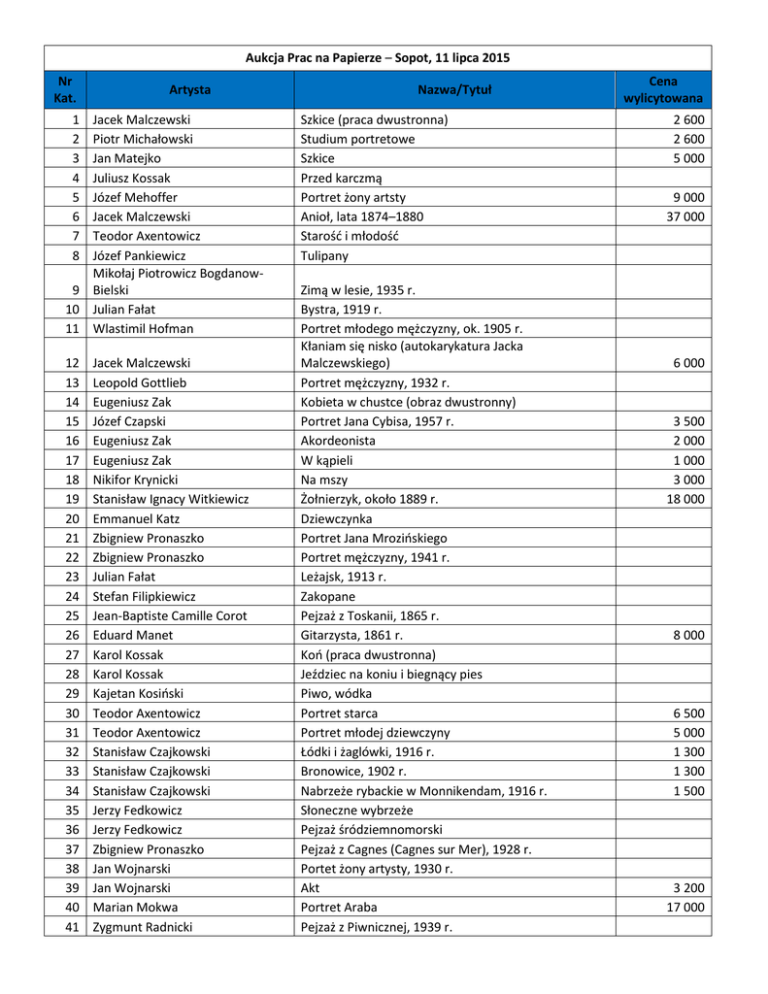 Aukcja Prac na Papierze – Sopot, 11 lipca 2015 Nr Kat. Artysta 1 2 3 4 5 6 7 8 Jacek Malczewski Piotr Michałowski Jan Matejko Juliusz Kossak Józef Mehoffer Jacek Malczewski Teodor Axentowicz Józef Pankiewicz Mikołaj Piotrowicz Bogdanow9 Bielski 10 Julian Fałat 11 Wlastimil Hofman 12 13 14 15 16 17 18 19 20 21 22 23 24 25 26 27 28 29 30 31 32 33 34 35 36 37 38 39 40 41 Jacek Malczewski Leopold Gottlieb Eugeniusz Zak Józef Czapski Eugeniusz Zak Eugeniusz Zak Nikifor Krynicki Stanisław Ignacy Witkiewicz Emmanuel Katz Zbigniew Pronaszko Zbigniew Pronaszko Julian Fałat Stefan Filipkiewicz Jean-Baptiste Camille Corot Eduard Manet Karol Kossak Karol Kossak Kajetan Kosiński Teodor Axentowicz Teodor Axentowicz Stanisław Czajkowski Stanisław Czajkowski Stanisław Czajkowski Jerzy Fedkowicz Jerzy Fedkowicz Zbigniew Pronaszko Jan Wojnarski Jan Wojnarski Marian Mokwa Zygmunt Radnicki Nazwa/Tytuł Szkice (praca dwustronna) Studium portretowe Szkice Przed karczmą Portret żony artsty Anioł, lata 1874–1880 Starość i młodość Tulipany Zimą w lesie, 1935 r. Bystra, 1919 r. Portret młodego mężczyzny, ok. 1905 r. Kłaniam się nisko (autokarykatura Jacka Malczewskiego) Portret mężczyzny, 1932 r. Kobieta w chustce (obraz dwustronny) Portret Jana Cybisa, 1957 r. Akordeonista W kąpieli Na mszy Żołnierzyk, około 1889 r. Dziewczynka Portret Jana Mrozińskiego Portret mężczyzny, 1941 r. Leżajsk, 1913 r. Zakopane Pejzaż z Toskanii, 1865 r. Gitarzysta, 1861 r. Koń (praca dwustronna) Jeździec na koniu i biegnący pies Piwo, wódka Portret starca Portret młodej dziewczyny Łódki i żaglówki, 1916 r. Bronowice, 1902 r. Nabrzeże rybackie w Monnikendam, 1916 r. Słoneczne wybrzeże Pejzaż śródziemnomorski Pejzaż z Cagnes (Cagnes sur Mer), 1928 r. Portet żony artysty, 1930 r. Akt Portret Araba Pejzaż z Piwnicznej, 1939 r. Cena wylicytowana 2 600 2 600 5 000 9 000 37 000 6 000 3 500 2 000 1 000 3 000 18 000 8 000 6 500 5 000 1 300 1 300 1 500 3 200 17 000 42 43 44 45 46 47 48 49 50 51 52 53 54 55 56 57 58 59 60 61 62 63 64 Stanisław Masłowski Hanna Rudzka Cybisowa Jan Cybis Wojciech Weiss Alfons Karpiński Wojciech Weiss Jan Kanty Gumowski Antoni Suchanek Henryk Michał Policht A. Minotto Jan Rubczak Jan Cybis Wojciech Weiss Władysław Serafin Władysław Serafin Franciszek Turek Stanisław Fabijański Stanisław Chlebowski Stanisław Chlebowski Henryk Uziembło Janusz Benedyktowicz Janusz Benedyktowicz Antoni Uniechowski Autoportret artysty na tle sadu Żoliborskiego, 1920 r. Krzemieniec – Góra królowej Bony Stary Sącz, 1957 r. Przy stole Sen, 1902 r. Hanusia w kalwarii, 1921 r. Jasna Góra, 1926 r. Szczecin, 1946 r. Widok Krakowa, 1947 r. Widok Wenecji Port w Nicei Na plaży Na plaży w Nicei I, 1925 r. Brama Mostowa w Toruniu Ratusz w Toruniu Ulica Floriańska w Krakowiem, około 1920 r. Wieże Kościoła Mariackiego Żuraw w Gdańsku Zbrojownia w Gdańsku Barbakan w Krakowie Kościół Mariacki w Krakowie Wawel. Kurza Stopka, 1948 r. Zamek Królewski w Warszawie 65 Antoni Uniechowski 66 Antoni Suchanek Zamek Królewski w Warszawie od strony Arkad Kubickiego Teka Gdańsk, 1957 r. 67 Francois Stroobant Wchód do Biblioteki Jagiellońskiej z albumu Starożytne gmachy Krakowa, 1862 r. 68 Francois Stroobant Sarcophagus casimiri magni Regis z albumu Katedra krakowska na Wawelu, 1859 r. 69 Francois Stroobant 70 Józef Mehoffer Sarcophagus Vladislai Jagellonis Regis In Sagello s. Crucis z al. Katedra kr. na Wawelu,1859 r. Okładka albumu Sztuka Polska Malarstwo z 1903 r. 71 72 73 74 75 76 77 78 79 80 81 82 Chrystus na krzyżu w adoracji świętych i królów polskich na tle kościoła Mariackiego i Wawelu Bukiet kwiatów w wazonie Bzy Para w strojach ludowych Dziewczyna w stroju ludowym Żniwiarz w stroju krakowskim W polu Posłowie przed królem Kłótnia Postać kobiety Postać Żyda Podhorce (portal), 1889 r. Leon Wyczółkowski Stanisław Chlebowski Teodor Grott Stanisław Czajkowski Zofia Stryjeńska Zofia Stryjeńska Maja Berezowska Maja Berezowska Maja Berezowska Tadeusz Popiel Tadeusz Popiel Tadeusz Popiel 3 400 500 1 700 1 400 4 000 2 800 900 1 900 350 250 11 000 500 2 500 5 000 1 700 1 700 4 500 1 500 1 500 83 84 85 86 87 88 89 90 91 92 93 94 95 96 97 98 99 100 101 102 103 104 105 106 107 108 109 110 111 112 113 114 115 116 117 118 119 120 121 122 123 124 125 126 Ludomir Rusiecki Karol Stobiecki Karol Mondral Barbara Narębska-Dębska Jerzy Hoppen Józef Rapacki Nikifor Krynicki Nikifor Krynicki Tadeusz Kleczyński Zygmunt Wierciak Józef Czapski Józef Czapski Jan Cybis Antoni Suchanek Janina Nowotnowa Alfons Karpiński Jan Mroziński Jan Hrynkowski Eustachy Wasilkowski Artysta nieokreślony Przy drodze, 1871 r. Wymarsz wojsk z Belwederu Głowa rybaka Drzewo, 1950 r. Si vis pacem, para bellum, 1942 r. Z szopką Mężczyzna Biskup Karykatura z marszałkiem Piłsudskim, 1933 r. Studia żołnierzy austriackich, 1848 r. Chmury Pejzaż z kościołem Instrumenty muzyczne, przed 1939 r. Portret młodej dziewczyny, lata 1946–1958 Martwa natura Kotek Portret damy Fragment parku w Poznaniu Chłopiec, 1939 r. Portret Czesława Miłosza, 1945 r. Portret kobiety, 1953 r. Karol Frycz E. Kalinowski J.K. Kamiński Karol Kossak Nikolai Semenowicz Samokish Zenon Aniszewski Malarz nieokreślony Antoni Suchanek Tymon Niesiołowski Tymon Niesiołowski Stanisław Grabowski Stanisław Eleszkiewicz Władysław Żurawski Jerzy Potrzebowski Zenon Aniszewski Zdzisław Kałędkiewicz Janusz Benedyktowicz Tadeusz Piotr Potworowski Wacław Taranczewski Stanisław Teisseyre Stanisław Teisseyre Bogdan Przybyliński Bogdan Przybyliński Felicja Rutkowska, Bronisława Jeremi w sztuce „Siostry bliźnie” oraz Helena Sulima w roli Maud w sztuce „Półdziewica”, z Teki Melpomeny, 1904 r. Portret młodego Żyda, 1905 r. Pejzaż zimowy Baśń o czarownicy, 1938 r. Atak Zimą , 2002 r. Łodzie Morze Głowa kobieca, 1949 r. Akt Główka kobiety Jeździec Wyścigi konne, 1955 r. Koń, 1949 r.