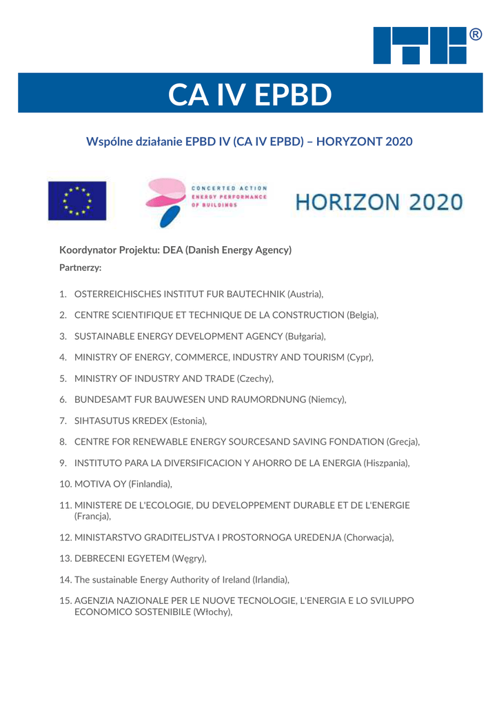 ® CA IV EPBD Wspólne działanie EPBD IV (CA IV EPBD) – HORYZONT 2020 Koordynator Projektu: DEA (Danish Energy Agency) Partnerzy: 1. OSTERREICHISCHES INSTITUT FUR BAUTECHNIK (Austria), 2. CENTRE SCIENTIFIQUE ET TECHNIQUE DE LA CONSTRUCTION (Belgia), 3. SUSTAINABLE ENERGY DEVELOPMENT AGENCY (Bułgaria), 4. MINISTRY OF ENERGY, COMMERCE, INDUSTRY AND TOURISM (Cypr), 5. MINISTRY OF INDUSTRY AND TRADE (Czechy), 6. BUNDESAMT FUR BAUWESEN UND RAUMORDNUNG (Niemcy), 7. SIHTASUTUS KREDEX (Estonia), 8. CENTRE FOR RENEWABLE ENERGY SOURCESAND SAVING FONDATION (Grecja), 9. INSTITUTO PARA LA DIVERSIFICACION Y AHORRO DE LA ENERGIA (Hiszpania), 10. MOTIVA OY (Finlandia), 11. MINISTERE DE L'ECOLOGIE, DU DEVELOPPEMENT DURABLE ET DE L'ENERGIE (Francja), 12. MINISTARSTVO GRADITELJSTVA I PROSTORNOGA UREDENJA (Chorwacja), 13. DEBRECENI EGYETEM (Węgry), 14. The sustainable Energy Authority of Ireland (Irlandia), 15. AGENZIA NAZIONALE PER LE NUOVE TECNOLOGIE, L'ENERGIA E LO SVILUPPO ECONOMICO SOSTENIBILE (Włochy), 16. STATYBOS PRODUKCIJOS SERTIFIKAVIMO CENTRAS (Litwa), 17. MINISTERE DE L'ECONOMIE ET DU COMMERCE EXTERIEUR (Luxemburg), 18. EKONOMIKAS MINISTRIJA (Łotwa), 19. MINISTRY FOR TRANSPORT AND INFRASTRUCTURE (Malta), 20. MINISTERIE VAN ECONOMISCHE ZAKEN (Holandia), 21. NORGES VASSDRAGS- OG ENERGIDIREKTORAT (Norwegia), 22. INSTYTUT TECHNIKI BUDOWLANEJ (Polska), 23. ADENE - AGENCIA PARA A ENERGIA (Portugalia), 24. MINISTERUL DEZVOLTARII REGIONALE SI ADMINISTRATIEI PUBLICE (Rumunia), 25. BOVERKET (Szwecja), 26. TECHNICKY A SKUSOBNY USTAV STAVEBNY n.o. (Słowacja), 27. GRADBENI INSTITUT ZRMK DOO (Słowenia), 28. BUILDING RESEARCH ESTABLISHMENT LTD (Wielka Brytania) ITB w projekcie CA IV EPBD pełni rolę krajowego koordynatora po stronie polskiej. Okres realizacji całego Projektu: 01.10.2015 r.– 31.03.2018 r. Całkowita wartość Projektu: 3 000 000 EUR Ogólny planowany budżet Projektu dla ITB – 23 903,- EUR (maksymalne dofinansowanie Unii Europejskiej wyniesie 100%). Tytuł Projektu: Wspólne działanie EPBD IV (CA IV EPBD) Cele projektu: • dzielenie się wiedzą, doświadczeniem z wdrażania Dyrektywy EPBD w różnych państwach oraz promowanie dobrych praktyk związanych z wdrożeniem przekształconej Dyrektywy EPBD w Państwach Członkowskich. • stworzenie optymalnych warunków do szybszego osiągnięcia zgodności procedur krajowych z wytycznymi EPBD. • wsparcie oraz możliwe utworzenie grup w CEN w celu stworzenia standardów wsparcia wdrożenia przekształconej Dyrektywy EPBD. Opis projektu: Ww. projekt jest kontynuacją projektów CA EPBD (styczeń 2005 – czerwiec 2007), CA EPBD II (grudzień 2007 – listopad 2010) oraz CA EPBD III (marzec 2011 – październik 2015). Projekt realizowany jest w ramach Programu HORYZONT 2020. Prace będą organizowane w zespołach: • 3 podstawowe zespoły dotyczące: nowych budynków, istniejących budynków oraz Certyfikacji i Jakości; • 3 przekrojowe zespoły dotyczące: elementów technicznych, polityki i wdrażania, przestrzegania postanowień i skutków wprowadzenia nowelizacji Dyrektywy EPBD; • 2 zespoły dotyczące współpracy z innymi podmiotami. W trakcie trwania projektu CA IV EPBD przewidziane są też inne działania wspierające tematykę efektywności energetycznej, jak np. współpraca z innymi projektami typu „ wspólne działanie” – CA-RES i CA-EED. Problemy, w których Dyrektywa nie wymaga zharmonizowanej krajowej implementacji, ale gdzie zharmonizowane, skoordynowane wdrożenie zwiększy wpływ Dyrektywy i zmniejszy koszty wykonawcze, są zakresem działań dla każdego z zespołów podstawowych. Rezultaty projektu: Przygotowanie przez ITB Krajowego Raportu z wdrożenia wytycznych Dyrektywy EPBD. Strona www projektu: http://www.epbd-ca.org „Projekt finansowany ze środków programu ramowego Unii Europejskiej w zakresie badań naukowych i innowacji „Horyzont 2020” na podstawie umowy o udzielenie dotacji nr 692447”. WWW.ITB.PL