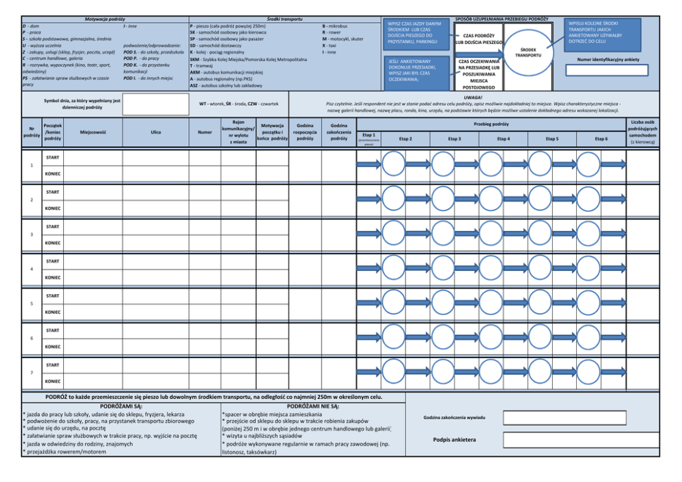 Motywacja podróży D - dom I - inne P - praca .................................................. S - szkoła podstawowa, gimnazjalna, średnia ...................... U - wyższa uczelnia podwożenie/odprowadzanie: Z - zakupy, usługi (sklep, fryzjer, poczta, urząd) POD S. - do szkoły, przedszkola C - centrum handlowe, galeria POD P. - do pracy R - rozrywka, wypoczynek (kino, teatr, sport, POD K. - do przystanku odwiedziny) komunikacji PS - załatwianie spraw służbowych w czasie POD I. - do innych miejsc pracy Środki transportu SKM - Szybka Kolej Miejska/Pomorska Kolej Metropolitalna T - tramwaj AKM - autobus komunikacji miejskiej A - autobus regionalny (np.PKS) ASZ - autobus szkolny lub zakładowy Symbol dnia, za który wypełniany jest dzienniczej podróży Nr podróży Początek /koniec podróży Miejscowość B - mikrobus R - rower M - motocykl, skuter X - taxi I - inne P - pieszo (cała podróż powyżej 250m) SK - samochód osobowy jako kierowca SP - samochód osobowy jako pasażer SD - samochód dostawczy K - kolej - pociąg regionalny Numer Rejon Motywacja komunikacyjny/ początku i nr wylotu końca podróży z miasta SPOSÓB UZUPEŁNIANIA PRZEBIEGU PODRÓŻY CZAS PODRÓŻY LUB DOJŚCIA PIESZEGO ŚRODEK TRANSPORTU JEŚLI ANKIETOWANY DOKONUJE PRZESIADKI, WPISZ JAKI BYŁ CZAS OCZEKIWANIA; Numer identyfikacyjny ankiety CZAS OCZEKIWANIA NA PRZESIADKĘ LUB POSZUKIWANIA MIEJSCA POSTOJOWEGO Godzina rozpoczęcia podróży Godzina zakończenia podróży Przebieg podróży Etap 1 (przemieszczenie piesze) Etap 2 Etap 3 START 1 KONIEC START 2 KONIEC START 3 KONIEC START 4 KONIEC START 5 KONIEC START 6 KONIEC START 7 KONIEC PODRÓŻ to każde przemieszczenie się pieszo lub dowolnym środkiem transportu, na odległość co najmniej 250m w określonym celu. PODRÓŻAMI SĄ: * jazda do pracy lub szkoły, udanie się do sklepu, fryzjera, lekarza * podwożenie do szkoły, pracy, na przystanek transportu zbiorowego * udanie się do urzędu, na pocztę * załatwianie spraw służbowych w trakcie pracy, np. wyjście na pocztę * jazda w odwiedziny do rodziny, znajomych * przejażdżka rowerem/motorem WPISUJ KOLEJNE ŚRODKI TRANSPORTU JAKICH ANKIETOWANY UŻYWAŁBY DOTRZEĆ DO CELU UWAGA! Pisz czytelnie. Jeśli respondent nie jest w stanie podać adresu celu podróży, opisz możliwie najdokładniej to miejsce. Wpisz charakterystyczne miejsca nazwę galerii handlowej, nazwę placu, ronda, kina, urzędu, na podstawie których będzie możliwe ustalenie dokładnego adresu wskazanej lokalizacji. WT - wtorek, ŚR - środa, CZW - czwartek Ulica WPISZ CZAS JAZDY DANYM ŚRODKIEM LUB CZAS DOJŚCIA PIESZEGO DO PRZYSTANKU, PARKINGU PODRÓŻAMI NIE SĄ: *spacer w obrębie miejsca zamieszkania * przejście od sklepu do sklepu w trakcie robienia zakupów (poniżej 250 m i w obrębie jednego centrum handlowego lub galerii) * wizyta u najbliższych sąsiadów * podróże wykonywane regularnie w ramach pracy zawodowej (np. listonosz, taksówkarz) Godzina zakończenia wywiadu Podpis ankietera Etap 4 Etap 5 Etap 6 Liczba osób podróżujących samochodem (z kierowcą)