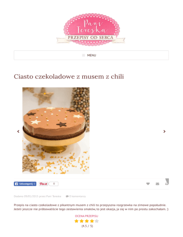 MENU Ciasto czekoladowe z musem z chili Udostępnij 0 0 Dodano 09/01/2015 przez Pani Tereska 0 komentarzy dp Przepis na ciasto czekoladowe z pikantnym musem z chili to przepyszna rozgrzewka na zimowe popołudnie. Jeżeli jeszcze nie próbowaliście tego zestawienia smaków, to jest okazja, ja się w nim po prostu zakochałam. :) OCENA PRZEPISU (4.5 / 5) (2 ocena/y) SKŁADNIKI - 200 g masła - 1 opakowanie Ciasta czekoladowego XXL Dr. Oetkera - 4 jajka - 100 ml wody - 200 g czekolady mlecznej - 500 ml mleka - 1 opakowanie Żelatyny- x deserowej Dr. Oetkera - 1/2 łyżeczki chili w proszku - 1 opakowanie Gwiazdek z czekolady deserowej i białej Dr. Oetkera - 1 opakowanie Perełek złotych Dr. Oetkera - 1 opakowanie Białych gwiazdek – mixu dekoracji Dr. Oetkera SPOSÓB PRZYGOTOWANIA 1. Tortownicę o średnicy 24 cm wyłożyłam papierem do pieczenia. Piekarnik nagrzałam do 180°C. 2. Masło rozpuściłam w garnuszku i odstawiłam do ostudzenia. Zawartość opakowania ciasta wsypałam do miski, dodałam jajka, wodę, rozpuszczone masło i wszystko razem miksowałam przez 5 minut. Całość przełożyłam do tortownicy i piekłam przez 60 minut do tzw. "suchego patyczka". Po tym czasie wyjęłam ciasto z formy i odstawiłam przestudzenia. 3. Kiedy ciasto wystygło, zabrałam się za przygotowanie czekoladowego musu. Zagotowałam mleko w garnuszku, zdjęłam z ognia i rozpuściłam w nim czekoladę, chili w proszku, a następnie przestudziłam je w zimnej kąpieli wodnej. Do osobnej miski wlałam 50 ml zimnej wody i 100 ml wrzątku, wsypałam żelatynę i zmiksowałam. Do schłodzonego mleka z czekoladą dodawałam stopniowo rozpuszczoną żelatynę, cały czas mieszając. Mus wstawiłam do lodówki i dosłownie co kilka minut mieszałam, by równomiernie zaczęło tężeć. 4. Gotowe ciasto ponownie umieściłam w tortownicy, uprzednio wykładając obręcz papierem do pieczenia. Papier musi ściśle przylegać do ciasta, dlatego wolną przestrzeń pomiędzy blaszką, a papierem uzupełniłam papierowym ręcznikiem. Gęstniejący mus wylałam na ciasto i włożyłam do lodówki na 2 godziny. Przed podaniem wierzch udekorowałam gwiazdami z czekolady i perełkami. Kategorie: Boże Narodzenie, Ciasta czekoladowe, Ciasta i ciastka z kremem, Torty Tagi: chili, czekolada, żelatyna OCEŃ TEN PRZEPIS Średnia ocena 2 fanów oceniało ten przepis. Nie ma jeszcze komentarzy. DODAJ KOMENTARZ Komentarz Imię Email Dodaj komentarz ZOBACZ PODOBNE PRZEPISY (4.5 / 5) Kostka ananasowo-kokosowa Przekładaniec tof Czekoladowy torcik z rodzynkami w rumie Ciasto czekoladowe z malinami i kremem czekoladowym Walentynkowe blondies Pączki z kremem mleczno-karmelowym POPULARNE PRZEPISY Pączki klasyczne Ciasto Filadel a Sernik z rosą TAGI agrest, alkohol, ananas, bakalie, banany, biała czekolada, białka wykorzystanie, biszkopty, brzoskwinie, budyń, chałwa, chili, cynamon, cytryny, czarne porzeczki, czekolada, czereśnie, czerwone porzeczki, daktyle, drożdże, dynia, dżem/kon tura, gi, frużelina, galaretka, goździki, granat, gruszki, herbatniki/ciasteczka, imbir, jabłka, jagody/borówki amerykańskie, jeżyny, jogurt, kakao, kardamon, kawa, ke r/maślanka, kisiel, kiwi, kleik ryżowy, krakersy, krem budyniowy, kwaśna śmietana, laska cynamonu, laska wanilii, majonez, mak, maliny, mango, marcepan, marchewka, masa krówkowa, mascarpone, masło orzechowe, migdały, miód, mięta, mleczko kokosowe, mleko skondesowane, mleko w proszku, morele, mąka krupczatka, mąka orkiszowa, mąka pełnoziarnista, mąka ziemniaczana, mąka żytnia, nutella, orzechy laskowe, orzechy włoskie, orzeszki ziemne, pierniczki, pigwa, pomarańcze/mandarynki, porzeczki, przyprawa korzenna, płatki owsiane, rabarbar, ricotta, rodzynki, serek homogenizowany, serek kremowy, sezam, smalec, szpinak, słonecznik, truskawki, twaróg, winogrona, wiórki kokosowe, wiśnie, śliwki, śmietanka kremówka, żelatyna, żelatyna w listkach, żurawina, żółtka wykorzystanie PANI TERESKA Mam na imię Teresa, mieszkam w Trójmieście i od przeszło trzydziestu lat pracuję w rmie Dr. Oetker w Gdańsku. Moje życie, zarówno zawodowe jak i prywatne, kręci się wokół pieczenia i gotowania, dlatego założyłam ten blog. Daje mi on możliwość dzielenia się z Wami moją pasją i jej efektami czyli moimi przepisami kulinarnymi. e-mail : [email protected] Pani Tereska Like Page 80K likes Be the first of your friends to like this © 2017 Pani Tereska - Przepisy od serca. All Rights Reserved.
