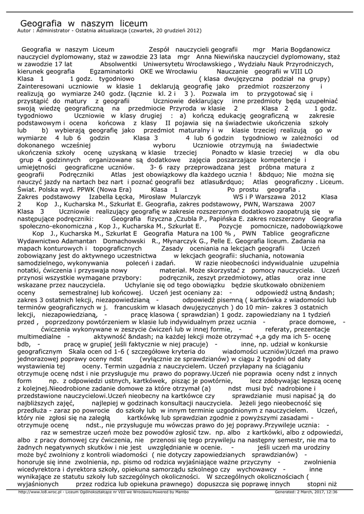 Geografia w naszym liceum Autor : Administrator - Ostatnia aktualizacja (czwartek, 20 grudzień 2012) Geografia w naszym Liceum Zespół nauczycieli geografii mgr Maria Bogdanowicz nauczyciel dyplomowany, staż w zawodzie 23 lata mgr Anna Niewińska nauczyciel dyplomowany, staż w zawodzie 17 lat Absolwentki Uniwersytetu Wrocławskiego , Wydziału Nauk Przyrodniczych, kierunek geografia Egzaminatorki OKE we Wrocławiu Nauczanie geografii w VIII LO Klasa 1 1 godz. tygodniowo ( klasa dwujęzyczna podział na grupy) Zainteresowani uczniowie w klasie 1 deklarują geografię jako przedmiot rozszerzony i realizują go wymiarze 240 godz. (łącznie kl. 2 i 3 ). Pozwala im to przygotować się i przystąpić do matury z geografii Uczniowie deklarujący inne przedmioty będą uzupełniać swoją wiedzę geograficzną na przedmiocie Przyroda w klasie 2 Klasa 2 1 godz. tygodniowo Uczniowie w klasy drugiej : a) kończą edukację geograficzną w zakresie podstawowym i ocena końcowa z klasy II pojawia się na świadectwie ukończenia szkoły lub b) wybierają geografię jako przedmiot maturalny i w klasie trzeciej realizują go w wymiarze 4 lub 6 godzin Klasa 3 4 lub 6 godzin tygodniowo w zależności od dokonanego wcześniej wyboru Uczniowie otrzymują na świadectwie ukończenia szkoły ocenę uzyskaną w klasie trzeciej Ponadto w klasie trzeciej w dla obu grup 4 godzinnych organizowane są dodatkowe zajęcia poszarzające kompetencje i umiejętności geograficzne uczniów. 3- 6 razy przeprowadzana jest próbna matura z geografii Podręczniki Atlas jest obowiązkowy dla każdego ucznia ! „ Nie można się nauczyć jazdy na nartach bez nart i poznać geografii bez atlasu” Atlas geograficzny . Liceum. Świat. Polska wyd. PPWK (Nowa Era) Klasa 1 Po prostu geografia . Zakres podstawowy Izabella Łęcka, Mirosław Mularczyk WS i P Warszawa 2012 Klasa 2 Kop J., Kucharska M., Szkurłat E. Geografia, zakres podstawowy, PWN, Warszawa 2007 Klasa 3 Uczniowie realizujący geografię w zakresie rozszerzonym dodatkowo zaopatrują się w następujące podręczniki: Geografia fizyczna ,Czubla P., Papińska E. zakres rozszerzony Geografia społeczno-ekonomiczna , Kop J., Kucharska M., Szkurłat E. Pozycje pomocnicze, nadobowiązkowe Kop J., Kucharska M., Szkurłat E Geografia Matura na 100 % , PWN Tablice geograficzne Wydawnictwo Adamantan Domachowski R., Młynarczyk G., Pelle E. Geografia liceum. Zadania na mapach konturowych i topograficznych Zasady oceniania na lekcjach geografii Uczeń zobowiązany jest do aktywnego uczestnictwa w lekcjach geografii: słuchania, notowania samodzielnego, wykonywania poleceń i zadań. W razie nieobecności indywidualnie uzupełnia notatki, ćwiczenia i przyswaja nowy materiał. Może skorzystać z pomocy nauczyciela. Uczeń przynosi wszystkie wymagane przybory: podręcznik, zeszyt przedmiotowy, atlas oraz inne wskazane przez nauczyciela. Uchylanie się od tego obowiązku będzie skutkowało obniżeniem oceny semestralnej lub końcowej. Uczeń jest oceniany za: odpowiedź ustną – zakres 3 ostatnich lekcji, niezapowiedzianą odpowiedź pisemną ( kartkówka z wiadomości lub terminów geograficznych w j. francuskim w klasach dwujęzycznych ) do 10 min- zakres 3 ostatnich lekcji, niezapowiedzianą, pracę klasowa ( sprawdzian) 1 godz. zapowiedziany na 1 tydzień przed , poprzedzony powtórzeniem w klasie lub indywidualnym przez ucznia prace domowe, ćwiczenia wykonywane w zeszycie ćwiczeń lub w innej formie, referaty, prezentacje multimedialne aktywność – na każdej lekcji może otrzymać +,a gdy ma ich 5- ocenę bdb, pracę w grupie( jeśli faktycznie w niej pracuje) inne, np. udział w konkursie geograficznym Skala ocen od 1-6 ( szczegółowe kryteria do wiadomości uczniów)Uczeń ma prawo jednorazowej poprawy oceny ndst (wyłącznie ze sprawdzianów) w ciągu 2 tygodni od daty wystawienia tej oceny. Termin uzgadnia z nauczycielem. Uczeń przyłapany na ściąganiu otrzymuje ocenę ndst i nie przysługuje mu prawo do poprawy.Uczeń nie poprawia oceny ndst z innych form np. z odpowiedzi ustnych, kartkówek, pisząc je powtórnie, lecz zdobywając lepszą ocenę z kolejnej.Nieodrobione zadanie domowe za które otrzymał (a) ndst musi być nadrobione i przedstawione nauczycielowi.Uczeń nieobecny na kartkówce czy sprawdzianie musi napisać ją do najbliższych zajęć, najlepiej w godzinach konsultacji nauczyciela. Jeżeli jego nieobecność się przedłuża - zaraz po powrocie do szkoły lub w innym terminie uzgodnionym z nauczycielem. Uczeń, który nie zgłosi się na zaległą kartkówkę lub sprawdzian zgodnie z powyższymi zasadami otrzymuje ocenę ndst., nie przysługuje mu wówczas prawo do jej poprawy.Przywileje ucznia: raz w semestrze uczeń może bez powodów zgłosić tzw. np. albo z kartkówki, albo z odpowiedzi, albo z pracy domowej czy ćwiczenia, nie przenosi się tego przywileju na następny semestr, nie ma to żadnych negatywnych skutków i nie jest uwzględnianie w ocenie. jeśli uczeń ma urodziny może być zwolniony z kontroli wiadomości ( nie dotyczy zapowiedzianych sprawdzianów) honoruje się inne zwolnienia, np. pismo od rodzica wyjaśniające ważne przyczyny zwolnienia wicedyrektora i dyrektora szkoły, opiekuna samorządu szkolnego czy wychowawcy inne wynikające ze statutu szkoły lub szczególnych okoliczności. W szczególnych okolicznościach ( wyjaśnionych przez rodzica lub opiekuna prawnego) dopuszcza się poprawę innych stopni niż http://www.lo8.wroc.pl - Liceum Ogólnokształcące nr VIII we Wrocławiu Powered by Mambo Generated: 2 March, 2017, 12:36 ze sprawdzianów. Zasady oceniania na rozszerzeniu z geografii i kółku geograficznym ( dotyczy osób zainteresowanych zdawaniem matury z geografii) Uczeń zobowiązany jest do aktywnego i systematycznego uczestnictwa w rozszerzeniu z geografii: słuchania, notowania samodzielnego, wykonywania poleceń i zadań, samodzielnego studiowania poza zajęciami. W razie nieobecności ind