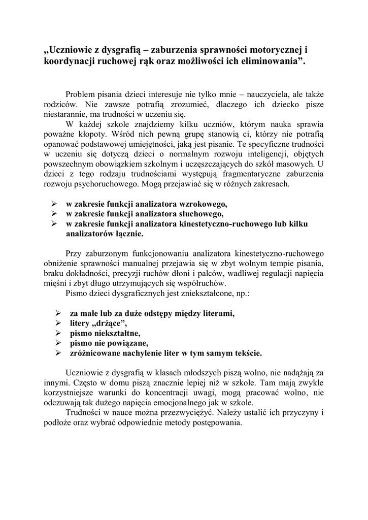 ,,Uczniowie z dysgrafią – zaburzenia sprawności motorycznej i koordynacji ruchowej rąk oraz możliwości ich eliminowania”. Problem pisania dzieci interesuje nie tylko mnie – nauczyciela, ale także rodziców. Nie zawsze potrafią zrozumieć, dlaczego ich dziecko pisze niestarannie, ma trudności w uczeniu się. W każdej szkole znajdziemy kilku uczniów, którym nauka sprawia poważne kłopoty. Wśród nich pewną grupę stanowią ci, którzy nie potrafią opanować podstawowej umiejętności, jaką jest pisanie. Te specyficzne trudności w uczeniu się dotyczą dzieci o normalnym rozwoju inteligencji, objętych powszechnym obowiązkiem szkolnym i uczęszczających do szkół masowych. U dzieci z tego rodzaju trudnościami występują fragmentaryczne zaburzenia rozwoju psychoruchowego. Mogą przejawiać się w różnych zakresach. w zakresie funkcji analizatora wzrokowego, w zakresie funkcji analizatora słuchowego, w zakresie funkcji analizatora kinestetyczno-ruchowego lub kilku analizatorów łącznie. Przy zaburzonym funkcjonowaniu analizatora kinestetyczno-ruchowego obniżenie sprawności manualnej przejawia się w zbyt wolnym tempie pisania, braku dokładności, precyzji ruchów dłoni i palców, wadliwej regulacji napięcia mięśni i zbyt długo utrzymujących się współruchów. Pismo dzieci dysgraficznych jest zniekształcone, np.: za małe lub za duże odstępy między literami, litery ,,drżące”, pismo niekształtne, pismo nie powiązane, zróżnicowane nachylenie liter w tym samym tekście. Uczniowie z dysgrafią w klasach młodszych piszą wolno, nie nadążają za innymi. Często w domu piszą znacznie lepiej niż w szkole. Tam mają zwykle korzystniejsze warunki do koncentracji uwagi, mogą pracować wolno, nie odczuwają tak dużego napięcia emocjonalnego jak w szkole. Trudności w nauce można przezwyciężyć. Należy ustalić ich przyczyny i podłoże oraz wybrać odpowiednie metody postępowania. A teraz w paru słowach scharakteryzuję zaburzenia sprawności motorycznej: 1. Objawy ogólnej niezręczności ruchowej: Mała aktywność ruchowa. Ogólna niezręczność ruchowa. Brak koordynacji ruchów przy udziale różnych grup mięśniowych. Trudności w utrzymaniu równowagi przy staniu na jednej nodze i innych ćwiczeniach gimnastycznych. Unikanie zabaw ruchowych. Zakłócenie koordynacji wzrokowo-ruchowej w zabawach (rzut piłką, gra w klasy) Nie umieją rzucać, łapać i kopać piłki. Z trudem uczą się jeździć na rowerze, łyżwach. Brak precyzji ruchów, wzmożone napięcie mięśniowe i współruchy. Nie kończą pracy, mają trudności z koncentracją uwagi, szybko zniechęcają się. Nie nadążają za rówieśnikami w czasie klasówek i dyktand. Rysują niechętnie. Prace robią wrażenie niedbale wykończonych, ponieważ są często poplamione, podarte, pogniecione. 2. Objawy zakłócenia motoryki manualnej: Brak precyzji ruchów drobnych. Są mało samodzielne. Codzienne czynności wykonują wolno. Często psują i niszczą zabawki. Niewłaściwa koordynacja obu rąk (trudności przy zapinaniu guzików, wiązaniu sznurowadeł. Mała precyzja ruchów dłoni i palców. Nieprawidłowe trzymanie narzędzia pisarskiego. Zeszyty są niestaranne, pomazane. Niezręcznie wycinają. Zbyt silne napięcie mięśniowe powoduje zbyt silny nacisk długopisu, łamanie kredek. Ruchy ręki są gwałtowne, mało płynne. Zaburzenia motoryki i koordynację ruchową dobierając odpowiednie zestawy ćwiczeń, np.: można eliminować, Ćwiczenie płynności ruchów: Zamalowywanie arkusza papieru grubym pędzlem ruchami poziomymi. Zamalowywanie jw. ruchami pionowymi. Zamalowywanie kół i form kolistych okrężnymi ruchami ręki. Malowanie spirali i kształtów łukowatych po śladzie. Zamalowywanie konturów rysunków o dużym formacie. Ćwiczenia chwytu pęsetkowego: Sortowanie małych guzików i korali. Nakręcanie zabawek ze sprężyną. Gry: w karty, domino, bierki itp. Wyszywanie. Przesuwanie koralików po drucie powyginanym w różne kształty. Ćwiczenia płynnych i postępujących ruchów pisarskich: Obrysowywanie szablonów. Rysowanie szlaczków. Łączenie wyznaczonych punktów linią ciągłą. Polecam Państwu książkę M. Bogdanowicz ,,Metoda dobrego startu”. Życzę cierpliwości w dążeniu do celu, tzn. do eliminacji dysgrafii u dziecka.