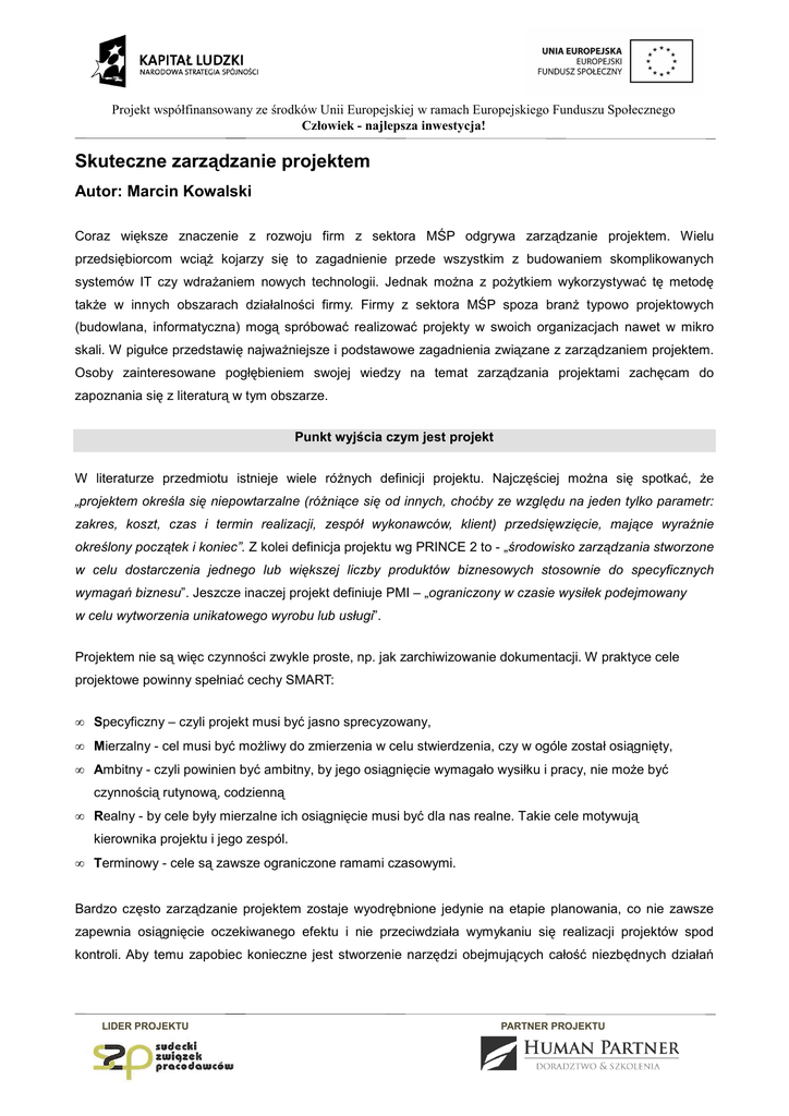 Projekt współfinansowany ze środków Unii Europejskiej w ramach Europejskiego Funduszu Społecznego Człowiek - najlepsza inwestycja! Skuteczne zarządzanie projektem Autor: Marcin Kowalski Coraz większe znaczenie z rozwoju firm z sektora MŚP odgrywa zarządzanie projektem. Wielu przedsiębiorcom wciąż kojarzy się to zagadnienie przede wszystkim z budowaniem skomplikowanych systemów IT czy wdrażaniem nowych technologii. Jednak można z pożytkiem wykorzystywać tę metodę także w innych obszarach działalności firmy. Firmy z sektora MŚP spoza branż typowo projektowych (budowlana, informatyczna) mogą spróbować realizować projekty w swoich organizacjach nawet w mikro skali. W pigułce przedstawię najważniejsze i podstawowe zagadnienia związane z zarządzaniem projektem. Osoby zainteresowane pogłębieniem swojej wiedzy na temat zarządzania projektami zachęcam do zapoznania się z literaturą w tym obszarze. Punkt wyjścia czym jest projekt W literaturze przedmiotu istnieje wiele różnych definicji projektu. Najczęściej można się spotkać, że „projektem określa się niepowtarzalne (różniące się od innych, choćby ze względu na jeden tylko parametr: zakres, koszt, czas i termin realizacji, zespół wykonawców, klient) przedsięwzięcie, mające wyraźnie określony początek i koniec”. Z kolei definicja projektu wg PRINCE 2 to - „środowisko zarządzania stworzone w celu dostarczenia jednego lub większej liczby produktów biznesowych stosownie do specyficznych wymagań biznesu”. Jeszcze inaczej projekt definiuje PMI – „ograniczony w czasie wysiłek podejmowany w celu wytworzenia unikatowego wyrobu lub usługi”. Projektem nie są więc czynności zwykle proste, np. jak zarchiwizowanie dokumentacji. W praktyce cele projektowe powinny spełniać cechy SMART: • Specyficzny – czyli projekt musi być jasno sprecyzowany, • Mierzalny - cel musi być możliwy do zmierzenia w celu stwierdzenia, czy w ogóle został osiągnięty, • Ambitny - czyli powinien być ambitny, by jego osiągnięcie wymagało wysiłku i pracy, nie może być czynnością rutynową, codzienną • Realny - by cele były mierzalne ich osiągnięcie musi być dla nas realne. Takie cele motywują kierownika projektu i jego zespól. • Terminowy - cele są zawsze ograniczone ramami czasowymi. Bardzo często zarządzanie projektem zostaje wyodrębnione jedynie na etapie planowania, co nie zawsze zapewnia osiągnięcie oczekiwanego efektu i nie przeciwdziała wymykaniu się realizacji projektów spod kontroli. Aby temu zapobiec konieczne jest stworzenie narzędzi obejmujących całość niezbędnych działań LIDER PROJEKTU PARTNER PROJEKTU Projekt współfinansowany ze środków Unii Europejskiej w ramach Europejskiego Funduszu Społecznego Człowiek - najlepsza inwestycja! koncepcyjnych, planistycznych, wykonawczych, kontrolnych itd., oparcie ich na mniej lub bardziej sformalizowanych zasadach i procedurach oraz zorganizowanie w jeden spójny ciąg zadań przebiegających w odpowiednich dla konkretnych warunków ramach organizacyjnych. W zarządzaniu projektem wyróżnia się, zgodnie z metodyką PMI, cztery podstawowe procesy: • Rozpoczęcie - zainicjuj projekt , aby uzyskać poparcie i zbudować „Kartę Projektu” • Planowanie - zdefiniuj, udokumentuj zakres projektu, przedstaw metody realizacji. • Realizacja - zarządzaj projektem wykorzystując elementy wypracowane na etapie planowania. • Zakończenie - formalnie zamknij projekt uwzględniając zdobytą wiedzę. oraz dodatkowo w trakcie trwania całego projektu – kontrola i monitoring. Etapy te tworzą tzw. „cykl życia projektu”. Wprowadzenie tego podziału nie tylko umożliwia określenie początku i końca projektu w rozumieniu zadaniowym, lecz również wyznacza przedział czasu na jego realizację oraz kolejność i stopień angażowania niezbędnego potencjału. W praktyce oznacza to uzyskanie rozkładu nakładów materialnych i finansowych na realizację przedsięwzięcia w czasie. Poszczególne grupy procesów zachodzą na siebie i są dodatkowo podzielone na 9 obszarów wiedzy (Knowlegde Area): 1. Dokumentacja projektowa (Project charter), 2. Spotkanie otwierające (Kick-off meeting), 3. Zakres projektu (Project scope), 4. Zarządzanie ryzykiem (Assurance), 5. Tworzenie zespołu (Team composition), 6. Harmonogramowanie (Scheduling), 7. Zasoby i wydatki (Staffing and spending), 8. Realizacja (Execution), 9. Zamykanie projektu (Close Out). W przeciwieństwie do procesu, projekt wykonuje się raz, a każdy projekt ma określoną datę rozpoczęcia i zakończenia (co nie oznacza jednak, że daty te nie mogą się zmieniać - w praktyce często tak się dzieje, w szczególności w dużych projektach infrastrukturalnych, czy z obszaru IT). Wyprodukowanie partii towaru na linii produkcyjnej zdecydowanie nie kwalifikuje się jako projekt, gdyż jest to proces powtarzalny, bez zaplanowanego końca; projektem mogłoby być np. zaplanowanie i zorganizowanie takiego procesu produkcyjnego. LIDER PROJEKTU PARTNER PROJEKTU Projekt współfinansowany ze środków Unii Europejskiej w ramach Europejskiego Funduszu Społecznego Człowiek - najlepsza inwestycja! Podstawowa dokumentacja projektu Dokumentacja jest w zasadzie jednym z najważniejszych elementów zarządzania projektem (szczególnie jego monitorowania). Przedsiębiorca, który nie ma stosownego doświadczenia w realizacji projektów, a planujący przystąpić do procesu zarządzania projektem, powinien w szczególności uważnie zapoznać się z wymaganymi dokumentami. Metodologie PMI/IPMA określają różne wymagania dotyczące przygotowania i prowadzenia dokumentacji. Niemniej podstawowe dokumenty, jakie przedsiębiorcy powinni wykorzystywać w zarządzaniu projektem to m.in.: • karta projektu • szczegółowy zakres realizowanego projektu (określenie szczegółowych celów, plan działań, ocena korzyści • struktura podziału prac (WBS) 