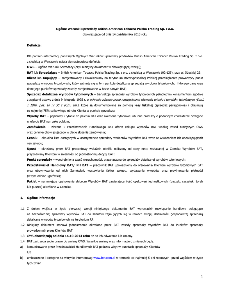 Ogólne Warunki Sprzedaży British American Tobacco Polska Trading Sp. z o.o. obowiązujące od dnia 14 października 2013 roku Definicje: Dla potrzeb interpretacji poniższych Ogólnych Warunków Sprzedaży produktów British American Tobacco Polska Trading Sp. z o.o. z siedzibą w Warszawie ustala się następujące definicje: OWS – Ogólne Warunki Sprzedaży (czyli niniejszy dokument w obowiązującej wersji); BAT lub Sprzedający – British American Tobacco Polska Trading Sp. z o.o. z siedzibą w Warszawie (02-135), przy ul. Iłżeckiej 26; Klient lub Kupujący – zarejestrowany i zlokalizowany na terytorium Rzeczypospolitej Polskiej przedsiębiorca prowadzący punkt sprzedaży wyrobów tytoniowych, który zajmuje się w tym punkcie detaliczną sprzedażą wyrobów tytoniowych, i którego dane oraz dane jego punktów sprzedaży zostały zarejestrowane w bazie danych BAT; Sprzedaż detaliczna wyrobów tytoniowych – transakcje sprzedaży wyrobów tytoniowych pełnoletnim konsumentom zgodnie z zapisami ustawy z dnia 9 listopada 1995 r. o ochronie zdrowia przed następstwami używania tytoniu i wyrobów tytoniowych (Dz.U. z 1996, poz. 10 nr 55 z późn. zm.), które są dokumentowane za pomocą kasy fiskalnej (sprzedaż paragonowa) i obejmują co najmniej 75% całkowitego obrotu Klienta w punkcie sprzedaży; Wyroby BAT – papierosy i tytonie do palenia BAT oraz akcesoria tytoniowe lub inne produkty o podobnym charakterze dostępne w ofercie BAT na rynku polskim; Zamówienie – złożona u Przedstawiciela Handlowego BAT oferta zakupu Wyrobów BAT według zasad niniejszych OWS oraz cennika obowiązującego w dacie złożenia zamówienia; Cennik – aktualna lista dostępnych w asortymencie sprzedaży wariantów Wyrobów BAT wraz ze wskazaniem ich obowiązujących cen zakupu; Upust – określony przez BAT procentowy wskaźnik obniżki naliczany od ceny netto wskazanej w Cenniku Wyrobów BAT, przyznawany Klientom w zależności od jednostronnej decyzji BAT; Punkt sprzedaży – wyodrębniona część nieruchomości, przeznaczona do sprzedaży detalicznej wyrobów tytoniowych; Przedstawiciel Handlowy BAT/ PH BAT – pracownik BAT upoważniony do oferowania Klientom wyrobów tytoniowych BAT oraz otrzymywania od nich Zamówień, wystawiania faktur zakupu, wydawania wyrobów oraz przyjmowania płatności (w tym odbioru gotówki); Pakiet – najmniejsze opakowanie zbiorcze Wyrobów BAT zawierające ilość opakowań jednostkowych (paczek, saszetek, toreb lub puszek) określone w Cenniku. 1. Ogólne informacje 1.1. Z dniem wejścia w życie pierwszej wersji niniejszego dokumentu BAT wprowadził rozwiązanie handlowe polegające na bezpośredniej sprzedaży Wyrobów BAT do Klientów zajmujących się w ramach swojej działalności gospodarczej sprzedażą detaliczną wyrobów tytoniowych na terytorium RP. 1.2. Niniejszy dokument stanowi jednostronnie określone przez BAT zasady sprzedaży Wyrobów BAT do Punktów sprzedaży prowadzonych przez Klientów BAT. 1.3. OWS obowiązują od dnia 14.10.2013 roku aż do ich odwołania lub zmiany. 1.4. BAT zastrzega sobie prawo do zmiany OWS. Wszelkie zmiany oraz informacje o zmianach będą: a) komunikowane przez Przedstawicieli Handlowych BAT podczas wizyt w punktach sprzedaży Klientów lub b) umieszczone i dostępne na witrynie internetowej www.bat.com.pl w terminie co najmniej 5 dni roboczych przed wejściem w życie tych zmian. 1 1.5. Zmiany powyższe będą skuteczne i wiążące dla BAT i Klientów po upływie 5 dni roboczych od dnia ich opublikowania na wskazanej powyżej witrynie internetowej. 1.6. Aktualny Cennik BAT jest dostępny do wglądu u PH BAT. Cennik jest informacją handlową, nie stanowi oferty w rozumieniu Kodeksu cywilnego. Ofertę tę stanowi zamówienie złożone BAT przez Klienta. 1.7. BAT zastrzega, iż Cennik może ulegać bieżącym zmianom. Złożenie Zamówienia na zakup Wyrobów BAT przez Klienta jest jednoznaczne z akceptacją cen wynikających z nowego Cennika. 1.8. Każde złożone u Przedstawiciela Handlowego BAT Zamówienie na zakup Wyrobów BAT oznacza akceptację niniejszych OWS w brzmieniu obowiązującym w dniu składania zamówienia. 1.9. Przyjmuje się, że zmiany Cennika lub innych dokumentów załączonych do OWS lub wynikających z ich brzmienia nie stanowią istotnej zmiany treści OWS. 2. Zamówienia i sprzedaż 2.1. Wszystkie Zamówienia dotyczące zakupu Wyrobów BAT na podstawie niniejszych OWS są składane ustnie w momencie wizyty PH BAT. 2.2. Aktualne ceny sprzedaży Wyrobów BAT są określone w Cenniku. Wskazane w Cenniku na dzień składania przez Klienta Zamówienia, ceny obowiązują wszystkich Klientów i nie podlegają negocjacji z PH BAT. 2.3. Na potrzeby realizacji niniejszych OWS uznaje się, że osoby znajdujące się w Punkcie sprzedaży Klienta posiadają wystarczające umocowanie do składania Zamówień, zakupu Wyrobów BAT oraz ich odbioru, a także dokonywania płatności za te Wyroby BAT lub za wydane uprzednio, jeżeli osoby te deklarują umocowanie Klienta do wykonywania wyżej wymienionych czynności, a okoliczności stanu faktycznego i zachowanie tych osób nie nasuwają zastrzeżeń co do wiarygodności tej deklaracji. 2.4. Wizyty PH BAT w Punktach sprzedaży detalicznej Klientów odbywają się nie rzadziej niż jedna wizyta w okresie trzech tygodni kalendarzowych. 2.5. Minimalną wielkością składanego Zamówienia jest 1 pakiet Wyrobów BAT zawierający ilość opakowań jednostkowych wskazanych w Cenniku. 2.6. Klient może złożyć 1 Zamówienie dziennie na 1 punkt sprzedaży. 2.7. Każdorazowa sprzedaż Klientowi przez Przedstawiciela Handlowego Wyrobów BAT odbywa się na podstawie złożonego przez Klienta, zgodnie z niniejszymi warunkami, zamówienia oraz obowiązującego Cennika z uwzględnieniem ewentualnych upustów. 2.8. BAT zastrzega sobie jednostronne prawo do odmowy przyjęcia złożonego przez Klienta Zamówienia z powodu braku Wyrobów BAT w pojeździe, kt