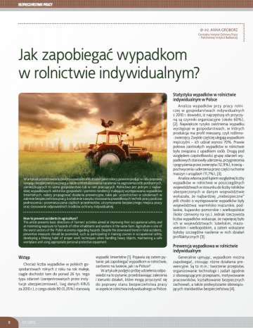 dr in¿. ANNA GROBORZ Centralny Instytut Ochrony Pracy – Pañstwowy Instytut Badawczy Jak zapobiegaæ wypadkom w rolnictwie indywidualnym? Fot. Michele Piacquadio/Bigstockphoto Statystyka wypadków w rolnictwie indywidualnym w Polsce W artykule przedstawiono podstawowe kierunki dzia³añ jakie rolnicy powinni podj¹æ w celu poprawy swojego bezpieczeñstwa pracy, a tak¿e zminimalizowania nara¿enia na zagro¿enia osób postronnych, zamieszkuj¹cych to samo gospodarstwo lub w nim pracuj¹cych. Rolnictwo jest jednym z najbardziej wypadkowych sektorów gospodarki i pomimo tendencji malej¹cej wystêpowania wypadków śmiertelnych, nale¿y propagowaæ dzia³ania prewencyjne, takie jak: uczestnictwo w szkoleniach w zakresie bezpieczeñstwa pracy, kszta³cenie nawyku stosowania prawid³owych technik pracy podczas podnoszenia i przemieszczania ciê¿kich przedmiotów, utrzymywanie bezpiecznego miejsca pracy oraz stosowanie odpowiednich środków ochrony indywidualnej. How to prevent accidents in agriculture? This article presents basic directions of farmers' activities aimed at improving their occupational safety and at minimizing exposure to hazards of other inhabitants and workers in the same farm. Agriculture is one of the worst sectors of the Polish economy regarding hazards. Despite the downward trend in fatal accidents, preventive measures should be promoted, such as participating in training courses in occupational safety, developing a lifelong habit of proper work techniques when handling heavy objects, maintaining a safe workplace and using appropriate personal protective equipment. Wstêp Chocia¿ liczba wypadków w polskich gospodarstwach rolnych z roku na rok maleje, ci¹gle dochodzi tam do ponad 26 tys. tego typu zdarzeñ (zarejestrowanych przez instytucje ubezpieczeniowe), (wg danych KRUS za 2010 r.), z czego oko³o 90 (0,35%) stanowi¹ 8 07/2012 wypadki śmiertelne [1]. Pojawia siê zatem pytanie: jak zapobiegaæ wypadkom w rolnictwie, zarówno na świecie, jak i w Polsce? W artykule podjêto próbê udzielenia odpowiedzi na to pytanie, przedstawiaj¹c zalecenia i kierunki dzia³añ, które mog¹ przyczyniæ siê do poprawy stanu bezpieczeñstwa pracy w aspekcie rolnictwa indywidualnego w Polsce. Analiza wypadków przy pracy rolniczej w gospodarstwach indywidualnych z 2010 r. dowodzi, i¿ najczêstsz¹ ich przyczyn¹ s¹ czynniki organizacyjne (oko³o 60%), [2]. Najwiêksze ryzyko zaistnienia wypadku wystêpuje w gospodarstwach, w których produkcja ma profil mieszany, czyli roślinno-zwierzêcy. Zwykle czêściej ulegaj¹ wypadkom mê¿czyźni – ich udzia³ wynosi 70%. Prawie po³owa zaistnia³ych wypadków w rolnictwie by³a zwi¹zana z upadkiem osób. Drug¹ pod wzglêdem czêstotlliwości grupê zdarzeñ wypadkowych stanowi³y uderzenia, przygniecenia i pogryzienia przez zwierzêta (12,9%), trzeci¹ – pochwycenia i uderzenia przez czêści ruchome maszyn i urz¹dzeñ (11,7%), [3]. Analiza w³asna pod k¹tem wzglêdnej liczby wypadków w rolnictwie w poszczególnych województwach w stosunku do liczby rolników ubezpieczonych w danym województwie wykaza³a, ¿e najbardziej „niebezpieczne” jeśli chodzi o wystêpowanie wypadków by³y województwa: warmiñsko-mazurskie, podlaskie, kujawsko-pomorskie i wielkopolskie (kolor czerwony na rys.). Jednak rzeczywista liczba wypadków wskazuje, ¿e najwiêcej by³o ich w województwach: lubelskim, mazowieckim i wielkopolskim, a zatem wskazane by³oby szczególne nasilenie w nich dzia³añ profilaktycznych [3]. Prewencja wypadkowa w rolnictwie indywidualnym Generalnie ujmuj¹c, wypadkom mo¿na zapobiegaæ, stosuj¹c ró¿ne dzia³ania prewencyjne. S¹ to m.in.: tworzenie przepisów, organizowanie technologii i zadañ zgodnie z obowi¹zuj¹cymi przepisami, motywowanie pracowników, kszta³towanie bezpiecznych zachowañ, a tak¿e podwy¿szanie obowi¹zuj¹cych standardów bezpieczeñstwa [4]. ci¹gnik z podnośnikiem wid³owym lub chwytakiem czo³owym. Województwo Wzglêdna liczba wypadków w rolnictwie [%] zachodnio-pomorskie wielkopolskie warmiñsko-mazurskie świêtokrzyskie śl¹skie pomorskie podlaskie podkarpackie opolskie mazowieckie ma³opolskie ³ódzkie lubuskie lubelskie kujawsko-pomorskie dolnośl¹skie Bezpieczne miejsce pracy 0 1 2 3 4 5 6 7 8 9 10 Rys. Wzglêdna liczba wypadków w rolnictwie wg województw (obliczona jako liczba rzeczywista wypadków w stosunku do liczby rolników ubezpieczonych w poszczególnych województwach w przeliczeniu na 100 tys. mieszkañców w stosunku procentowym do wszystkich wypadków). Źród³o: KRUS Fig. The relative number of accidents in agriculture by province (calculated as the number of actual accidents in relation to the number of insured farmers in each province per 100 thousand of population as a percentage of all accidents) Zapobieganiu wypadkom przy pracy w rolnictwie s³u¿¹ ró¿ne środki i metody postêpowania, np. wykonanie maszyn, budynków i wyposa¿enia wed³ug projektu uwzglêdniaj¹cego mo¿liwości wystêpowania zagro¿eñ, z uwzglêdnieniem os³on ruchomych czêści maszyn i napêdu; dobór odpowiednich (tzn. wykwalifikowanych) osób do wykonywanego zadania; podnoszenie poziomu wiedzy i świadomości rolników w zakresie zagro¿eñ i bezpieczeñstwa pracy [5]. Motywacja rolników Wp³yw na zwiêkszenie motywacji rolników do wymiany narzêdzi i maszyn na nowocześniejsze i bezpieczniejsze w u¿ytkowaniu, wykonywania przegl¹dów technicznych maszyn oraz udzia³u w szkoleniach z zakresu bezpieczeñstwa mog³yby mieæ ulgi podatkowe, zni¿ki ubezpieczeniowe, niskooprocentowane kredyty oraz wiêksze ni¿ obecnie wsparcie organów pañstwowych lub organizacji rolniczych w kierowaniu u¿ywanego sprzêtu do przegl¹dów technicznych. Statystyki wypadkowe wskazuj¹, ¿e wiêkszośæ (66,5%) wypadków w rolnictwie ma miejsce w ma³ych gospodarstwach rolnych o powierzchni do 15 ha [3]. Rolnicy o niskich dochodach nie maj¹ środków na modernizacjê gospodarstwa, co