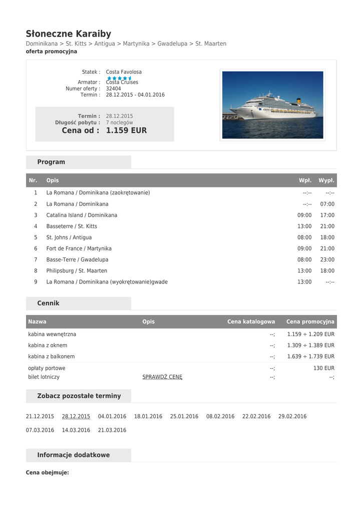 Słoneczne Karaiby Dominikana > St. Kitts > Antigua > Martynika > Gwadelupa > St. Maarten oferta promocyjna Statek : Armator : Numer oferty : Termin : Termin : Długość pobytu : Costa Favolosa Costa Cruises 32404 28.12.2015 - 04.01.2016 28.12.2015 7 noclegów Cena od : 1.159 EUR Program Nr. Opis Wpł. Wypł. 1 La Romana / Dominikana (zaokrętowanie) --:-- --:-- 2 La Romana / Dominikana --:-- 07:00 3 Catalina Island / Dominikana 09:00 17:00 4 Basseterre / St. Kitts 13:00 21:00 5 St. Johns / Antigua 08:00 18:00 6 Fort de France / Martynika 09:00 21:00 7 Basse-Terre / Gwadelupa 08:00 23:00 8 Philipsburg / St. Maarten 13:00 18:00 9 La Romana / Dominikana (wyokrętowanie)gwade 13:00 --:-- Cennik Nazwa Opis Cena katalogowa Cena promocyjna kabina wewnętrzna --; 1.159 ÷ 1.209 EUR kabina z oknem --; 1.309 ÷ 1.389 EUR kabina z balkonem --; 1.639 ÷ 1.739 EUR opłaty portowe --; 130 EUR --; --; bilet lotniczy SPRAWDŹ CENĘ Zobacz pozostałe terminy 21.12.2015 28.12.2015 04.01.2016 07.03.2016 14.03.2016 21.03.2016 Informacje dodatkowe Cena obejmuje: 18.01.2016 25.01.2016 08.02.2016 22.02.2016 29.02.2016 ● ● ● ● ● ● zakwaterowanie w kabinie wybranej kategorii; serwis bagażowy i kabinowy; wyżywienie - 3 główne posiłki; przekąski między posiłkami; korzystanie z basenu i innych urządzeń sportowo-rekreacyjnych; udział we wszystkich imprezach organizowanych na statku. Cena nie obejmuje: ● ● ● ● ● ● ● ● opłat portowych; kosztów dojazdu do portu; ewentualnych noclegów w hotelu przed/po rejsie i transferów (na zapytanie); wycieczek fakultatywnych; korzystania z punktów usługowych (pralnia, fotograf, salon piękności i odnowy biologicznej, internet); napojów do obiadów i kolacji, wody, drinków; napiwków obowiązkowych dla obsługi statku (ok. 8,5€/dzień/osoba powyżej 14 roku życia; 4,25€/dzień/dziecko w wieku 4-13); ubezpieczenia KL, NW i bagażu. ALL INCLUSIVE (opcja): Istnieje możliwość wykupienia pakietu ALL INCLUSIVE obejmującego wybrane napoje alkoholowe i bezalkoholowe dostępne bez ograniczeń we wszystkich barach. Cena pakietu: ● ● ● ● 25€/dzień/osoba dorosła i 16€/dzień/dziecko 25€ (pakiet bez koktajli)/dzień/osoba dorosła - pobierz ulotkę; (ważne od 27.11.2015) 28€ (pakiet z koktajlami)/dzień/osoba dorosła - pobierz ulotkę; (ważne od 27.11.2015) 16€/dzień/dziecko - pobierz ulotkę. (ważne od 27.11.2015) Dla statków klasy Neo cena pakietu: ● ● 28,75€ (pakiet z koktajlami)/dzień/osoba dorosła; 17,25€/dzień/dziecko. Warunkiem skorzystania z pakietu all inclusive jest wykupienie pakietu przez wszystkich pasażerów w kabinie na czas całego rejsu. Dla Rejsów trwających mniej niż 7 dni nie ma możliwości wykupienia pakietu all inclisive. Linia Costa Cruises proponuje pakiety winno-piwne, pakiety wodne (szczegóły u Konsultanta). Uwagi: Kabiny 3/4 osobowe nie są dostępne we wszystkich kategoriach, a ich liczba jest ograniczona - sprzedaż tylko po potwierdzeniu; ceny wycieczek fakultatywnych, propozycje dojazdu do portu, hoteli przed/po rejsie na zapytanie. Na pokładzie statku obowiązuje bezgotówkowy system opłat. Należność reguluje się ostatniego dnia rejsu gotówką (wpłata depozytu ok. 250€/kabina pierwszego dnia rejsu) lub kartą kredytową (VISA, Mastercard, American Express) na podstawie zbiorczego rachunku. Karty kredytowe należy zarejestrować zaraz po zaokrętowaniu.