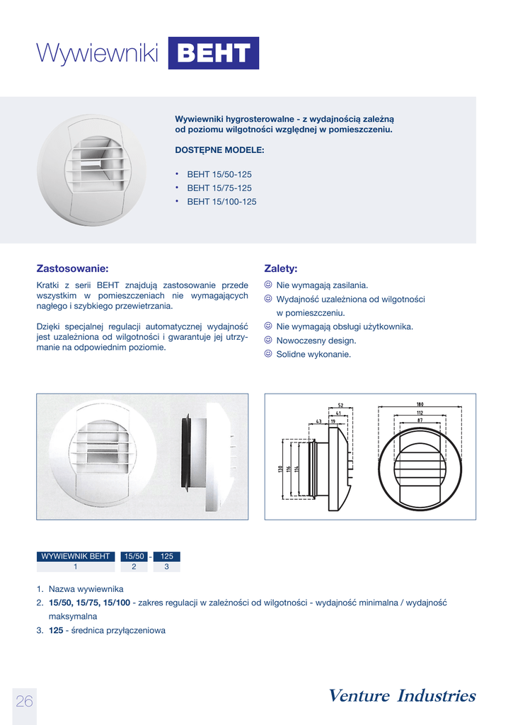 Wywiewniki BEHT Wywiewniki hygrosterowalne - z wydajnością zależną od poziomu wilgotności względnej w pomieszczeniu. DOSTĘPNE MODELE: • BEHT 15/50-125 • BEHT 15/75-125 • BEHT 15/100-125 Zastosowanie: Zalety: Kratki z serii BEHT znajdują zastosowanie przede wszystkim w pomieszczeniach nie wymagających nagłego i szybkiego przewietrzania. ܲܲ Nie wymagają zasilania. ܲܲ Wydajność uzależniona od wilgotności Dzięki specjalnej regulacji automatycznej wydajność jest uzależniona od wilgotności i gwarantuje jej utrzymanie na odpowiednim poziomie. ܲܲ Nie wymagają obsługi użytkownika. ܲܲ Nowoczesny design. ܲܲ Solidne wykonanie. WYWIEWNIK BEHT 1 15/50 2 w pomieszczeniu. 125 3 1. Nazwa wywiewnika 2. 15/50, 15/75, 15/100 - zakres regulacji w zależności od wilgotności - wydajność minimalna / wydajność maksymalna 3. 125 - średnica przyłączeniowa 26 Parametry techniczne: Typ Wydajność min [m3/h] Wydajność max [m3/h] Wymuszenie Zasilanie Dn przyłączeniowa [mm] BEHT 15/50-125 15 50 - Brak 125 BEHT 15/75-125 15 75 - Brak 125 BEHT 15/100-125 15 100 - Brak 125 Parametry akustyczne: Typ wywiewnika Podciśnienie [Pa] LW [dB(A)] Dn, e, w (C) [dB] 50 80 100 130 160 standard tłumik BEHT 15/50-125 25 27 28 32 36 56 60 BEHT 15/75-125 30 33 36 40 42 56 60 BEHT 15/100-125 30 33 36 40 42 56 60 Dn, e, w (C) = Lx - Ly L=x 2,5 m LW [dB(A)] - poziom mocy akustycznej emitowanej przez wywiewnik w wyniku przepływającego powietrza. Wartości poziomu mocy akustycznej są podawane dla określonej wartości podciśnienia statycznego panującego w kanale wentylacyjnym. Dla wartości podciśnienia poniżej 80 Pa, poziom mocy akustycznej przyjmuje wartości niższe niż podane w tabeli. Wartości poziomu mocy akustycznej są podawane dla wilgotności względnej 60 %. L=y Tłumik AAC Dn, e, w (C) - wskaźnik elementarnej znormalizowanej różnicy poziomów ciśnienia akustycznego. Określa tłumienie między kolejnymi kondygnacjami (rysunek obok) Charakterystyka przepływowa: Rysunek złożeniowy: Przepływ powietrza [m3/h] 100 BEHT 15/100 80 1 2 3 4 5 BEHT 15/75 60 BEHT 15/50 40 20 0 0 20 40 60 80 100 Wilgotność względna [%] Charakterystyka elementu wywiewnego przy podciśnieniu panującym w kanale 80 Pa 1. Kratka maskująca 2. Obudowa wywiewnika 3. Taśma hygroskopijna* 4. Element regulujący płynnie 5. Element regulujący wymuszenia * taśma hygroskopijna - taśma poliamidowa, zmieniająca swoją długość w zależności od zmian wilgotności względnej w pomieszczeniu. Energy Solutions 27 Montaż: • • • • wywiewniki z serii BEHT mogą być instalowane w wersji pionowej lub poziomej, nie wymagają żadnego zasilania elektrycznego, brak możliwości ręcznego ustawienia wartości wydajności, wywiewniki powinny być zainstalowane w taki sposób, aby połączenie między nimi a kanałem wentylacyjnym było szczelne, • elementem regulującym wartość wydajności jest specjalna taśma higroskopijna. Wykonano ją z materiału, który zmienia swoją objętość pod wpływem wilgoci. Montaż bezpośrednio do kanału wentylacyjnego. Modele BEHT xx/xx-125 - są standardowo przystosowane do montażu do kanału wentylacyjnego. Lmin - 100 mm - minimalna długość kanału przyłączeniowego Lmax - 1000 mm - maksymalna długość kanału wentylacyjnego Użytkowanie: • • • • kratka wentylacyjna wywiewna BEHT jest urządzeniem bezobsługowym, zaleca się czyszczenie urządzenia w przypadku zabrudzenia wilgotną ściereczką, wszelka ingerencja w budowę urządzenia prowadzi do utraty gwarancji, ingerencja w budowę wywiewnika (w tym mechaniczne przytkanie wlotu) może prowadzić do: • rozregulowania systemu wentylacyjnego w całym pionie, • zwiększenia hałasu emitowanego przez wywiewnik, • niedostatecznej wentylacji pomieszczeń, a tym samym do niezapewnienia warunków komfortu, zawilgocenia pomieszczenia, rozwoju grzybów pleśni itd. 28
