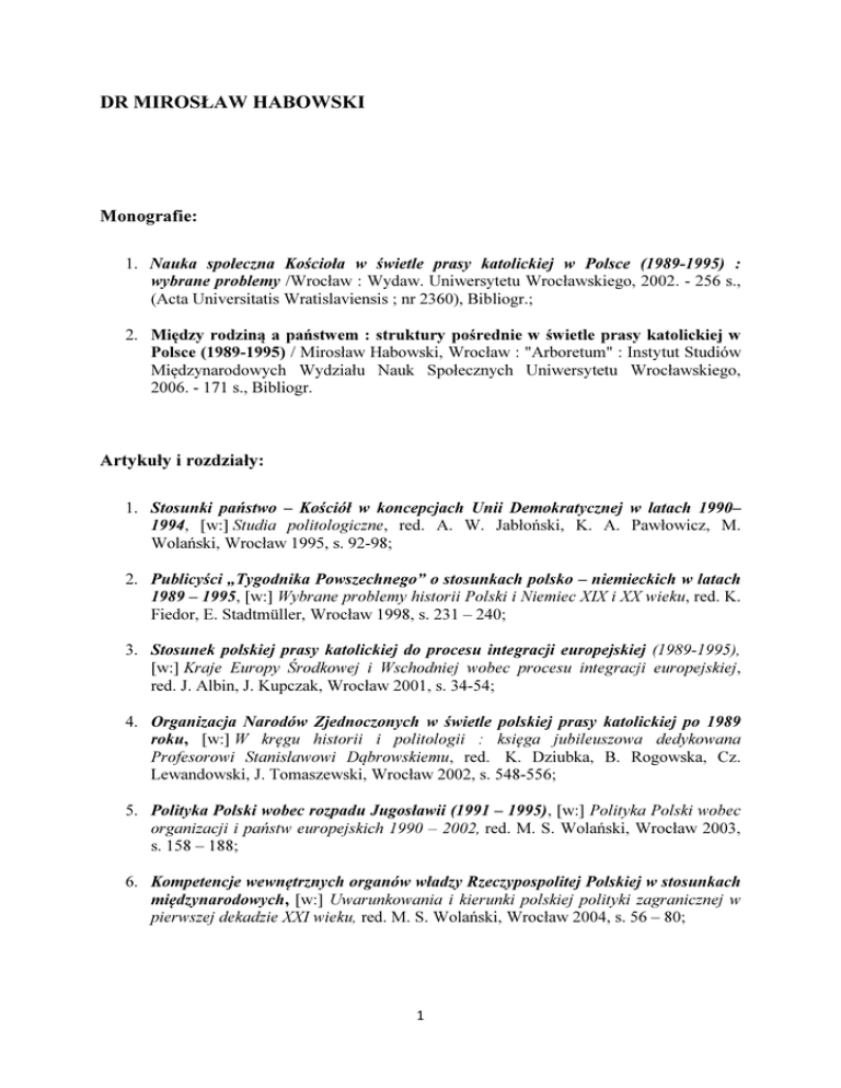 DR MIROSŁAW HABOWSKI Monografie: 1. Nauka społeczna Kościoła w świetle prasy katolickiej w Polsce (1989-1995) : wybrane problemy /Wrocław : Wydaw. Uniwersytetu Wrocławskiego, 2002. - 256 s., (Acta Universitatis Wratislaviensis ; nr 2360), Bibliogr.; 2. Między rodziną a państwem : struktury pośrednie w świetle prasy katolickiej w Polsce (1989-1995) / Mirosław Habowski, Wrocław : "Arboretum" : Instytut Studiów Międzynarodowych Wydziału Nauk Społecznych Uniwersytetu Wrocławskiego, 2006. - 171 s., Bibliogr. Artykuły i rozdziały: 1. Stosunki państwo – Kościół w koncepcjach Unii Demokratycznej w latach 1990– 1994, [w:] Studia politologiczne, red. A. W. Jabłoński, K. A. Pawłowicz, M. Wolański, Wrocław 1995, s. 92-98; 2. Publicyści „Tygodnika Powszechnego” o stosunkach polsko – niemieckich w latach 1989 – 1995, [w:] Wybrane problemy historii Polski i Niemiec XIX i XX wieku, red. K. Fiedor, E. Stadtmüller, Wrocław 1998, s. 231 – 240; 3. Stosunek polskiej prasy katolickiej do procesu integracji europejskiej (1989-1995), [w:] Kraje Europy Środkowej i Wschodniej wobec procesu integracji europejskiej, red. J. Albin, J. Kupczak, Wrocław 2001, s. 34-54; 4. Organizacja Narodów Zjednoczonych w świetle polskiej prasy katolickiej po 1989 roku, [w:] W kręgu historii i politologii : księga jubileuszowa dedykowana Profesorowi Stanisławowi Dąbrowskiemu, red. K. Dziubka, B. Rogowska, Cz. Lewandowski, J. Tomaszewski, Wrocław 2002, s. 548-556; 5. Polityka Polski wobec rozpadu Jugosławii (1991 – 1995), [w:] Polityka Polski wobec organizacji i państw europejskich 1990 – 2002, red. M. S. Wolański, Wrocław 2003, s. 158 – 188; 6. Kompetencje wewnętrznych organów władzy Rzeczypospolitej Polskiej w stosunkach międzynarodowych, [w:] Uwarunkowania i kierunki polskiej polityki zagranicznej w pierwszej dekadzie XXI wieku, red. M. S. Wolański, Wrocław 2004, s. 56 – 80; 1 7. Koncepcje polityki zagranicznej polskich partii centrowych, [w:] Uwarunkowania i kierunki polskiej polityki zagranicznej w pierwszej dekadzie XXI wieku, red. M. S. Wolański, Wrocław 2004, s. 159 – 199; 8. Problematyka wojny w Afganistanie w debatach Sejmu IV kadencji, [w:] Euroatlantycka obronność na rozdrożu, red. G. Rdzanek, Wrocław 2004, s. 155 – 190; 9. Polsko-czeskie stosunki polityczne, [w:] Republika Czeska, red. B. J. Albin, W. Baluk; sekretarz tomu E. Pałka, Wrocław 2005, s. 303-341; 10. Ukraina w koncepcjach polityki zagranicznej Prawa i Sprawiedliwości, [w:] PolskaUkraina : więcej niż sąsiedztwo, red. M. S. Wolański, Ł. Leszczenko, Wrocław 2006, s. 77-85; 11. Systemy rządów Polski i Białorusi. Próba porównania, [w:] Polska – Białoruś. Wybrane aspekty polityczne i gospodarcze, red. M. S. Wolański i G. Tokarz, Toruń 2007, s. 9 – 53; 12. Debata parlamentarna nad rezolucją Sejmu Rzeczypospolitej Polskiej w sprawie łamania praw człowieka i obywatela na Białorusi (lipiec-wrzesień 2004 r.), [w:] Białoruś - Polska : przeszłość i teraźniejszość, red. M. S. Wolański, G. Tokarz, Wrocław 2007, s. 63-105; 13. NATO czy KBWE?: polskie debaty nad polityką bezpieczeństwa w pierwszej połowie lat 90. XX wieku, "Racja Stanu. Studia i materiały" 2007, nr 2 (2), Wrocław 2007, s. 257-276; 14. Konflikt polsko – białoruski w sprawie przestrzegania praw mniejszości polskiej na Białorusi w 2005 roku w świetle prac polskiego Sejmu IV kadencji, [w:] Europa narodów, red. G. Tokarz, Wrocław 2008, s. 129 – 199; 15. Liga Polskich Rodzin wobec Polonii i Polaków za granicą, [w:] Narodowa Demokracja XIX – XXI wiek. Koncepcje, ludzie, działalność, red. T. Sikorskiego i A. Wątora, Szczecin 2008, s. 870 – 891; 16. Udział Sejmu w wypowiedzeniu w stosunkach między Rzecząpospolitą Polską a niektórymi państwami postkomunistycznymi konwencji w sprawie uregulowania podwójnego obywatelstwa, "Rocznik Instytutu Europy Środkowo-Wschodniej" 2008, Lublin 2008, s. 191-204; 17. Stosunki Białorusi z Polską, [w:] Białoruś w stosunkach międzynarodowych, red. I. Topolski, Lublin 2009, s. 233-253; 18. Polityka Polski wobec Polaków – obywateli państw poradzieckich, [w:] Polityka wschodnia Polski. Uwarunkowania. Koncepcje. Realizacja, red. A. Gil i T. Kapuśniak, Lublin – Warszawa 2009, s. 309 – 325; 19. Polskie reakcje na deklarację Bundestagu "Wypędzeni, przesiedleni i mniejszość niemiecka pomostem między Niemcami i ich wschodnimi sąsiadami", [w:] Religia, 2 polityka, naród - studia nad współczesną myślą polityczną, red. R. Łętocha, Kraków 2010, s. 351 - 364; 20. Mniejszość polska na Białorusi i jej organizacje w pracach sejmowej Komisji Łączności z Polakami za Granicą, [w:] Polska mniejszość narodowa na Białorusi : Związek Polaków na Białorusi w 20-lecie działalności, red. Z. J. Winnicki, T. Gawin, Białystok 2010, s. 191 - 204; 21. Miejsce Białorusi w polskiej polityce zagranicznej po uzyskaniu członkostwa w Unii Europejskiej, "Wschodnioznawstwo" 2010, tom 4, Wrocław 2010, s. 53-67; 22. Problematyka suwerenności państwa w sejmowych debatach poświęconych zagadnieniom polityki zagranicznej Rzeczypospolitej Polskiej (1989-1993), [w:] Oblicza polskiej modernizacji : próba bilansu transformacji systemowej III Rzeczypospolitej, red. E. Krasucki, T. Sikorski, A. Szczepańska, Toruń 2011, s. 363385; 23. Polityka wschodnia rządu Donalda Tuska, "Wschodnioznawstwo" 2011, tom 5, Wrocław 2011, s. 89-120; 24. Realista nierealistyczny: rzecz o Adolfie Bocheńskim, "Racja Stanu. Studia i materiały" 2011, nr 2 (10), Wrocław 2011, s. 161-174; 25. Spór o polską politykę zagraniczną w latach 1989-1993: Zdzisław Najder o polityce ministra Krzysztofa Skubiszewskiego, "Racja Stanu. Studia i materiały" 2012, nr 1 (11), Wrocław 2012, s. 267-278; 26. Внешняя политика Польши в 2011—2012 гг., [w:] Актуальныя пытанні беларуска-польскіх адносін: д