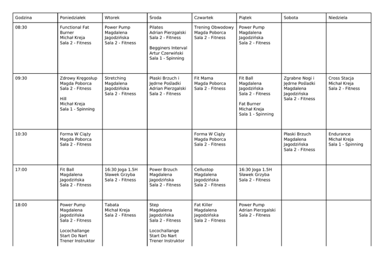 Godzina Poniedziałek Wtorek Środa Czwartek Piątek 08:30 Functional Fat Burner Michał Kreja Sala 2 - Fitness Power Pump Magdalena Jagodzińska Sala 2 - Fitness Pilates Adrian Pierzgalski Sala 2 - Fitness Trening Obwodowy Magda Poborca Sala 2 - Fitness Power Pump Magdalena Jagodzińska Sala 2 - Fitness Fit Mama Magda Poborca Sala 2 - Fitness Fit Ball Magdalena Jagodzińska Sala 2 - Fitness Sobota Niedziela Zgrabne Nogi i Jędrne Pośladki Magdalena Jagodzińska Sala 2 - Fitness Cross Stacja Michał Kreja Sala 2 - Fitness Płaski Brzuch Magdalena Jagodzińska Sala 2 - Fitness Endurance Michał Kreja Sala 1 - Spinning Begginers Interval Artur Czerwiński Sala 1 - Spinning 09:30 Zdrowy Kręgosłup Magda Poborca Sala 2 - Fitness Stretching Magdalena Jagodzińska Sala 2 - Fitness Płaski Brzuch i Jędrne Pośladki Adrian Pierzgalski Sala 2 - Fitness Hill Michał Kreja Sala 1 - Spinning Fat Burner Michał Kreja Sala 1 - Spinning 10:30 Forma W Ciąży Magda Poborca Sala 2 - Fitness 17:00 Fit Ball Magdalena Jagodzińska Sala 2 - Fitness 16:30 Joga 1.5H Sławek Grzyba Sala 2 - Fitness Power Brzuch Magdalena Jagodzińska Sala 2 - Fitness Cellustop Magdalena Jagodzińska Sala 2 - Fitness 16:30 Joga 1.5H Sławek Grzyba Sala 2 - Fitness 18:00 Power Pump Magdalena Jagodzińska Sala 2 - Fitness Tabata Michał Kreja Sala 2 - Fitness Step Magdalena Jagodzińska Sala 2 - Fitness Fat Killer Magdalena Jagodzińska Sala 2 - Fitness Power Pump Adrian Pierzgalski Sala 2 - Fitness Locochallange Start Do Nart Trener Instruktor Forma W Ciąży Magda Poborca Sala 2 - Fitness Locochallange Start Do Nart Trener Instruktor Powered by TCPDF (www.tcpdf.org) Strefa Funkcjonalna Strefa Funkcjonalna 18:30 Endurance Ewelina Bokwa Sala 1 - Spinning Endurance Monika Leszka Sala 1 - Spinning Hill Ewelina Bokwa Sala 1 - Spinning Endurance Michał Oczko Sala 1 - Spinning 19:00 Latino Solo Basia Zarańska Sala 2 - Fitness Zumba Magdalena Jasiukajć Sala 2 - Fitness Power Pump Magdalena Jagodzińska Sala 2 - Fitness Stretching Magdalena Jagodzińska Sala 2 - Fitness Płaski Brzuch i Jędrne Pośladki Adrian Pierzgalski Sala 2 - Fitness 19:30 Hill Ewelina Bokwa Sala 1 - Spinning Loco Challenge Michał Kreja Sala 1 - Spinning Fat Burner Monika Leszka Sala 1 - Spinning Endurance Ewelina Bokwa Sala 1 - Spinning 20:00 Płaski Brzuch i Jędrne Pośladki Basia Zarańska Sala 2 - Fitness Rozmiar W Dół Angela Knapp Sala 2 - Fitness Joga 1.5H Paweł Gutral Sala 2 - Fitness Cross Stacja Michał Kreja Sala 2 - Fitness 20:30 Fat Burner Michał Kreja Sala 1 - Spinning Endurance Michał Kreja Sala 1 - Spinning 21:00 Zdrowy Kręgosłup Ewelina Bokwa Sala 2 - Fitness Pilates Ewelina Bokwa Sala 2 - Fitness