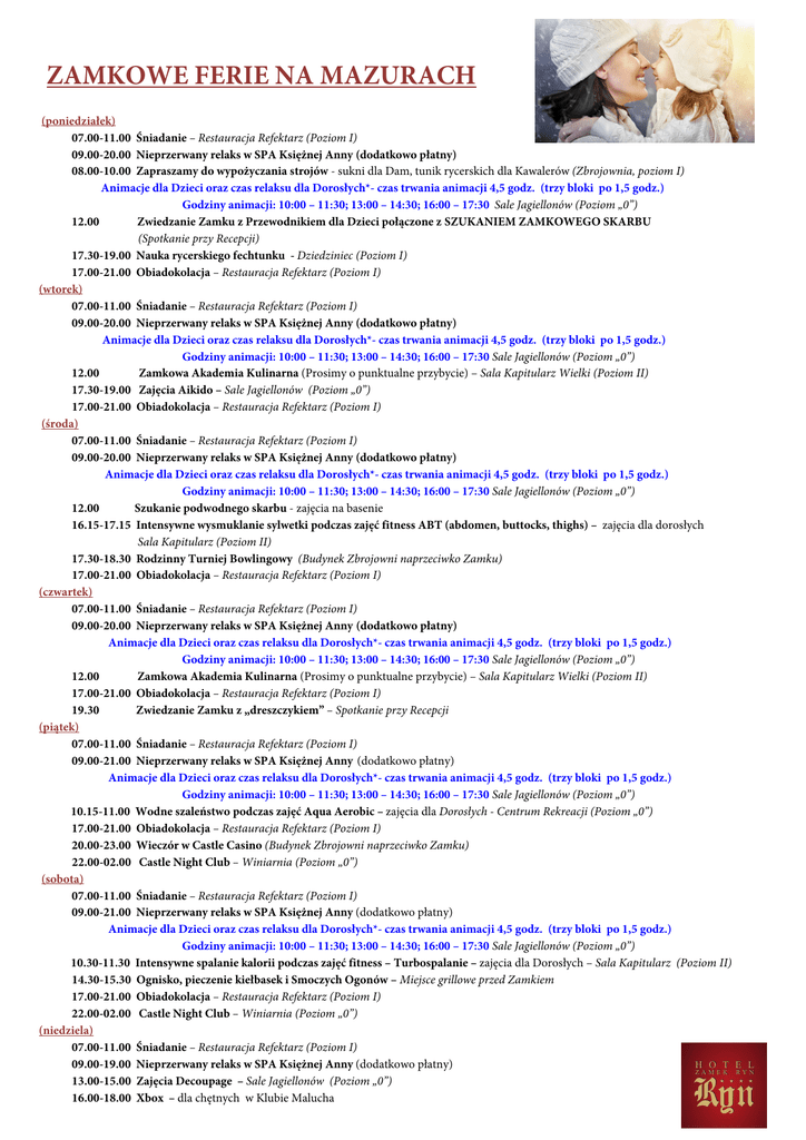 ZAMKOWE FERIE NA MAZURACH (poniedziałek) 07.00-11.00 Śniadanie – Restauracja Refektarz (Poziom I) 09.00-20.00 Nieprzerwany relaks w SPA Księżnej Anny (dodatkowo płatny) 08.00-10.00 Zapraszamy do wypożyczania strojów - sukni dla Dam, tunik rycerskich dla Kawalerów (Zbrojownia, poziom I) Animacje dla Dzieci oraz czas relaksu dla Dorosłych*- czas trwania animacji 4,5 godz. (trzy bloki po 1,5 godz.) Godziny animacji: 10:00 – 11:30; 13:00 – 14:30; 16:00 – 17:30 Sale Jagiellonów (Poziom „0”) 12.00 Zwiedzanie Zamku z Przewodnikiem dla Dzieci połączone z SZUKANIEM ZAMKOWEGO SKARBU (Spotkanie przy Recepcji) 17.30-19.00 Nauka rycerskiego fechtunku - Dziedziniec (Poziom I) 17.00-21.00 Obiadokolacja – Restauracja Refektarz (Poziom I) (wtorek) 07.00-11.00 Śniadanie – Restauracja Refektarz (Poziom I) 09.00-20.00 Nieprzerwany relaks w SPA Księżnej Anny (dodatkowo płatny) Animacje dla Dzieci oraz czas relaksu dla Dorosłych*- czas trwania animacji 4,5 godz. (trzy bloki po 1,5 godz.) Godziny animacji: 10:00 – 11:30; 13:00 – 14:30; 16:00 – 17:30 Sale Jagiellonów (Poziom „0”) 12.00 Zamkowa Akademia Kulinarna (Prosimy o punktualne przybycie) – Sala Kapitularz Wielki (Poziom II) 17.30-19.00 Zajęcia Aikido – Sale Jagiellonów (Poziom „0”) 17.00-21.00 Obiadokolacja – Restauracja Refektarz (Poziom I) (środa) 07.00-11.00 Śniadanie – Restauracja Refektarz (Poziom I) 09.00-20.00 Nieprzerwany relaks w SPA Księżnej Anny (dodatkowo płatny) Animacje dla Dzieci oraz czas relaksu dla Dorosłych*- czas trwania animacji 4,5 godz. (trzy bloki po 1,5 godz.) Godziny animacji: 10:00 – 11:30; 13:00 – 14:30; 16:00 – 17:30 Sale Jagiellonów (Poziom „0”) 12.00 Szukanie podwodnego skarbu - zajęcia na basenie 16.15-17.15 Intensywne wysmuklanie sylwetki podczas zajęć fitness ABT (abdomen, buttocks, thighs) – zajęcia dla dorosłych Sala Kapitularz (Poziom II) 17.30-18.30 Rodzinny Turniej Bowlingowy (Budynek Zbrojowni naprzeciwko Zamku) 17.00-21.00 Obiadokolacja – Restauracja Refektarz (Poziom I) (czwartek) 07.00-11.00 Śniadanie – Restauracja Refektarz (Poziom I) 09.00-20.00 Nieprzerwany relaks w SPA Księżnej Anny (dodatkowo płatny) Animacje dla Dzieci oraz czas relaksu dla Dorosłych*- czas trwania animacji 4,5 godz. (trzy bloki po 1,5 godz.) Godziny animacji: 10:00 – 11:30; 13:00 – 14:30; 16:00 – 17:30 Sale Jagiellonów (Poziom „0”) 12.00 Zamkowa Akademia Kulinarna (Prosimy o punktualne przybycie) – Sala Kapitularz Wielki (Poziom II) 17.00-21.00 Obiadokolacja – Restauracja Refektarz (Poziom I) 19.30 Zwiedzanie Zamku z „dreszczykiem” – Spotkanie przy Recepcji (piątek) 07.00-11.00 Śniadanie – Restauracja Refektarz (Poziom I) 09.00-21.00 Nieprzerwany relaks w SPA Księżnej Anny (dodatkowo płatny) Animacje dla Dzieci oraz czas relaksu dla Dorosłych*- czas trwania animacji 4,5 godz. (trzy bloki po 1,5 godz.) Godziny animacji: 10:00 – 11:30; 13:00 – 14:30; 16:00 – 17:30 Sale Jagiellonów (Poziom „0”) 10.15-11.00 Wodne szaleństwo podczas zajęć Aqua Aerobic – zajęcia dla Dorosłych - Centrum Rekreacji (Poziom „0”) 17.00-21.00 Obiadokolacja – Restauracja Refektarz (Poziom I) 20.00-23.00 Wieczór w Castle Casino (Budynek Zbrojowni naprzeciwko Zamku) 22.00-02.00 Castle Night Club – Winiarnia (Poziom „0”) (sobota) 07.00-11.00 Śniadanie – Restauracja Refektarz (Poziom I) 09.00-21.00 Nieprzerwany relaks w SPA Księżnej Anny (dodatkowo płatny) Animacje dla Dzieci oraz czas relaksu dla Dorosłych*- czas trwania animacji 4,5 godz. (trzy bloki po 1,5 godz.) Godziny animacji: 10:00 – 11:30; 13:00 – 14:30; 16:00 – 17:30 Sale Jagiellonów (Poziom „0”) 10.30-11.30 Intensywne spalanie kalorii podczas zajęć fitness – Turbospalanie – zajęcia dla Dorosłych – Sala Kapitularz (Poziom II) 14.30-15.30 Ognisko, pieczenie kiełbasek i Smoczych Ogonów – Miejsce grillowe przed Zamkiem 17.00-21.00 Obiadokolacja – Restauracja Refektarz (Poziom I) 22.00-02.00 Castle Night Club – Winiarnia (Poziom „0”) (niedziela) 07.00-11.00 Śniadanie – Restauracja Refektarz (Poziom I) 09.00-19.00 Nieprzerwany relaks w SPA Księżnej Anny (dodatkowo płatny) 13.00-15.00 Zajęcia Decoupage – Sale Jagiellonów (Poziom „0”) 16.00-18.00 Xbox – dla chętnych w Klubie Malucha 17.00-21.00 Obiadokolacja – Restauracja Refektarz (Poziom I) * Czas relaksu dla Dorosłych – Dzieciom dedykujemy Animatora w Bajkogrodzie, zaś Dorosłych serdecznie zapraszamy do korzystania z Centrum Rekreacyjno - Wypoczynkowego (basen z widokiem na kominek, sauny), Sali Fitness . Uwaga : miejsce realizacji zajęć może ulec zmianie UPRZEJMIE INFORMUJEMY, IŻ DOBA HOTELOWA ROZPOCZYNA SIĘ O GODZ. 16.00. NAUKA GRY W GOLFA – godziny i dni do ustalenia w Hotelu ZAMEK RYN**** podczas pobytu . (Uwaga! Ilość miejsc ograniczona – 1 godz. - max 2 Osoby ) - kontakt Tel. 660 411 670. USŁUGI DODATKOWE BEZPŁATNE DLA GOŚCI HOTELU ZAMEK RYN**** *Możliwość wypożyczenia sanek (Informacja na Recepcji Basenu) * KLUB MALUCHA – działa przez całe ferie; do dyspozycji zabawki, materiały papiernicze, farby, kredki, wycinanki, gry planszowe * Zamkowa czytelnia (Antresola na Zamkowym Dziedzińcu) do dyspozycji Gości książki i gry planszowe * Plac zabaw dla dzieci * Korzystanie z Sali Fitness i stołu do tenisa w Zbrojowni (codziennie w godzinach 07.00 - 22.00) * Korzystanie z basenu i saun (codziennie w godzinach 8.00-22.00) * Wypożyczalnia sprzętu wędkarskiego, kijów do Nordic Walking (codziennie w godzinach 8.00-22.00 - rezerwacja - recepcja Basenu tel. 805) USŁUGI PŁATNE SYMULATOR GRY W GOLFA „ BO GOLF ELITE” Koszty (piątek- niedziela- święta) : 70 zł/brutto/godz./gra dla max 4 osób ; druga godz. wynajmu 60 zł/brutto ; trzecia godz. 50 zł/brutto. Koszty (poniedziałek-czwartek) : 50 zł/brutto/godz./gra dla max 4 osób ; druga godz. wynajmu 40 zł/brutto ; trzecia godz. 30 zł/brutto. Ww. cena obejmuje sprzęt gol