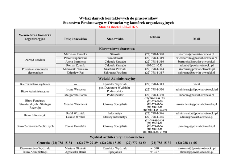 Wykaz danych kontaktowych do pracowników Starostwa Powiatowego w Otwocku wg komórek organizacyjnych Stan na dzień 01.06.2016 r. Wewnętrzna komórka organizacyjna Imię i nazwisko Telefon Stanowisko Mail Kierownictwo Starostwa Zarząd Powiatu Pozostałe stanowiska kierownicze Mirosław Pszonka Paweł Rupniewski Aneta Bartnicka Roman Zdunik Miłkowski Wiesław Zbigniew Rak Starosta Wicestarosta Członek Zarządu Członek Zarządu Skarbnik Powiatu Sekretarz Powiatu (22) 778-1-320 (22) 778-1-319 (22) 778-1-316 607-201-553 (22) 778-1-344 (22) 778-1-317 [email protected] [email protected] [email protected] [email protected] [email protected] [email protected] (22) 778-1-313 vacat (22) 778-1-330 [email protected] Wydział Administracyjny Kierownictwo wydziału Biuro Administracyjne --Iwona Wysocka Małgorzata Baran Dyrektor Wydziału p.o. Dyrektora Wydziału Podinspektor Podinspektor (22) 778-1-330 [email protected] [email protected] Biuro Funduszy Strukturalnych i Strategii Rozwoju Monika Wiechetek Główny Specjalista (22) 788-15-34 / 35 (22) 779-29-29 (22) 779-62-56 (22) 788-15-37 (22) 788-14-65 w. 379 Biuro Informatyki Rafał Woźniak Łukasz Wróbel Informatyk Starszy Informatyk (22) 778-1-346 (22) 778-1-346 [email protected] [email protected] Główny Specjalista (22) 788-15-34/35 (22) 779-29-29 (22) 779-62-56 (22) 788-15-37 (22) 788-14-65 w. 378 [email protected] Biuro Zamówień Publicznych Teresa Kowalska Wydział Architektury i Budownictwa Centrala (22) 788-15-34 Kierownictwo Wydziału Biuro Administracji (22) 779-29-29 (22) 788-15-35 Mariusz Okoński Agnieszka Bania (22) 779-62-56 Dyrektor Wydziału Specjalista (22) 788-15-37 w. 370 w. 377 (22) 788-14-65 [email protected] [email protected] Architektoniczno-Budowlanej Biuro Obsługi Wydziału Małgorzata Boruc Małgorzata Jesiotr Podinspektor Inspektor w. 377 w. 373 Jan Kwiatkowski Główny Specjalista w. 374 --Milena Piotrowska-Witak Mariusz Rombel Joanna Gołębiewska Paweł Trzaskowski Specjalista Inspektor Główny Specjalista Specjalista Specjalista w. 374 w. 373 w. 372 w. 376 w. 372 Antonina Mazek Główny Specjalista w. 371 [email protected] [email protected] [email protected] vacat [email protected] [email protected] [email protected] [email protected] [email protected] [email protected] Wydział Finansowy Kierownictwo Wydziału Małgorzata Komosa Bożena Jarosz Łukasz Jobda Elwira Kurek Edyta Kośmicka Katarzyna Żuławnik Główny Księgowy Starostwa Powiatowego Podinspektor Podinspektor Inspektor Specjalista Podinspektor Biuro Budżetu Stanowisko ds. Płac Stanowisko ds. Sprawozdawczości (22) 778-1-329 [email protected] (22) 778-1-312 (22) 778-1-382 (22) 778-1-340 (22) 778-1-314 (22) 778-1-314 [email protected] [email protected] [email protected] Urlop macierzyński [email protected] [email protected] Monika Skolmowska-Pabian Specjalista (22) 788-15-34 / 35 (22) 779-62-56 (22) 788-15-37 (22) 788-14-65 w. 389 Iwona Renis Agnieszka Sielska Wanda Stańczak Grażyna Sosnowska Inspektor Główny Specjalista Inspektor Inspektor (22) 778-1-314 (22) 778-1-342 (22) 778-1-314 (22) 778-1-340 [email protected] [email protected] [email protected] [email protected] Aneta Piłka Inspektor (22) 778-1-312 [email protected] Wydział Geodezji i Kartografii Centrala (22) 788-15-34 (22) 779-29-29 (22) 788-15-35 Jacek Kossowski Kierownictwo Wydziału Krystyna Gołębiowska-Cyra Mieczysław Mazek (22) 779-62-56 Geodeta Powiatowy Zastępca Dyrektora Wydziału Kierownik Powiatowego Ośrodka Dokumentacji (22) 788-15-37 (22) 788-14-65 w. 390 [email protected] w. 391 [email protected] (22) 778-1-380 [email protected] - Biuro Ewidencji Gruntów i Budynków Biuro Obsługi Wydziału Powiatowym Ośrodek Dokumentacji Geodezyjnej i Kartograficznej Joanna Bąk Iwona Falska Katarzyna Kajka Katarzyna Kowalska Beata Kuciak Katarzyna Miturska Karina Młynarczyk Ewa Smolińska Ilona Sokołowska Monika Rygas Marlena Łuczak Geodezyjnej i Kartograficznej Podinspektor Inspektor Główny Specjalista Podinspektor Podinspektor Inspektor Specjalista Główny Specjalista Inspektor Inspektor Inspektor w. 397 w. 398 w. 394 w. 398 w. 397 w. 396 w. 395 w. 392 w. 395 w. 394 w. 395 Danuta Kwiatkowska Starszy Specjalista (22) 778-1-328 Michał Morawski Andrzej Jejer Starszy Informatyk Inspektor Kontroli Dokumentacji Geodezyjnej i Kartograficznej Geodeta Geodeta Geodeta Geodeta Geodeta Inspektor Kontroli Dokumentacji Geodezyjnej i Kartograficznej Specjalista Główny Specjalista (22) 778-1-328 [email protected] [email protected] [email protected] [email protected] [email protected] [email protected] [email protected] [email protected] [email protected] [email protected] [email protected] [email protected] [email protected] (22) 788-1-382 - (22) 778-1-381 (22) 778-1-381 (22) 778-1-381 (22) 778-1-381 (22) 778-1-381 - (22) 778-1-384 vacat (22) 778-1-381 (22) 778-1-341 [email protected] Anna Hutnik Iwona Jędrzejczak Małgorzata Tywanek Renata Papis Rafał Pyza --Janina Zawada Krzysztof Wąsowski Wydział Gospodarki Nieruchomościami Centrala (22) 788-15-34 Kierownictwo Wydziału (22) 779-29-29 (22) 788-15-35 (22) 779-62-56 (22) 788-15-37 Monika Pokrywczyńska Dyrektor Wydziału w. 365 --Piotr Przybysz Magdalena Trzapałka Ilona Rosłoniec Inspektor Inspektor Specjalista Inspektor w. 361 w. 362 w. 362 w. 362 (22) 788-14-65 [email protected] vacat urlop bezpłatny [email protected] [email protected] Biuro Wywłaszczeń, Odszkodowań i Zwrotów Wywłaszczonych Nieruchomości Stanowisko do spraw Obsługi Wydziału Lidia Podczaska-Szymańska Inspektor w. 364 [email protected] Elżbieta Wieremiejczyk Inspektor w. 363 [email protected] Adriana Nejman Specjalista w. 361 [email protected] Dyrektor Wydziału p.o. Zastępcy Dyrektora Wydziału (22) 778-1-351 [email protected] (22) 778-1-351 [email protected] Erazm Bodalski Podinspektor (22) 778-1-331 Grażyna Budyta Dorota Cacko Ewa Melaniuk Sylwia Strzeżek Jolanta Pietryka Ewa Prusińska Ewa Wojtczak Adriana Kowalewska Podinspektor Po
