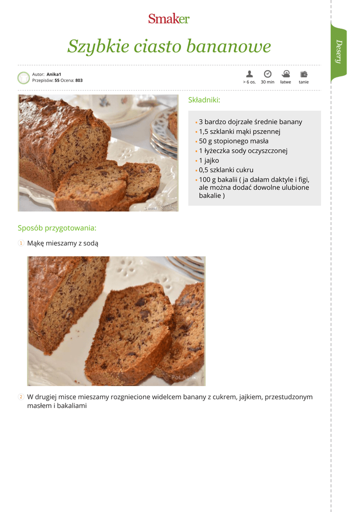 Szybkie ciasto bananowe Autor: Anika1 Przepisów: 55 Ocena: 803 > 6 os. 30 min łatwe tanie Składniki: 3 bardzo dojrzałe średnie banany 1,5 szklanki mąki pszennej 50 g stopionego masła 1 łyżeczka sody oczyszczonej 1 jajko 0,5 szklanki cukru 100 g bakalii ( ja dałam daktyle i figi, ale można dodać dowolne ulubione bakalie ) Sposób przygotowania: 1 Mąkę mieszamy z sodą 2 W drugiej misce mieszamy rozgniecione widelcem banany z cukrem, jajkiem, przestudzonym masłem i bakaliami 3 Do mokrej masy dodajemy mąkę i szybko, ale dokładnie mieszamy 4 Ciasto przekładamy do keksówki o rozmiarze 25x12 cm i pieczemy w piekarniku nagrzanym do 180 stopni przez ok 60 minut. Ciasto powinno zbrązowieć 5 Po upieczeniu wyjmujemy z piekarnika i studzimy 6 Zapraszam na mojego bloga. Link poniżej Twoje notatki do przepisu: