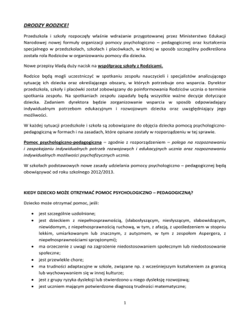 DRODZY RODZICE! Przedszkola i szkoły rozpoczęły właśnie wdrażanie przygotowanej przez Ministerstwo Edukacji Narodowej nowej formuły organizacji pomocy psychologiczno – pedagogicznej oraz kształcenia specjalnego w przedszkolach, szkołach i placówkach, w której w sposób szczególny podkreślona została rola Rodziców w organizowaniu pomocy dla dziecka. Nowe przepisy kładą duży nacisk na współpracę szkoły z Rodzicami. Rodzice będą mogli uczestniczyć w spotkaniu zespołu nauczycieli i specjalistów analizującego sytuację ich dziecka oraz określającego obszary, w których potrzebuje ono wsparcia. Dyrektor przedszkola, szkoły i placówki został zobowiązany do poinformowania Rodziców ucznia o terminie spotkania zespołu. Na spotkaniach zespołu zapadały będą wszystkie ważne decyzje dotyczące dziecka. Zadaniem dyrektora będzie zorganizowanie wsparcia w sposób odpowiadający indywidualnym potrzebom edukacyjnym i rozwojowym dziecka oraz uwzględniający jego możliwości. W każdej sytuacji przedszkole i szkoła są zobowiązane do objęcia dziecka pomocą psychologicznopedagogiczną w formach i na zasadach, które opisane zostały w rozporządzeniu w tej sprawie. Pomoc psychologiczno-pedagogiczna – zgodnie z rozporządzeniem – polega na rozpoznawaniu i zaspokajaniu indywidualnych potrzeb rozwojowych i edukacyjnych ucznia oraz rozpoznawaniu indywidualnych możliwości psychofizycznych ucznia. W szkołach podstawowych nowe zasady udzielania pomocy psychologiczno – pedagogicznej będą obowiązywać od roku szkolnego 2012/2013. KIEDY DZIECKO MOŻE OTRZYMAĆ POMOC PSYCHOLOGICZNO – PEDAGOGICZNĄ? Dziecko może otrzymać pomoc, jeśli: jest szczególnie uzdolnione; jest dzieckiem z niepełnosprawnością, (słabosłyszącym, niesłyszącym, słabowidzącym, niewidomym, z niepełnosprawnością ruchową, w tym, z afazją, z upośledzeniem w stopniu lekkim, umiarkowanym lub znacznym, z autyzmem, w tym z zespołem Aspergera, z niepełnosprawnościami sprzężonymi); ma orzeczenie z uwagi na zagrożenie niedostosowaniem społecznym lub niedostosowanie społeczne; jest przewlekle chore; ma trudności adaptacyjne w szkole, związane np. z wcześniejszym kształceniem za granicą lub wychowywaniem się w innej kulturze; jest z grupy ryzyka dysleksji lub stwierdzono u niego dysleksję rozwojową; jest uczniem mającym potwierdzone diagnozą trudności matematyczne; 1 ma zaburzenia komunikacji językowej (np. problem z artykulacją niektórych głosek, zaburzenia płynności, tempa mowy, problem w tworzeniu dłuższych wypowiedzi); znalazło się w sytuacji kryzysowej lub traumatycznej; dotykają go niepowodzenia edukacyjne; pojawiły się trudności środowiskowe, związane z sytuacją bytową, sposobem spędzania czasu wolnego, kontaktami społecznymi itp.; ma orzeczenie o potrzebie indywidualnego nauczania lub orzeczenie o potrzebie indywidualnego rocznego przygotowania przedszkolnego i jest w sytuacji wymagającej dodatkowego wsparcia; ma innego rodzaju trudności wpływające na jego funkcjonowanie w szkole i nauczyciele zdecydują, że należy mu pomóc – wtedy żaden dokument nie jest potrzebny. Dla każdego z takich dzieci dyrektor szkoły będzie powoływał zespół, w którego pracach mają prawo uczestniczyć rodzice danego ucznia. Dyrektor ma obowiązek zawiadomienia i zaproszenia rodzica na spotkanie zespołu ds. pomocy psychologiczno – pedagogicznej, powołanego dla danego ucznia. Udział rodziców w spotkaniu zespołu jest DOBROWOLNY. Pomoc psychologiczno-pedagogiczna w przedszkolu, szkole i placówce jest udzielana z inicjatywy: 1) ucznia; 2) rodziców ucznia; 3) nauczyciela, wychowawcy grupy wychowawczej lub specjalisty, prowadzącego zajęcia uczniem; z 4) poradni psychologiczno-pedagogicznej, w tym poradni specjalistycznej; 5) asystenta edukacji romskiej; 6) pomocy nauczyciela. Jak wynika z rozporządzenia rodzic wymieniony jest wśród osób upoważnionych do inicjowania pomocy psychologiczno-pedagogicznej. Oznacza to, że jeśli zauważycie Państwo jakieś ważne potrzeby swojego dziecka, możecie zgłosić to nauczycielowi, wychowawcy lub specjaliście prowadzącemu z jego dzieckiem zajęcia (np. psychologowi, pedagogowi czy logopedzie). Nauczyciele, wychowawcy i specjaliści są zobligowani do przekazywania takich informacji dyrektorowi od razu po ich uzyskaniu. Taki tryb ma zapewnić uczniom możliwość uzyskania wsparcia niemal natychmiast, w momencie kiedy zauważone, rozpoznane i określone zostaną specjalne potrzeby edukacyjne ucznia. Jednocześnie należy mieć świadomość, że nie wszystkie zgłoszone wnioski rodziców o objęcie ucznia pomocą psychologiczno – pedagogiczną będą rozpatrzone pozytywnie. Po otrzymaniu przez 2 dyrektora informacji o specjalnych potrzebach edukacyjnych dziecka, powołuje on zespół nauczycieli i specjalistów pracujących z danym dzieckiem, który w określonym czasie dokonuje weryfikacji zgłoszonych przez rodzica potrzeb i podejmuje decyzję o objęciu, bądź braku postaw do objęcia określoną formą pomocy psychologiczno- pedagogicznej danego ucznia. Rodzice! jeśli chcecie, aby Wasze dziecko miało zorganizowaną właściwą pomoc ważne jest, aby jak najszybciej dostarczyć do szkoły orzeczenie lub opinię poradni psychologiczno-pedagogicznej – to pomoże w planowaniu pomocy i usprawni jej organizację! Dyrektor szkoły niezwłocznie po złożeniu przez Państwa opinii z poradni psychologiczno – pedagogicznej powoła zespół, w skład którego wejdą nauczyciele i specjaliści pracujący z Waszym dzieckiem w szkole. Dyrektor powiadomi Państwa o terminie spotkania zespołu. Jak już zostało wspomniane wcześniej, możecie Państwo uczestniczyć w spotkaniu zespołu. Możecie również, jako rodzice, wnioskować do dyrektora szkoły o zaproszenie na posiedzenie zespołu osób, które dotychczas pracowały z Waszym dzieckiem (trenera, terapeutę pedagogicznego, lekarza) i posi