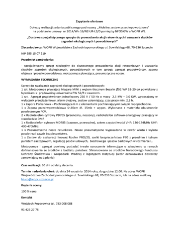 Zapytanie ofertowe Dotyczy realizacji zadania publicznego pod nazwą „Mobilny zestaw przeciwpowodziowy” na podstawie umowy nr 2014/Wn 16/NZ-UR-LZ/D pomiędzy NFOŚiGW a WOPR WZ. „Dostawa specjalistycznego sprzętu do prowadzenia akcji ratowniczych i usuwania skutków zagrożeń ekologicznych i powodziowych” Zleceniodawca: WOPR Województwa Zachodniopomorskiego ul. Sowińskiego 68, 70-236 Szczecin NIP 955 15 07 219 Przedmiot zamówienia: - specjalistyczny sprzęt niezbędny do skutecznego prowadzenia akcji ratowniczych i usuwania skutków zagrożeń ekologicznych, powodziowych w tym sprzęt: agregat prądotwórczy, zapora olejowa i przeciwpowodziowa, motopompa pływająca, pneumatyczne nosze. WYMAGANIA TECHNICZNE Sprzęt do zwalczania zagrożeń ekologicznych i powodziowych: 1 szt. Motopompa pływająca Niagara MINI z wężem tłocznym Bezalin Ø52 WP 52-20-ŁA powlekany z łącznikami z prądownicą uniwersalna PW 52/R z zaworem. 1 szt. Agregat prądotwórczy jednofazowy 230 V / 50 Hz o mocy 2,5 KW – 3,0 KW, wyposażony w wyłącznik przeciążeniowy, alarm olejowy, zestaw uziemiający, czas pracy min. 2,3 h. 1 x Zapora Parkanowa – Pochłaniająca 6 m z elementami pochłaniającymi związki ropopochodne. 1 x Zapora przeciwpowodziowa śr.40cm dł. 15mb + wypos. Wykonana z materiału obustronnie powleczonym PCV. 2 x Radiotelefon cyfrowy PD705 (przenośny, noszony), radiotelefon cyfrowo-analogowy pracujący w standardzie DMR 1 x Radiotelefon cyfrowy MD785 (bazowe, przewoźne), zakres częstotliwości VHF: 136-174MHz UHF: 400-470MHz. 1 x Pneumatyczne nosze ratunkowe. Nosze pneumatyczne wyposażone w zawór wlotu i wylotu powietrza i zawór bezpieczeństwa. 1 x Zestaw do asekuracji linowej Roofer PRO/20, szelki bezpieczeństwa P70 z przednim i tylnym punktem zaczepowym, regulacją pasów udowych, biodrowego i pasów barkowych w rozmiarze L. Motopompa i agregat powinny posiadać trwałe oznaczenie informujące o zakupieniu w ramach dofinansowania ze środków z budżetu państwa: Sfinansowano ze środków Narodowego Funduszu Ochrony Środowiska i Gospodarki Wodnej z logotypem Instytucji (wzór oznakowania dostarczy zamawiający na żądania) Czas realizacji: 30 dni od daty zlecenia. Termin nadsyłania ofert: do dnia 24 września 2014 roku, do godziny 12.00. Na adres WOPR Województwa Zachodniopomorskiego ul. Sowińskiego 68, 70-236 Szczecin, lub na adres mailowy: [email protected] Kryteria oceny: 100 % cena Kontakt Wojciech Reperowicz tel. 783 008 088 91 425 27 78