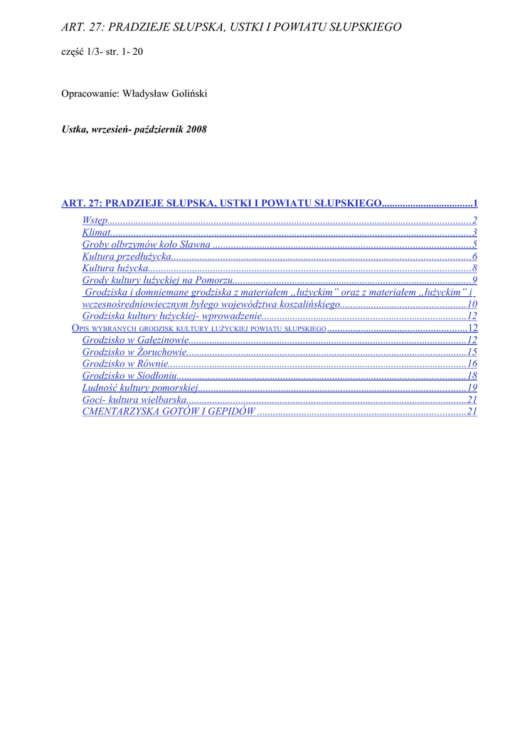 ART. 27: PRADZIEJE SŁUPSKA, USTKI I POWIATU SŁUPSKIEGO część 1/3- str. 1- 20 Opracowanie: Władysław Goliński Ustka, wrzesień- październik 2008 ART. 27: PRADZIEJE SŁUPSKA, USTKI I POWIATU SŁUPSKIEGO...................................1 Wstęp............................................................................................................................................2 Klimat...........................................................................................................................................3 Groby olbrzymów koło Sławna ...................................................................................................5 Kultura przedłużycka...................................................................................................................6 Kultura łużycka............................................................................................................................8 Grody kultury łużyckiej na Pomorzu............................................................................................9 Grodziska i domniemane grodziska z materiałem „łużyckim” oraz z materiałem „łużyckim” i wczesnośredniowiecznym byłego województwa koszalińskiego................................................10 Grodziska kultury łużyckiej- wprowadzenie...............................................................................12 OPIS WYBRANYCH GRODZISK KULTURY ŁUŻYCKIEJ POWIATU SŁUPSKIEGO ......................................................12 Grodzisko w Gałęzinowie...........................................................................................................12 Grodzisko w Żoruchowie............................................................................................................15 Grodzisko w Równie...................................................................................................................16 Grodzisko w Siodłoniu...............................................................................................................18 Ludność kultury pomorskiej.......................................................................................................19 Goci- kultura wielbarska............................................................................................................21 CMENTARZYSKA GOTÓW I GEPIDÓW ................................................................................21 Art. nr 27 PRADZIEJE SŁUPSKA, USTKI I POWIATU SŁUPSKIEGO str. 2 Wstęp Na lokalnym rynku księgarskim jest jeszcze dostępna książka Józef Lindmajer, Teresa Machura, Zygmunt Szultka; DZIEJE USTKI, Słupsk 1985, której nakład nie jest jeszcze wyczerpany. Mimo, że książka ta jest wcale niezła to ma jednak wady, nie sięga dostatecznie daleko w przeszłość i nie tłumaczy należycie historii Pomorza, nie mówi o ludziach, ich korzeniach- ledwie o tym wspomina, brak szczegółowego omówienia wysiedleń 1945-1947, jest więc także konieczność uzupełnienia najnowszej historii miasta. Zdecydowałem się więc na podjęcie wezwania do napisania książki pt. PRADZIEJE SŁUPSKA, USTKI I POWIATU SŁUPSKIEGO. Traktuję ten tekst jako uzupełnienie do świetnej, wspominanej wyżej książki: Dzieje Ustki. Źródła niemieckie o charakterze propagandowym postaram się możliwie nie przytaczać. Postaram się poprzeć wywód pisany chociaż współczesnym zdjęciem albo rysunkiem, mapą. Władysław Goliński Art. nr 27 PRADZIEJE SŁUPSKA, USTKI I POWIATU SŁUPSKIEGO str. 3 Klimat Dopiero po całkowitym wycofaniu się lądolodu na teren obecnego Morza Bałtyckiego powsta ły ponownie warunki umożliwiające zasiedlenie ziem na południowym brzegu Bałtyku. Okres schył kowej pogody zimnej (od ok. 15 do 10 tys. lat temu) charakteryzował się kilkoma ociepleniami; prze dzielały je ochłodzenia, podczas których lądolód zatrzymywał się w różnych dzisiejszych regionach krajów bałtyckich i Skandynawii. Warstwy gliny wskazują, że w południowej Skanii wielkie top nienie lodu zaczęło się około 12 000 lat p.n.e., w środkowej Szwecji rozpoczęło się o około 3000 lat później i trwało przez następnych kilka tysięcy lat. 1 Wspomniane zmiany klimatyczne są dobrze znane dzięki profilom osadów organicznych (torfowisk), głównie na Niżu Polskim. Specjalne miejsce wśród tych profili zajmują osady jeziora Gościąż koło Bydgoszczy, w których pojedyncze warstewki (tzw. warstwy), odpowiadające kolejnym latom, pozwalają datować późne zmiany klimatu okresu zimnej pogody2. Woda, którą wchłonął lód lodowca miała oczywisty wpływ na poziom wody w morzach. Tak samo na poziom wód gruntowych ma „puchnięcie” powłoki gleby, z której został zdjęty ciężar lądo lodu. Do roku 3000 p.n.e. cały rejon (ATLANTYKU PÓŁNOCNEGO) podlegał wzrostowi temperatury i nazwany jest okresem optimum klimatycznego. Były to czasy ciepłej, wilgotnej pogody, kiedy granica lasu przesuwała się daleko na północ, na bezdrzewne obecnie pustkowia tundrowe Arktyki, a lód z całej powierzchni Morza Arktycznego znikał w ciągu lata. Od około roku 3000 p.n.e. aż do początków ery chrześcijańskiej pogoda na ogół psuła się nieustannie.3 Poziom wody w Bałtyku w ok. 2000 roku p.n.e. był wyższy od dzisiejszego o około 25-30 m o czym mówią obrazy naskalne w okręgu nadmorskim na granicy Szwecji i Norwegii np. w Tanum- w momencie powstania tych obrazów w tym miejscu znajdował się brzeg morza. Wydaje się, że około 500 roku p.n.e. nastąpiło nagłe i gwałtowne pogorszenie się warunków, które musiało być niemal katastrofalne w skutkach. Właśnie wtedy zostają opuszczone warowne grody znajdujące się w naszym regionie, są to grodziska kultury łużyckiej z epoki brązu, te najbliżej Ustki to Gałęzinowo i Żoruchowo. Informację o podróży Pyteasza na północ z Morza Śródziemnego odnotowuje kilka kronik no i mamy same zapisy Pyte