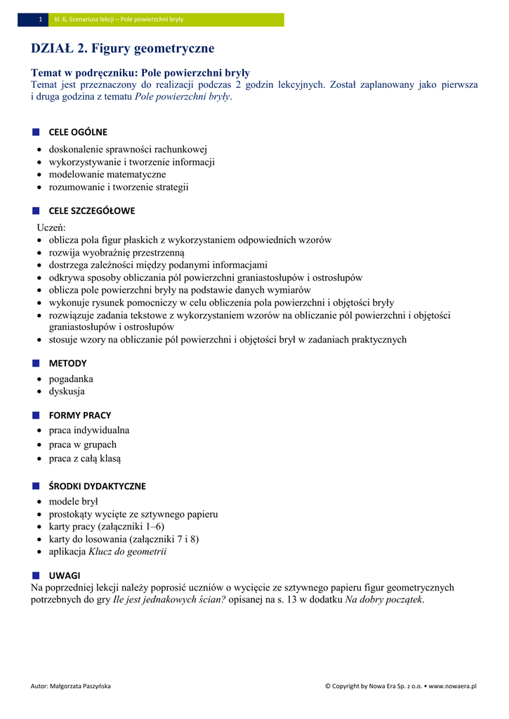 1 kl. 6, Scenariusz lekcji – Pole powierzchni bryły DZIAŁ 2. Figury geometryczne Temat w podręczniku: Pole powierzchni bryły Temat jest przeznaczony do realizacji podczas 2 godzin lekcyjnych. Został zaplanowany jako pierwsza i druga godzina z tematu Pole powierzchni bryły. CELE OGÓLNE doskonalenie sprawności rachunkowej wykorzystywanie i tworzenie informacji modelowanie matematyczne rozumowanie i tworzenie strategii CELE SZCZEGÓŁOWE Uczeń: oblicza pola figur płaskich z wykorzystaniem odpowiednich wzorów rozwija wyobraźnię przestrzenną dostrzega zależności między podanymi informacjami odkrywa sposoby obliczania pól powierzchni graniastosłupów i ostrosłupów oblicza pole powierzchni bryły na podstawie danych wymiarów wykonuje rysunek pomocniczy w celu obliczenia pola powierzchni i objętości bryły rozwiązuje zadania tekstowe z wykorzystaniem wzorów na obliczanie pól powierzchni i objętości graniastosłupów i ostrosłupów stosuje wzory na obliczanie pól powierzchni i objętości brył w zadaniach praktycznych METODY pogadanka dyskusja FORMY PRACY praca indywidualna praca w grupach praca z całą klasą ŚRODKI DYDAKTYCZNE modele brył prostokąty wycięte ze sztywnego papieru karty pracy (załączniki 1–6) karty do losowania (załączniki 7 i 8) aplikacja Klucz do geometrii UWAGI Na poprzedniej lekcji należy poprosić uczniów o wycięcie ze sztywnego papieru figur geometrycznych potrzebnych do gry Ile jest jednakowych ścian? opisanej na s. 13 w dodatku Na dobry początek. Autor: Małgorzata Paszyńska © Copyright by Nowa Era Sp. z o.o. • www.nowaera.pl 2 kl. 6, Scenariusz lekcji – Pole powierzchni bryły PRZEBIEG ZAJĘĆ Lekcja 1 Faza wprowadzająca (5 min) Temat lekcji: Pole powierzchni graniastosłupa Czynności organizacyjno-porządkowe. Sprawdzenie pracy domowej. Podanie tematu lekcji i omówienie jej przebiegu: Na tej lekcji nauczymy się obliczać pola powierzchni graniastosłupów. Będziemy stosować zdobytą wiedzę do rozwiązywania zadań związanych z sytuacjami codziennymi. Faza realizacyjna 1. Na dobry początek (7 min) Uczniowie czytają instrukcję gry Ile jest jednakowych ścian? ze s. 13 z dodatku Na dobry początek i wykonują ćwiczenie w 3- lub 4-osobowych grupach. Z prostokątów wyciętych w domu uczniowie składają kolejno siatki trzech brył: – prostopadłościanu o trzech różnych wymiarach, – prostopadłościanu o podstawie w kształcie kwadratu, – sześcianu. Po złożeniu każdej siatki uczniowie zapisują w zeszytach odpowiedzi na pytania: − Ile rodzajów ścian jest w tym prostopadłościanie? − Ile jest ścian poszczególnych rodzajów? Nauczyciel sprawdza, czy grupy poprawnie złożyły i opisały każdą z siatek. 2. Pole powierzchni graniastosłupa (20 min) Przed lekcją nauczyciel przygotowuje tyle kartek z załącznika 7, ile grup będzie tworzonych podczas zajęć. Każda grupa otrzymuje modele graniastosłupów (mogą to być opakowania przyniesione przez uczniów): prostopadłościanu o trzech różnych wymiarach, graniastosłupa o podstawie trójkątnej i graniastosłupa o podstawie sześciokątnej oraz karty pracy (załączniki 1–3) dotyczące tych brył. Karty te zawierają polecenia, których wykonanie pomoże uczniom ustalić sposób obliczania pól powierzchni graniastosłupów. Po wykonaniu zadań z kart pracy przedstawiciele grup losują jedną kartkę – z rysunkiem bryły lub czystą (załącznik 7). Jeśli przedstawiciel zespołu wylosował kartkę z rysunkiem, omawia na forum klasy rozwiązanie zadań z karty pracy dotyczącej wylosowanej bryły. W trakcie prezentacji pozostali uczniowie weryfikują swoje rozwiązania. Uczniowie wspólnie formułują treść notatki: Pole powierzchni całkowitej graniastosłupa jest równe sumie pól wszystkich ścian. 3. Rozwiązywanie zadań (8 min) Zad. 6 i 7 s. 130–131 – uczniowie rozwiązują zadania indywidualnie. Wybrani uczniowie zapisują na tablicy swoje rozwiązanie, pozostali uczniowie sprawdzają je i omawiają. Faza podsumowująca (5 min) Uczniowie odpowiadają na pytanie: W jakich innych sytuacjach z życia codziennego niż przedstawione w zadaniach 6 i 7 może być przydatna umiejętność obliczania pola powierzchni graniastosłupa? Podajcie kilka przykładów. Ocena pracy uczniów na lekcji. Zadanie pracy domowej. Zad. 1, 2 i 4 s. 129–130 z podręcznika. Zad. 2 s. 81 w zeszycie ćwiczeń (zad. 1 s. 88 w zeszycie Radzę sobie coraz lepiej). Dla chętnych: Dla dociekliwych s. 83 w zeszycie ćwiczeń. Autor: Małgorzata Paszyńska © Copyright by Nowa Era Sp. z o.o. • www.nowaera.pl 3 kl. 6, Scenariusz lekcji – Pole powierzchni bryły Lekcja 2 Faza wprowadzająca (5 min) Temat lekcji: Pole powierzchni ostrosłupa Czynności organizacyjno-porządkowe. Sprawdzenie pracy domowej. Podanie tematu lekcji i omówienie jej przebiegu: Na tej lekcji nauczymy się obliczać pola powierzchni ostrosłupów oraz będziemy rozwiązywać zadania tekstowe dotyczące obliczania powierzchni tych brył. 1. Przypomnienie wzorów na pola wielokątów Uczniowie odpowiadają na pytania: − Jakie figury mogą być podstawami ostrosłupów? − Jakie są wzory na obliczanie pól powierzchni tych figur? (5 min) 2. Pole powierzchni ostrosłupa (20 min) Przed lekcją nauczyciel przygotowuje tyle kartek z załącznika 8, ile grup będzie tworzonych podczas zajęć. Każda grupa otrzymuje karty pracy (załączniki 4–6). Zawierają one polecenia, których wykonanie pomoże uczniom ustalić sposób obliczania pól powierzchni ostrosłupów. Uczniowie mogą korzystać z modeli ostrosłupów złożonych z siatek z zestawu Kluczowe pomoce dydaktyczne. Po wykonaniu zadań z kart pracy przedstawiciele grup losują jedną kartkę – z rysunkiem bryły lub czystą (załącznik 8). Jeśli przedstawiciel zespołu wylosował kartkę z rysunkiem, omawia na forum klasy rozwiązanie zadań z karty pracy dotyczącej wylosowanej bryły. Nauczyciel, korzystając z 