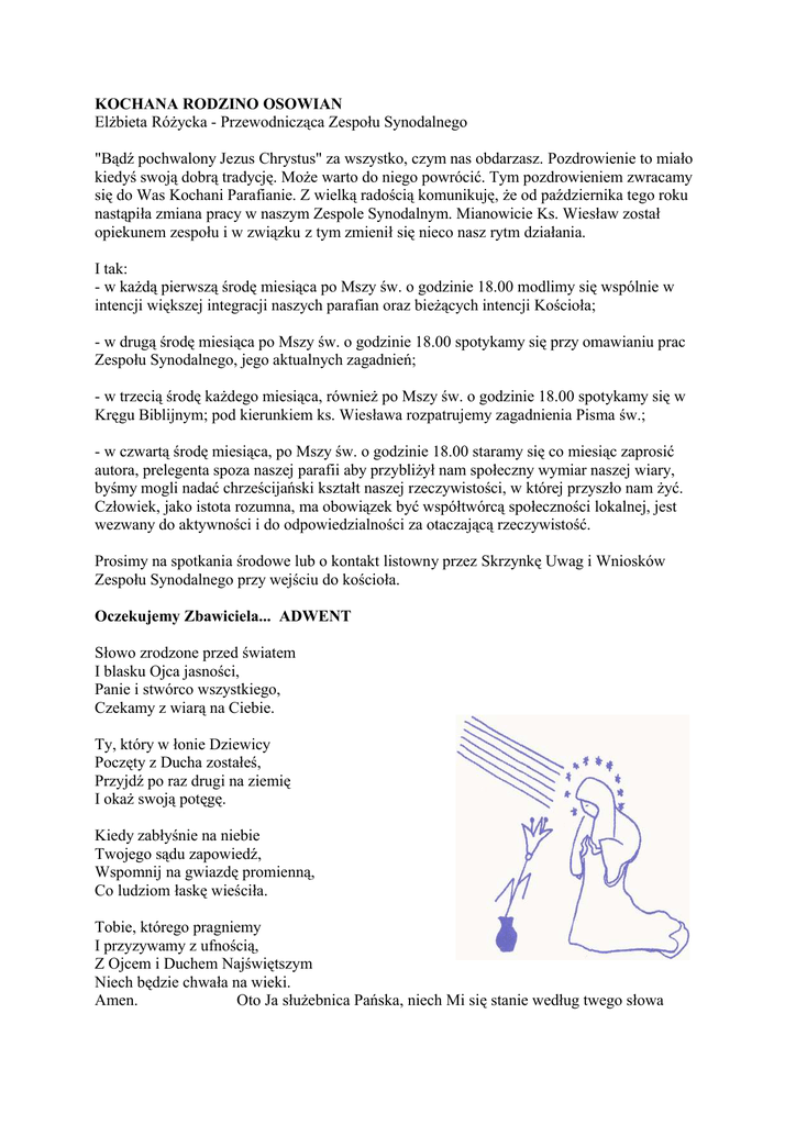KOCHANA RODZINO OSOWIAN Elżbieta Różycka - Przewodnicząca Zespołu Synodalnego "Bądź pochwalony Jezus Chrystus" za wszystko, czym nas obdarzasz. Pozdrowienie to miało kiedyś swoją dobrą tradycję. Może warto do niego powrócić. Tym pozdrowieniem zwracamy się do Was Kochani Parafianie. Z wielką radością komunikuję, że od października tego roku nastąpiła zmiana pracy w naszym Zespole Synodalnym. Mianowicie Ks. Wiesław został opiekunem zespołu i w związku z tym zmienił się nieco nasz rytm działania. I tak: - w każdą pierwszą środę miesiąca po Mszy św. o godzinie 18.00 modlimy się wspólnie w intencji większej integracji naszych parafian oraz bieżących intencji Kościoła; - w drugą środę miesiąca po Mszy św. o godzinie 18.00 spotykamy się przy omawianiu prac Zespołu Synodalnego, jego aktualnych zagadnień; - w trzecią środę każdego miesiąca, również po Mszy św. o godzinie 18.00 spotykamy się w Kręgu Biblijnym; pod kierunkiem ks. Wiesława rozpatrujemy zagadnienia Pisma św.; - w czwartą środę miesiąca, po Mszy św. o godzinie 18.00 staramy się co miesiąc zaprosić autora, prelegenta spoza naszej parafii aby przybliżył nam społeczny wymiar naszej wiary, byśmy mogli nadać chrześcijański kształt naszej rzeczywistości, w której przyszło nam żyć. Człowiek, jako istota rozumna, ma obowiązek być współtwórcą społeczności lokalnej, jest wezwany do aktywności i do odpowiedzialności za otaczającą rzeczywistość. Prosimy na spotkania środowe lub o kontakt listowny przez Skrzynkę Uwag i Wniosków Zespołu Synodalnego przy wejściu do kościoła. Oczekujemy Zbawiciela... ADWENT Słowo zrodzone przed światem I blasku Ojca jasności, Panie i stwórco wszystkiego, Czekamy z wiarą na Ciebie. Ty, który w łonie Dziewicy Poczęty z Ducha zostałeś, Przyjdź po raz drugi na ziemię I okaż swoją potęgę. Kiedy zabłyśnie na niebie Twojego sądu zapowiedź, Wspomnij na gwiazdę promienną, Co ludziom łaskę wieściła. Tobie, którego pragniemy I przyzywamy z ufnością, Z Ojcem i Duchem Najświętszym Niech będzie chwała na wieki. Amen. Oto Ja służebnica Pańska, niech Mi się stanie według twego słowa Pan jest blisko ... DROGA ... Ks. Bogdan Lipski Życie związane jest z drogą. Z drogą do szkoły, do pracy, do domu, do Boga. Nieustannie jesteśmy w drodze. Szukamy ciągle nowych dróg, lepszych i nowszych rozwiązań. W trudnościach i kłopotach ważna jest droga prowadząca do ich rozwiązania i przezwyciężenia. Wielość dróg - to wielość wyborów. Nieobca jest również droga powołania: do życia w małżeństwie, kapłaństwie, droga powołania zakonnego, czy życia w instytucjach świeckich. Pośród szerokiego wachlarza wyboru dróg, dla człowieka wierzącego ważna jest droga prowadząca do Boga. W jednej z końcowych scen filmu "Pokuta" ukazana jest staruszka idąca wąską, kamienistą drogą. Ta droga kiedyś prowadziła do cerkwi, ale cerkiew już dawno została zniszczona. Owa staruszka pyta: Czy ta droga prowadzi do cerkwi? Słyszy odpowiedź: -Nie! Słusznie mówi dalej: To po co ta droga, która nie prowadzi do Boga!? Okres Adwentu, to czas wejścia na właściwą drogę, którą przygotował nam Pan. Kroczenie właściwą drogą daje większą gwarancję odnalezienia Boga. Bóg jest nieustannie w drodze do człowieka, a on powinien znajdować się w drodze do Boga. To On staje się wypełnieniem ludzkich pragnień, tęsknot i oczekiwań. Jezus Chrystus, Syn Boży jest naszym oczekiwaniem, naszą drogą wiodącą od śmierci do życia, z ludzkich bezdroży do radości przyjaźni. Prostowanie życiowych dróg - to wielki wysiłek współpracy człowieka z Bogiem, to nieustanne poszukiwanie Go i radość odnajdywania, to niwelowanie wyniosłości swojej pychy, to -według świętego Pawła - troska o to, by być czystym i bez zarzutu na dzień Chrystusa. Trudna to jest praca. Nie wszyscy rozumieją potrzebę wejścia na drogę do Boga i dlatego wytyczają sobie własne, na których Bóg jest im niepotrzebny. Wchodzą na drogę zła, grzechu, niewierności, a ta prowadzi donikąd. Więc uporczywie powtarzajmy za ową staruszką: To po co ta droga, która nie prowadzi do Boga?! W prostowaniu naszych dróg niech pomoże nam Niepokalana, która zawsze wskazuje właściwy kierunek w szukaniu drogi do Boga. Natomiast prorok czasu adwentowego przygotowania - Jan Chrzciciel - niech ciągle wskazuje na to, co jest moim pierwszorzędnym celem. Po wyborach... Myśląc, Ojczyzna... Karol Wojtyła Ojczyzna - kiedy myślę - wówczas wyrażam siebie i zakorzeniam, mówi mi o tym serce, jakby ukryta granica, która ze mnie przebiega ku innym, aby wszystkich ogarniać w przeszłość dawniejszą niż każdy z nas: z niej się wyłaniam ... gdy myślę, Ojczyzna - by zamknąć ją w sobie jak skarb. Pytam wciąż, jak go pomnożyć, jak poszerzyć tę przestrzeń, którą wy pełnia. *** Myśląc Ojczyzna, powracam w stronę drzewa ... Drzewo wiadomości dobrego i złego wyrosło nad brzegami rzek naszej ziemi, wyrastało wraz z nami przez wieki, wrastało w Kościół korzeniami sumień. Nieśliśmy owoce, które ciążą i które wzbogacają. Czuliśmy, jak głęboko rozszczepia się pień, choć korzenie wrastają w jeden grunt... historia warstwą wydarzeń powleka zmagania sumień. W warstwie tej drgają zwycięstwa i upadki. Historia ich nie pokrywa, lecz uwydatnia ... Czy może historia popłynąć przeciw prądowi sumień? *** W którą stronę rozgałęzi się pień? W którą stronę podążają sumienia? W którą stronę narasta historia naszej ziemi? Drzewo wiadomości nie zna granic. Granicą jest tylko przyjście, które zmagania sumień i tajemnice dziejów połączy w jednym ciele i drzewo wiadomości zmieni się w źródło życia wciąż wzbierające. Lecz dotąd dzień każdy przynosi to samo rozszczepienie w każdej myśli i czynie, z którego Kościół sumień rośnie w korzeni