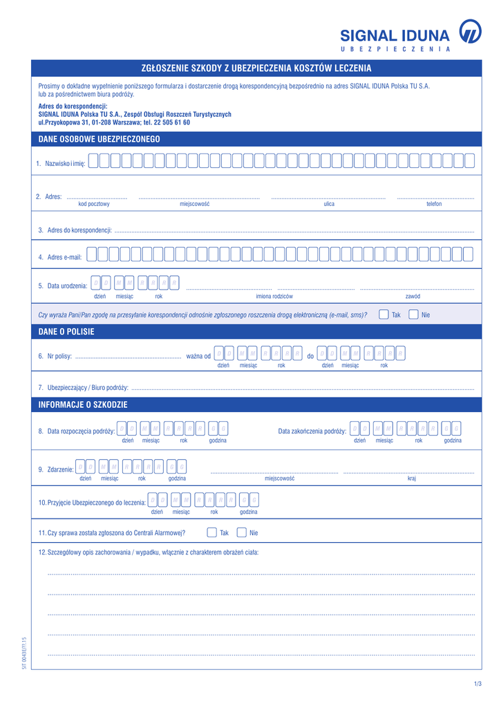 ZGŁOSZENIE SZKODY Z UBEZPIECZENIA KOSZTÓW LECZENIA Prosimy o dokładne wypełnienie poniższego formularza i dostarczenie drogą korespondencyjną bezpośrednio na adres SIGNAL IDUNA Polska TU S.A. lub za pośrednictwem biura podróży. Adres do korespondencji: SIGNAL IDUNA Polska TU S.A., Zespół Obsługi Roszczeń Turystycznych ul.Przyokopowa 31, 01-208 Warszawa; tel. 22 505 61 60 DANE OSOBOWE UBEZPIECZONEGO 1. Nazwisko i imię: 2. Adres: .................................... kod pocztowy ........................................................................ miejscowość .................................................................... .............................................. ulica telefon 3. Adres do korespondencji: ...................................................................................................................................................................................................................... 4. Adres e-mail: DD MM RRRR 5. Data urodzenia: dzień miesiąc ................................................... .............................................. .................................................................... rok imiona rodziców zawód Tak Czy wyraża Pani/Pan zgodę na przesyłanie korespondencji odnośnie zgłoszonego roszczenia drogą elektroniczną (e-mail, sms)? Nie DANE O POLISIE 6. Nr polisy: ............................................................... ważna od DD MM RRRR dzień miesiąc rok do DD MM RRRR dzień miesiąc rok 7. Ubezpieczający / Biuro podróży: ............................................................................................................................................................................................................ INFORMACJE O SZKODZIE 8. Data rozpoczęcia podróży: DD MM RRRR dzień miesiąc rok 9. Zdarzenie: DD MM RRRR GG godzina dzień miesiąc rok GG dzień miesiąc 11.Czy sprawa została zgłoszona do Centrali Alarmowej? DD MM RRRR GG dzień godzina miesiąc rok ............................................................................ .............................................................................. miejscowość 10.Przyjęcie Ubezpieczonego do leczenia: DD MM RRRR Data zakończenia podróży: godzina rok kraj GG godzina Tak Nie 12.Szczegółowy opis zachorowania / wypadku, włącznie z charakterem obrażeń ciała: . .............................................................................................................................................................................................................................. ............................................................................................................................................................................................................................... SIT 0043E/??.15 ............................................................................................................................................................................................................................... ............................................................................................................................................................................................................................... ............................................................................................................................................................................................................................... 1/3 13.Nazwy i adresy placówek medycznych, w których Ubezpieczony leczył się przed zachorowaniem / wypadkiem: . .............................................................................................................................................................................................................................. ............................................................................................................................................................................................................................... 14.Nazwy i adresy placówek medycznych, w których Ubezpieczony leczył się po zachorowaniu / wypadku: ............................................................................................................................................................................................................................................................. ............................................................................................................................................................................................................................................................ 15.Nazwisko i imię oraz adres lekarza pierwszego kontaktu: ............................................................................................................................................................................................................................................................. 16.Jeżeli zdarzenie dotyczyło wypadku komunikacyjnego, prosimy podać nr rejestracyjny samochodu i komisariat policji, na który sprawa została zgłoszona: ............................................................................................................................................................................................................................................................. 17.Kto i gdzie udzielił Ubezpieczonemu pierwszej pomocy medycznej? ............................................................................................................................................................................................................................................................. 18.Jeśli są świadkowie zdarzenia, to podać nazwiska i imiona oraz ich adresy: ............................................................................................................................................................