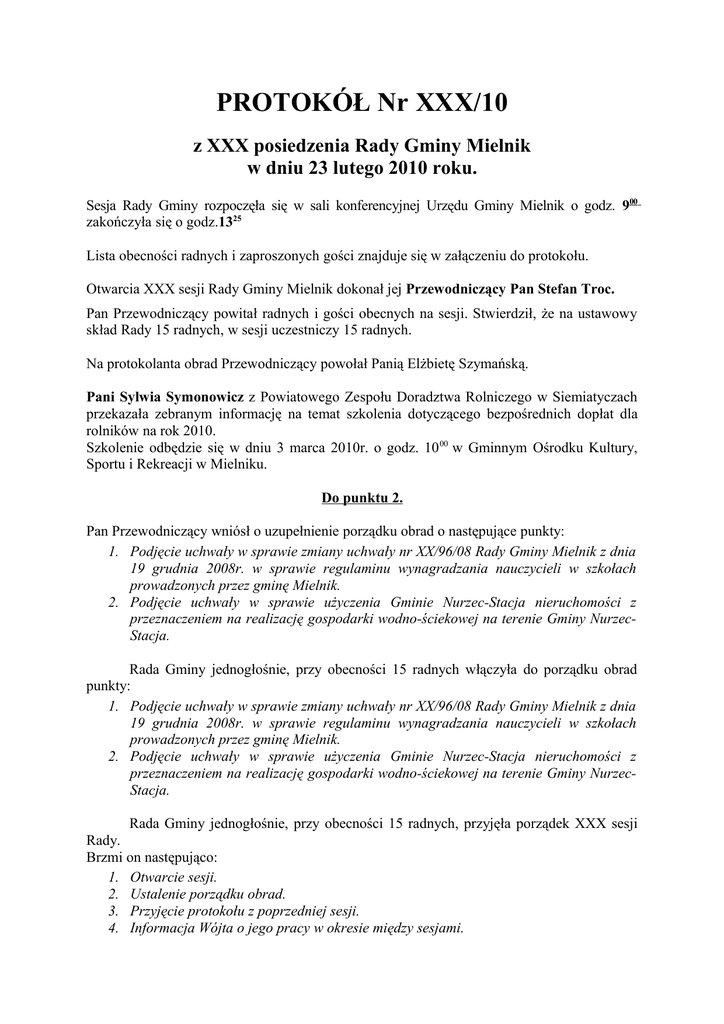 PROTOKÓŁ Nr XXX/10 z XXX posiedzenia Rady Gminy Mielnik w dniu 23 lutego 2010 roku. Sesja Rady Gminy rozpoczęła się w sali konferencyjnej Urzędu Gminy Mielnik o godz. 900 zakończyła się o godz.1325 Lista obecności radnych i zaproszonych gości znajduje się w załączeniu do protokołu. Otwarcia XXX sesji Rady Gminy Mielnik dokonał jej Przewodniczący Pan Stefan Troc. Pan Przewodniczący powitał radnych i gości obecnych na sesji. Stwierdził, że na ustawowy skład Rady 15 radnych, w sesji uczestniczy 15 radnych. Na protokolanta obrad Przewodniczący powołał Panią Elżbietę Szymańską. Pani Sylwia Symonowicz z Powiatowego Zespołu Doradztwa Rolniczego w Siemiatyczach przekazała zebranym informację na temat szkolenia dotyczącego bezpośrednich dopłat dla rolników na rok 2010. Szkolenie odbędzie się w dniu 3 marca 2010r. o godz. 10 00 w Gminnym Ośrodku Kultury, Sportu i Rekreacji w Mielniku. Do punktu 2. Pan Przewodniczący wniósł o uzupełnienie porządku obrad o następujące punkty: 1. Podjęcie uchwały w sprawie zmiany uchwały nr XX/96/08 Rady Gminy Mielnik z dnia 19 grudnia 2008r. w sprawie regulaminu wynagradzania nauczycieli w szkołach prowadzonych przez gminę Mielnik. 2. Podjęcie uchwały w sprawie użyczenia Gminie Nurzec-Stacja nieruchomości z przeznaczeniem na realizację gospodarki wodno-ściekowej na terenie Gminy NurzecStacja. Rada Gminy jednogłośnie, przy obecności 15 radnych włączyła do porządku obrad punkty: 1. Podjęcie uchwały w sprawie zmiany uchwały nr XX/96/08 Rady Gminy Mielnik z dnia 19 grudnia 2008r. w sprawie regulaminu wynagradzania nauczycieli w szkołach prowadzonych przez gminę Mielnik. 2. Podjęcie uchwały w sprawie użyczenia Gminie Nurzec-Stacja nieruchomości z przeznaczeniem na realizację gospodarki wodno-ściekowej na terenie Gminy NurzecStacja. Rada Gminy jednogłośnie, przy obecności 15 radnych, przyjęła porządek XXX sesji Rady. Brzmi on następująco: 1. Otwarcie sesji. 2. Ustalenie porządku obrad. 3. Przyjęcie protokołu z poprzedniej sesji. 4. Informacja Wójta o jego pracy w okresie między sesjami. 2 5. Interpelacje i zapytania radnych. 6. Podjęcie uchwały w sprawie zmian w budżecie gminy na 2010r. 7. Podjęcie uchwały w sprawie udzielenia dotacji z budżetu gminy na prace konserwatorskie, restauratorskie lub roboty budowlane przy zabytkach wpisanych do rejestru zabytków położonych na terenie gminy Mielnik nie stanowiących jej własności. 8. Podjęcie uchwały w sprawie przyjęcia “Programu usuwania wyrobów azbestowych dla Gminy Mielnik na lata 2009-2032”. 9. Podjęcie uchwały w sprawie nadania nazwy ulicy położonej w Mielniku. 10. Podjęcie uchwały w sprawie zarządzenia wyboru sołtysa w sołectwie Homoty. 11. Podjęcie uchwały w sprawie zmiany uchwały nr XX/96/08 Rady Gminy Mielnik z dnia 19 grudnia 2008r. w sprawie regulaminu wynagradzania nauczycieli w szkołach prowadzonych przez gminę Mielnik. 12. Podjęcie uchwały w sprawie użyczenia Gminie Nurzec-Stacja nieruchomości z przeznaczeniem na realizację gospodarki wodno-ściekowej na terenie Gminy NurzecStacja. 13. Sprawozdanie z działalności Gminnej Komisji Rozwiązywania Problemów Alkoholowych za 2009r. 14. Sprawozdanie z działalności Gminnego Ośrodka Pomocy Społecznej w Mielniku za 2009r. 15. Odpowiedzi na interpelacje. 16. Wolne wnioski. Do punktu 3. Pan Adam Tobota zgłosił wniosek aby protokół z XXVIII sesji Rady Gminy został przyjęty na następnej sesji. XXVIII sesja RG odbyła się w listopadzie 2009r. i ze względu na znaczną odległość czasową radni nie pamiętają dobrze jej przebiegu, zaś w trakcie dzisiejszej sesji jest zbyt mało czasu aby dokładnie zapoznać się z protokołem. Pan Przewodniczący stwierdził, że protokół z XXVII Rady Gminy zostanie przyjęty na następnej sesji. Do punktu 4. Pan Wójt przedstawił informację o swojej pracy w okresie między sesjami: ● W lutym 2010r., w okresie od 1 do 9 odbyły się na terenie gminy zebrania wiejskie. W zebraniach brał udział Wójt Gminy i Zastępca Wójta. ● W dniu wczorajszym Pan Wójt uczestniczył w naradzie wójtów i burmistrzów w Drohiczynie, dotyczyła ona projektu “Bug rajem dla turystów”. ● Innym bardzo ważnym projektem, którym zajmujemy się jest szerokopasmowy internet na ścianie wschodniej. Projekt ten realizowany będzie we wszystkich gminach i miastach naszego powiatu. Projekt jest wart 15 mln.700 tys.złotych i podzielono go na 2 etapy. Przewiduje się na jedno gospodarstwo 2 MGB odbioru, będzie to bardzo szybki internet. ● Złożyliśmy także projekt do “Lidera” na 23 tys.zł. pod hasłem “Krajobrazy ziemi 3 ● ● ● ● ● mielnickiej promocją regionu”, zajął 5 pozycję w ocenie komisji. Czekamy na decyzję w tej sprawie. Kolejnym gotowym do złożenia projektem jest “Zagospodarowanie turystyczne Rezerwatu Góra Uszeście”, gdzie oczekujemy środków w wysokości około 25 tys.złotych. Dyrektor GOKSiR złożył projekt do Ministerstwa Kultury i Dziedzictwa Narodowego na “Muzyczne Dialogi nad Bugiem”. Projekt został pozytywnie rozstrzygnięty, otrzymamy dotację w kwocie 70 tys.złotych. ogłoszony został przetarg na budowę oczyszczalni ścieków, rozstrzygnięcie nastąpi 3 marca br. W najbliższych dniach ogłosimy również przetarg na nadzór inwestorski nad budową oczyszczalni. Niebawem ogłosimy przetarg na przebudowę drogi gminnej Adamowo-Wilanowo tzw.schetynówkę. Otrzymaliśmy na ten cel kwotę dotacji w wysokości 938 tys.złotych. Na wniosek Wójta Gminy wyrażono wstępna zgodę (w dni dzisiejszym podjęta zostanie uchwała Zarządu Województwa Podlaskiego w tej sprawie) na organizację w Mielniku uroczystości urodzin woj.podlaskiego. Proponujemy termin 28 sierpnia br. Cały koszt obchodów urodzin województwa ponosi Zarząd Województwa Podlaskiego. Z naszej strony jest tylko zapewnienie sprawnej organizacji obchodów. Rada Gminy przyjęła do wiad
