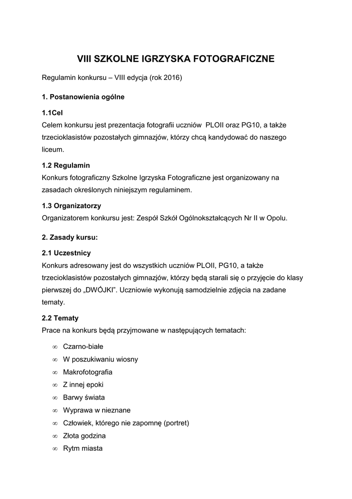 VIII SZKOLNE IGRZYSKA FOTOGRAFICZNE Regulamin konkursu – VIII edycja (rok 2016) 1. Postanowienia ogólne 1.1Cel Celem konkursu jest prezentacja fotografii uczniów PLOII oraz PG10, a także trzecioklasistów pozostałych gimnazjów, którzy chcą kandydować do naszego liceum. 1.2 Regulamin Konkurs fotograficzny Szkolne Igrzyska Fotograficzne jest organizowany na zasadach określonych niniejszym regulaminem. 1.3 Organizatorzy Organizatorem konkursu jest: Zespół Szkół Ogólnokształcących Nr II w Opolu. 2. Zasady kursu: 2.1 Uczestnicy Konkurs adresowany jest do wszystkich uczniów PLOII, PG10, a także trzecioklasistów pozostałych gimnazjów, którzy będą starali się o przyjęcie do klasy pierwszej do „DWÓJKI”. Uczniowie wykonują samodzielnie zdjęcia na zadane tematy. 2.2 Tematy Prace na konkurs będą przyjmowane w następujących tematach: • Czarno-białe • W poszukiwaniu wiosny • Makrofotografia • Z innej epoki • Barwy świata • Wyprawa w nieznane • Człowiek, którego nie zapomnę (portret) • Złota godzina • Rytm miasta 2.3 Terminy Prace na konkurs we wszystkich dostępnych tematach można przynosić (przysyłać) do dnia, w którym upływa termin oddawania prac w wybranym temacie. Terminy dostarczenia zdjęć w poszczególnych tematach są następujące: • Czarno-białe - oddajemy do 31 marca 2016 r. • W poszukiwaniu wiosny - oddajemy do 30 kwietnia 2016 r. • Makrofotografia - oddajemy do 31 maja 2016 r. • Z innej epoki...- oddajemy do 30 czerwca 2016 r. • Barwy świata - (temat na lipiec) oddajemy do 10 września 2016 r. • Wyprawa w nieznane - (temat na sierpień) - oddajemy do 10 września 2016 r. • Człowiek, którego nie zapomnę (portret) - oddajemy do 30 września 2016 r. • Złota godzina - oddajemy do 31 października 2016 r. • Rytm miasta - oddajemy do 30 listopada 2016 r. Wyniki konkursu w poszczególnych grupach tematycznych będą publikowane na stronie szkoły w następujących terminach: • Czarno-białe - do 10 kwietnia 2016 r. • W poszukiwaniu wiosny – do 10 maja 2016 r. • Makrofotografia - do 10 czerwca 2016 r. • Z innej epoki...- do 10 lipca 2016 r. • Barwy świata – do 20 września 2016 r. • Wyprawa w nieznane - do 20 września 2016 r. • Człowiek, którego nie zapomnę (portret) – do 10 października 2016 r. • Złota godzina - do 10 listopada 2016 r. • Rytm miasta – do 10 grudnia 2016 r. 2.4 Zgłaszanie zdjęć 2.4.1 Zdjęcia do konkursu Zdjęcia do konkursu należy dostarczać w wersji elektronicznej do pani Katarzyny Zając (sala 114/116), osobiście lub przesłać mailem na adres: [email protected] w terminach wymienionych powyżej. 2.4.2 Wielkość zdjęcia powinna być: • Min. Szerokość: 1000 px • Min wysokość: 1000 px • Min. Objętość pliku: 1 MB • Max. Objętość pliku: 4 MB • Format pliku: jpg 2.4.3 Zdjęcie powinno być opisane – imię i nazwisko, klasa (kandydaci do PLO wpisują „KANDYDAT”), tytuł zdjęcia. Zdjęcie powinno zawierać EXIF (czyli skrót od Exchangeable Image File Format), w którym zapisane są metadane o zdjęciu, miedzy innymi: nazwa aparatu,, którym wykonano zdjęcie, ustawienia aparatu podczas wykonywania zdjęcia (czas naświetlania, wartość przesłony, ogniskowa obiektywu, czułość ISO czy balans bieli), datę wykonania zdjęcia a także późniejszych edycji wraz z podaniem programu, w którym to zdjęcie było edytowane, wielkość pliku, rozdzielczość w pikselach, profil kolorów, itd.) 2.4.4Każdy z autorów może przynieść tylko 1 zdjęcie na każdy temat, czyli maksymalnie oddać 9 zdjęć podczas trwania igrzysk. Do konkursu można przystąpić w dowolnym momencie jego trwania. 2.5 Zasady oceny i wyboru zwycięzców . 2.5.1Skład Jury konkursu. • opiekun SAF: Katarzyna Zając, • nauczyciel informatyki: Krzysztof Żyta, • członkowie (absolwenci) SAF: Zosia Gnat, Paweł Sikorski
