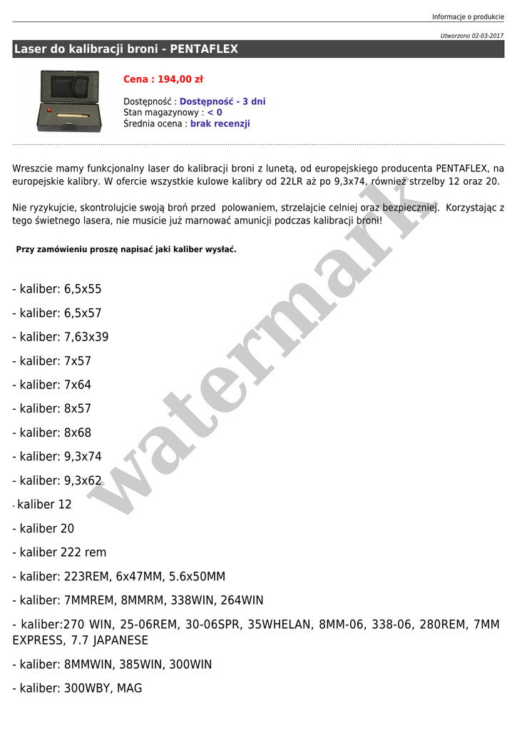 Informacje o produkcie Utworzono 02-03-2017 Laser do kalibracji broni - PENTAFLEX Cena : 194,00 zł Dostępność : Dostępność - 3 dni Stan magazynowy : < 0 Średnia ocena : brak recenzji Wreszcie mamy funkcjonalny laser do kalibracji broni z lunetą, od europejskiego producenta PENTAFLEX, na europejskie kalibry. W ofercie wszystkie kulowe kalibry od 22LR aż po 9,3x74, również strzelby 12 oraz 20. er m ar k Nie ryzykujcie, skontrolujcie swoją broń przed polowaniem, strzelajcie celniej oraz bezpieczniej. Korzystając z tego świetnego lasera, nie musicie już marnować amunicji podczas kalibracji broni! Przy zamówieniu proszę napisać jaki kaliber wysłać. - kaliber: 6,5x55 - kaliber: 6,5x57 - kaliber: 7,63x39 - kaliber: 7x57 - kaliber: 7x64 at - kaliber: 8x57 - kaliber: 8x68 - kaliber: 9,3x74 w - kaliber: 9,3x62 - kaliber 12 - kaliber 20 - kaliber 222 rem - kaliber: 223REM, 6x47MM, 5.6x50MM - kaliber: 7MMREM, 8MMRM, 338WIN, 264WIN - kaliber:270 WIN, 25-06REM, 30-06SPR, 35WHELAN, 8MM-06, 338-06, 280REM, 7MM EXPRESS, 7.7 JAPANESE - kaliber: 8MMWIN, 385WIN, 300WIN - kaliber: 300WBY, MAG -kaliber: 260REM, 243WIN, 380WIN, 358WIN, 356, 307, 6MM REM, 257ROBERTS/IMPROVED, 7MM-08, 8MM MAUSER, 284WIN w at er m ar k - kaliber: 375 Holand Holand