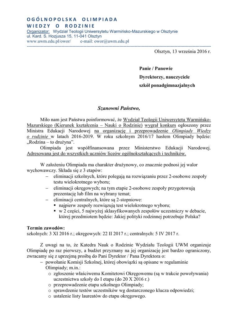 OGÓLNOPOLSKA OLIMPIADA WIEDZY O RODZINIE Organizator: Wydział Teologii Uniwersytetu Warmińsko-Mazurskiego w Olsztynie ul. Kard. S. Hozjusza 15, 11-041 Olsztyn www.uwm.edu.pl/owor/ e-mail: [email protected] ------------------------------------------------------------------------------------------------------------------------------------- Olsztyn, 13 września 2016 r. Panie / Panowie Dyrektorzy, nauczyciele szkół ponadgimnazjalnych Szanowni Państwo, Miło nam jest Państwa poinformować, że Wydział Teologii Uniwersytetu WarmińskoMazurskiego (Kierunek kształcenia – Nauki o Rodzinie) wygrał konkurs ogłoszony przez Ministra Edukacji Narodowej na organizację i przeprowadzenie Olimpiady Wiedzy o rodzinie w latach 2016-2019. W roku szkolnym 2016/17 hasłem Olimpiady będzie: „Rodzina – to drużyna”. Olimpiada jest współfinansowana przez Ministerstwo Edukacji Narodowej. Adresowana jest do wszystkich uczniów liceów ogólnokształcących i techników. W założeniu Olimpiada ma charakter drużynowy, co znacznie podnosi jej walor wychowawczy. Składa się z 3 etapów: eliminacji szkolnych, które polegają na rozwiązaniu przez 2-osobowe zespoły testu wielokrotnego wyboru; eliminacji okręgowych; na tym etapie 2-osobowe zespoły przygotowują prezentację lub film na wybrany temat; eliminacji centralnych, które są 2-stopniowe: najpierw zespoły rozwiązują test wielokrotnego wyboru; w 2 części, 5 najwyżej sklasyfikowanych zespołów uczestniczy w debacie, której przedmiotem będzie: Jakiej polityki rodzinnej potrzebuje Polska? Termin zawodów: szkolnych: 3 XI 2016 r.; okręgowych: 22 II 2017 r.; centralnych: 5 IV 2017 r. Z uwagi na to, że Katedra Nauk o Rodzinie Wydziału Teologii UWM organizuje Olimpiadę po raz pierwszy, a budżet przyznany na jej organizację jest bardzo ograniczony, zwracamy się z uprzejmą prośbą do Pani Dyrektor / Pana Dyrektora o: powołanie Komisji Szkolnej, której obowiązki są opisane w regulaminie Olimpiady; m.in.: o zgłoszenie właściwemu Komitetowi Okręgowemu (są w trakcie powoływania) uczestnictwa szkoły do I etapu (do 20 X 2016 r.) o przeprowadzenie etapu szkolnego Olimpiady; o sprawdzenie testów uczestników wg dostarczonego klucza odpowiedzi; o ustalenie listy laureatów do etapu okręgowego. Liczymy na to, iż zaangażowanie Pani Dyrektor / Pana Dyrektora oraz nauczycieli zwiększy zainteresowanie młodzieży Olimpiadą i szkoła zgłosi w niej swoje uczestnictwo. Z góry serdecznie dziękujemy za deklarację pomocy w przeprowadzeniu Olimpiady. W razie potrzeby jesteśmy do Państwa dyspozycji (Grażyna Przasnyska Przewodnicząca Komitetu Głównego, tel. 728 840 879; ks. dr Michał Tunkiewicz Koordynator, tel. 604 289 236; e-mail: [email protected],pl). Szczegółowe informacje dotyczące naszego przedsięwzięcia są umieszczane na www.uwm.edu.pl/owor/ i systematycznie będą uzupełniane. Zapraszamy do odwiedzania strony Olimpiady. Organizator (w miarę pozyskanych środków) przewiduje atrakcyjne nagrody: dla finalistów nagrody książkowe lub rzeczowe; dla laureatów: I nagroda - wyjazd do Chorwacji; II nagroda - nagrody rzeczowe; III nagroda - nagrody rzeczowe; dla nauczyciela (opiekuna) zwycięskiego zespołu. Szkoły najliczniej reprezentowane otrzymają wyróżnienia. Serdecznie pozdrawiamy i już teraz zapraszamy na finał Olimpiady w kwietniu przyszłego roku do Olsztyna. Przewodnicząca Komitetu Głównego Grażyna Przasnyska Koordynator Ks. dr Michał Tunkiewicz Dziekan Wydziału Teologii ks. dr hab. Marek Żmudziński INFORMACJA dotycząca zakresu wiedzy i umiejętności na etap szkolny Ogólnopolskiej Olimpiady Wiedzy o rodzinie w roku szkolnym 2016/17 Etap zawodów szkolnych polega na rozwiązaniu przez 2-osobowy zespół testu wielokrotnego wyboru, składającego się z 30 pytań. Opracowany test zostanie przekazany do szkół drogą elektroniczną zgodnie z harmonogramem. Podczas I etapu należy wykazać się znajomością przepisów prawa polskiego (w tym konkordatowego) dotyczącego w szczególności: małżeństwa i rodziny, możliwości pomocy osobom dotkniętych przemocą, praw i obowiązków dziecka. Przygotowując się do testu uczestnicy pogłębią wiedzę związaną z funkcjonowaniem rodziny, usystematyzują ją w zakresie pełnienia ról małżeńskich i rodzicielskich. Zakres problematyki, na bazie której będzie opracowany test: macierzyństwo i ojcostwo; prawodawstwo dotyczące rodziny; formy, zasady i warunki zawarcia małżeństwa; prawa i obowiązki małżonków; prawa i obowiązki rodziców; prawa i obowiązki dziecka; przemoc w domu, profilaktyka, możliwości uzyskiwania pomocy; separacja i rozwód; adopcja i rodzina (piecza) zastępcza. Bibliografia: Kodeks Prawa Kanonicznego. Przekład polski zatwierdzony przez Konferencję Episkopatu Polski, Pallottinum 1984, kan. 1055-1165. Kodeks rodzinny i opiekuńczy. Ustawa z dnia 25 lutego 1964 r. (Dz.U. 1964 nr 9 poz. 59 z późn. zm.). Konstytucja Rzeczpospolitej Polskiej z dnia 2 kwietnia 1997 r., (Dz. U. 1997, nr 78, poz. 483 z późn. zm.). Pawluk T., Prawo kanoniczne według Kodeksu Jana Pawła II, t. 3, Prawo małżeńskie, Olsztyn 1996. Smyczyński T., Prawo rodzinne i opiekuńcze, Warszawa 2005. Nauczycieli uprzejmie prosimy o zachęcenie młodzieży do udziału w zawodach szkolnych oraz pomoc w przygotowaniu się do nich. Szczegółowy regulamin, program i harmonogram znajduje się na www.uwm.edu.pl/owor/.