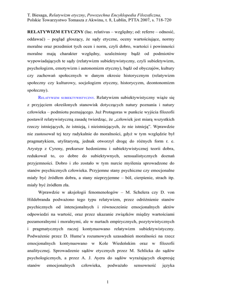 T. Biesaga, Relatywizm etyczny, Powszechna Encyklopedia Filozoficzna, Polskie Towarzystwo Tomasza z Akwinu, t. 8, Lublin, PTTA 2007, s. 718-720 RELATYWIZM ETYCZNY (łac. relativus – względny; od: referre – odnosić, oddawać) – pogląd głoszący, że sądy etyczne, oceny wartościujące, normy moralne oraz przedmiot tych ocen i norm, czyli dobro, wartości i powinności moralne mają charakter względny, uzależniony bądź od podmiotów wypowiadających te sądy (relatywizm subiektywistyczny, czyli subiektywizm, psychologizm, emotywizm i autonomizm etyczny), bądź od obyczajów, kultury czy zachowań społecznych w danym okresie historycznym (relatywizm społeczny czy kulturowy, socjologizm etyczny, historycyzm, deontonomizm społeczny). RELATYWIZM SUBIEKTYWISTYCZNY. Relatywizm subiektywistyczny wiąże się z przyjęciem określonych stanowisk dotyczących natury poznania i natury człowieka – podmiotu poznającego. Już Protagoras w punkcie wyjścia filozofii postawił relatywistyczną zasadę twierdząc, że „człowiek jest miarą wszystkich rzeczy istniejących, że istnieją, i nieistniejących, że nie istnieją”. Wprawdzie nie zastosował tej tezy radykalnie do moralności, gdyż w tym względzie był pragmatykiem, utylitarystą, jednak otworzył drogę do różnych form r. e. Arystyp z Cyreny, prekursor hedonizmu i subiektywistycznej teorii dobra, redukował to, co dobre do subiektywnych, sensualistycznych doznań przyjemności. Dobro i zło zostało w tym nurcie myślenia sprowadzone do stanów psychicznych człowieka. Przyjemne stany psychiczne czy emocjonalne miały być źródłem dobra, a stany nieprzyjemne – ból, cierpienie, strach itp. miały być źródłem zła. Wprawdzie w aksjologii fenomenologów – M. Schelera czy D. von Hildebranda podważono tego typu relatywizm, przez odróżnienie stanów psychicznych od intencjonalnych i równocześnie emocjonalnych aktów odpowiedzi na wartość, oraz przez ukazanie związków między wartościami pozamoralnymi i moralnymi, ale w nurtach empirycznych, pozytywistycznych i pragmatycznych raczej kontynuowano relatywizm subiektywistyczny. Podważenie przez D. Hume’a rozumowych uzasadnień moralności na rzecz emocjonalnych kontynuowano w Kole Wiedeńskim oraz w filozofii analitycznej. Sprowadzenie sądów etycznych przez M. Schlicka do sądów psychologicznych, a przez A. J. Ayera do sądów wyrażających ekspresję stanów emocjonalnych człowieka, podważało 1 sensowność języka T. Biesaga, Relatywizm etyczny, Powszechna Encyklopedia Filozoficzna, Polskie Towarzystwo Tomasza z Akwinu, t. 8, Lublin, PTTA 2007, s. 718-720 przedmiotowego etyki oraz likwidowało etykę jako dyscyplinę filozoficzną. W myśl emotywizmu sądom wartościującym czy normatywnym przysługuje tylko znaczenie emotywne. Nie wyrażają one obiektywnych stanów wartościowych, lecz są albo irracjonalną reakcją emocjonalną na pewne fakty czy zachowania ludzkie, albo aprobatą lub dezaprobatą tych faktów, lub też chęcią oddziaływania na czyjeś zachowania. Takie stanowisko wyklucza sens logiczny ocen i norm, ich prawdziwość czy fałszywość. Wszystkie wypowiedzi wartościujące są równouprawnione. Moralność jako taką redukuje się do moralności prywatnej, niepodlegającej intersubiektywnym (obiektywnym) i racjonalnym kryteriom. Dyskurs moralny odarty z racjonalnych kryteriów dobra i zła sprowadzony zostaje – zdaniem A. MacIntyre – do przemocy i manipulacji emocjonalnej. RELATYWIZM SPOŁECZNY. Relatywizm społeczny występuje w tych nurtach filozoficznych, w których źródeł moralności szuka się w procesach społecznych, a nie w naturze osoby ludzkiej. Zarówno w filozofii heglowskomarksistowskiej, jak też w pozytywizmie redukuje się moralność do procesów społecznych. Byt społeczny stawia się jako podstawowy, tworzący byt jednostkowy, a w tym świadomość moralną osoby ludzkiej. Moralność nie jest tworem autonomicznym osoby, lecz wytworem społecznym, obyczajowym i kulturowym. W tym nurcie myślenia źródłem norm moralnych jest tzw. większość społeczna lub wybrana grupa autorytetów czy ekspertów moralności. Okazuje się jednak, że bez posiadania kryterium wyboru tego, co moralne, wpada się w tym rozumowaniu w błędne koło albo w ciąg w nieskończoność. Wyartykułowany we współczesnej antropologii kulturowej i w etnologii relatywizm kulturowy, mimo że dotyczy głównie kultury, to jednak od relatywizacji kultur przechodzi do relatywizacji moralności wyrażanych w tych kulturach. Twórca metodologiczny, tego mniej nurtu F. Boas zaangażowany w rozwijał raczej filozoficzne relatywizm rozstrzygnięcia ostatecznych podstaw moralności. Twierdził, że zrozumienie sensowności różnych składników kultury, w tym obyczajów moralnych, jest możliwe tylko w kontekście danej kultury, w której zostały wytworzone. Te same obyczaje moralne w kontekście innych kultur stają się obojętne, irracjonalne czy 2 T. Biesaga, Relatywizm etyczny, Powszechna Encyklopedia Filozoficzna, Polskie Towarzystwo Tomasza z Akwinu, t. 8, Lublin, PTTA 2007, s. 718-720 bezsensowne lub nabierają całkiem innego znaczenia. Przeciwstawiał się interpretowaniu jednych kultur przez inne, uznane za wyższe. Uczniowie Boasa, M. J. i F. Herskovitsowie nazwali ten nurt myślenia relatywizmem kulturowym oraz wyraźnie go zradykalizowali. Z pozycji relatywizmu kulturowego przeszli do r. e. Głosili, że normy kulturowe są wytworem kultury, a więc w każdej kulturze są inne, że mają sens oraz moc obowiązującą tylko w kontekście danej kultury; idąc dalej, zredukowali moralność do norm obyczajowych i kulturowych, twierdząc przy tym, że nie istnieją żadne przekraczające daną kulturę, powszechne kryteria pozwalające rozstrzygnąć, które sądy wartościujące i normatywne są prawdziwe, a które fałszywe. Ponadto, sformułowano w obrębie relatywizmu kulturowego zasadę wszechtolerancji, czyli