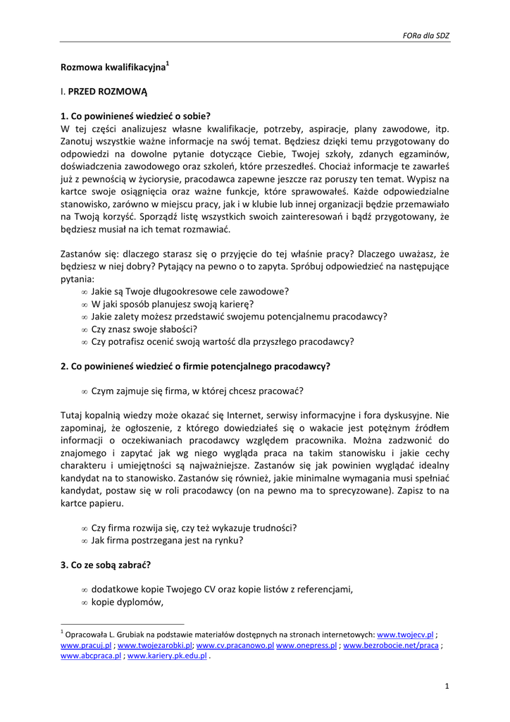 FORa dla SDZ Rozmowa kwalifikacyjna1 I. PRZED ROZMOWĄ 1. Co powinieneś wiedzieć o sobie? W tej części analizujesz własne kwalifikacje, potrzeby, aspiracje, plany zawodowe, itp. Zanotuj wszystkie ważne informacje na swój temat. Będziesz dzięki temu przygotowany do odpowiedzi na dowolne pytanie dotyczące Ciebie, Twojej szkoły, zdanych egzaminów, doświadczenia zawodowego oraz szkoleń, które przeszedłeś. Chociaż informacje te zawarłeś już z pewnością w życiorysie, pracodawca zapewne jeszcze raz poruszy ten temat. Wypisz na kartce swoje osiągnięcia oraz ważne funkcje, które sprawowałeś. Każde odpowiedzialne stanowisko, zarówno w miejscu pracy, jak i w klubie lub innej organizacji będzie przemawiało na Twoją korzyść. Sporządź listę wszystkich swoich zainteresowań i bądź przygotowany, że będziesz musiał na ich temat rozmawiać. Zastanów się: dlaczego starasz się o przyjęcie do tej właśnie pracy? Dlaczego uważasz, że będziesz w niej dobry? Pytający na pewno o to zapyta. Spróbuj odpowiedzieć na następujące pytania: • Jakie są Twoje długookresowe cele zawodowe? • W jaki sposób planujesz swoją karierę? • Jakie zalety możesz przedstawić swojemu potencjalnemu pracodawcy? • Czy znasz swoje słabości? • Czy potrafisz ocenić swoją wartość dla przyszłego pracodawcy? 2. Co powinieneś wiedzieć o firmie potencjalnego pracodawcy? • Czym zajmuje się firma, w której chcesz pracować? Tutaj kopalnią wiedzy może okazać się Internet, serwisy informacyjne i fora dyskusyjne. Nie zapominaj, że ogłoszenie, z którego dowiedziałeś się o wakacie jest potężnym źródłem informacji o oczekiwaniach pracodawcy względem pracownika. Można zadzwonić do znajomego i zapytać jak wg niego wygląda praca na takim stanowisku i jakie cechy charakteru i umiejętności są najważniejsze. Zastanów się jak powinien wyglądać idealny kandydat na to stanowisko. Zastanów się również, jakie minimalne wymagania musi spełniać kandydat, postaw się w roli pracodawcy (on na pewno ma to sprecyzowane). Zapisz to na kartce papieru. • • Czy firma rozwija się, czy też wykazuje trudności? Jak firma postrzegana jest na rynku? 3. Co ze sobą zabrać? • • dodatkowe kopie Twojego CV oraz kopie listów z referencjami, kopie dyplomów, 1 Opracowała L. Grubiak na podstawie materiałów dostępnych na stronach internetowych: www.twojecv.pl ; www.pracuj.pl ; www.twojezarobki.pl; www.cv.pracanowo.pl www.onepress.pl ; www.bezrobocie.net/praca ; www.abcpraca.pl ; www.kariery.pk.edu.pl . 1 FORa dla SDZ • • świadectwa pracy, listę ważnych prac (zleceń), które wykonałeś, oraz świadectwa ukończenia istotnych kursów, szkoleń itp., • pióro czy długopis bez napisów reklamowych 4. Jak opanować stres ? Stres towarzyszy nam prawie wszędzie. Może mieć działanie motywacyjne lub destrukcyjne. W celu minimalizacji destrukcyjnego wpływu stresu podczas rozmowy kwalifikacyjnej spróbuj dostosować się do poniższych rad: • • • • • • zorganizuj sobie czas wolny na spotkanie w sprawie pracy przeprowadź próbę generalną bądź przygotowany i pewien tego, co chcesz powiedzieć przyjdź kilka minut wcześniej zrelaksuj się przed wejściem aby opanować rosnące zdenerwowanie nie pal, staraj się natomiast oddychać spokojnie i głęboko; jeżeli nie potrafisz opanować emocji staraj się zająć umysł czymś innym II. PODCZAS ROZMOWY 1. Pierwsze wrażenie Pracodawca już w pierwszych sekundach rozmowy z nami buduje sobie swój obraz kandydata. Dlatego tak ważne jest sprawienie dobrego wrażenia już od samego początku. 2.Wygląd zewnętrzny Duże znaczenie ma nasz wygląd. Wyrażamy nim respekt dla drugiej osoby, a także "mówimy", do jakiej grupy społecznej należymy, jakie wartości szanujemy itd. Pierwsze wrażenie jest bardzo ważne. Osoba, z którą się spotykasz już po paru minutach wytwarza sobie ocenę o Tobie. Ocena ta oparta jest głównie właśnie na wyglądzie, ale również na charakterystycznych cechach zewnętrznych, mowie ciała i zachowaniu. Ubierz się elegancko, schludnie. Schludny wygląd dla wielu osób to informacja o tym, jak solidny jest ich rozmówca, na ile zorganizowany i dokładny. Takie cechy mogą mieć znaczenie. Zachowuj postawę wyprostowaną, pewną siebie, otwartą, bądź uśmiechnięty(a) i optymistycznie nastawiony(a). Warto zdobyć wcześniej informacje na temat firmy, w której chcemy podjąć pracę. Warto wiedzieć, co nosi się w danej firmie To często daje kandydatowi dodatkowe punkty. -gdy jesteś młodym mężczyzną - załóż do spodni marynarkę, choć pod nią nie musisz mieć tradycyjnej koszuli i krawata, -gdy jesteś młodą kobietą- spokojną sukienkę lub kostium. 2 FORa dla SDZ Rys. 1 Jak nie ubierać się na rozmowę kwalifikacyjną 3. Na spotkanie przyjdź przynajmniej 5 minut wcześniej. Spóźnienie świadczy negatywnie o przydatności do każdego zawodu, ale tu chodzi też o to, żeby chwilę odpocząć i mieć szansę poprawienia wyglądu. 4. Za prowadzenie rozmowy odpowiedzialny jest Twój rozmówca. Czekaj aż wskaże Ci miejsce. Możesz/ nie musisz pochwalić siedzibę firmy oraz wyrazić zadowolenie, że doszło do tego spotkania. 3 FORa dla SDZ Pamiętaj, że to przyszły pracodawca zadaje pytania, a Twoją rolą jest odpowiedzieć na nie najpełniej. Ty zadajesz pytania poproszony o to lub wtedy, kiedy czegoś nie zrozumiałeś czy chcesz dowiedzieć się więcej. Na pierwszym spotkaniu nie pytaj o zarobki. 5. W czasie rozmowy ważne jest, jaką przybierasz postawę. Usiądź swobodnie, a kiedy będziesz mówić, możesz się nieznacznie przechylić w kierunku rozmówcy. Ręce trzymaj na kolanach, można je spleść. Jeżeli proponują Ci coś do picia, najbezpieczniej jest poprosić o szklankę wody. 6. Nie unikaj wzroku Twojego rozmówcy Nawiązuj podczas rozmowy kontakt wzrokowy. To ważne. Świadczy o Twojej spokojnej pewności siebie,