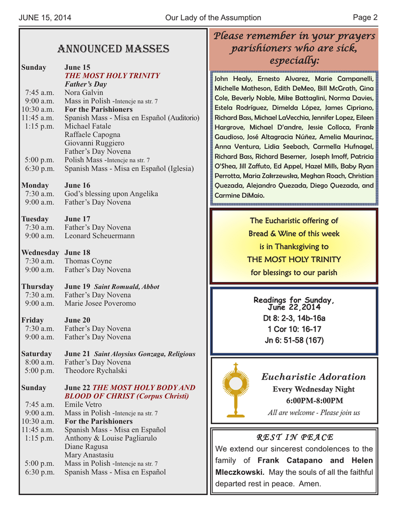 JUNE 15, 2014 Sunday 7:45 a.m. 9:00 a.m. 10:30 a.m. 11:45 a.m. 1:15 p.m. 5:00 p.m. 6:30 p.m. Monday 7:30 a.m. 9:00 a.m. Tuesday 7:30 a.m. 9:00 a.m. ANNOUNCED MASSES June 15 THE MOST HOLY TRINITY Father’s Day Nora Galvin Mass in Polish -Intencje na str. 7 For the Parishioners Spanish Mass - Misa en Español (Auditorio) Michael Fatale Raffaele Capogna Giovanni Ruggiero Father’s Day Novena Polish Mass -Intencje na str. 7 Spanish Mass - Misa en Español (Iglesia) June 16 God’s blessing upon Angelika Father’s Day Novena June 17 Father’s Day Novena Leonard Scheuermann Wednesday June 18 7:30 a.m. Thomas Coyne 9:00 a.m. Father’s Day Novena Thursday 7:30 a.m. 9:00 a.m. Friday 7:30 a.m. 9:00 a.m. Saturday 8:00 a.m. 5:00 p.m. Sunday 7:45 a.m. 9:00 a.m. 10:30 a.m. 11:45 a.m. 1:15 p.m. 5:00 p.m. 6:30 p.m. Page 2 Our Lady of the Assumption June 19 Saint Romuald, Abbot Father’s Day Novena Marie Josee Poveromo June 20 Father’s Day Novena Father’s Day Novena June 21 Saint Aloysius Gonzaga, Religious Father’s Day Novena Theodore Rychalski June 22 THE MOST HOLY BODY AND BLOOD OF CHRIST (Corpus Christi) Emile Vetro Mass in Polish -Intencje na str. 7 For the Parishioners Spanish Mass - Misa en Español Anthony & Louise Pagliarulo Diane Ragusa Mary Anastasiu Mass in Polish -Intencje na str. 7 Spanish Mass - Misa en Español Please remember in your prayers parishioners who are sick, especially: John Healy, Ernesto Alvarez, Marie Campanelli, Michelle Matheson, Edith DeMeo, Bill McGrath, Gina Cole, Beverly Noble, Mike Battaglini, Norma Davies, Estela Rodríguez, Dimelda López, James Cipriano, Richard Bass, Michael LaVecchia, Jennifer Lopez, Eileen Hargrove, Michael D’andre, Jessie Colloca, Frank Gaudioso, José Altagracia Núñez, Amelia Maurinac, Anna Ventura, Lidia Seebach, Carmella Hufnagel, Richard Bass, Richard Besemer, Joseph Imoff, Patricia O’Shea, Jill Zaffuto, Ed Appel, Hazel Mills, Baby Ryan Perrotta, Maria Zakrzewska, Meghan Roach, Christian Quezada, Alejandro Quezada, Diego Quezada, and Carmine DiMaio. The Eucharistic offering of Bread & Wine of this week is in Thanksgiving to THE MOST HOLY TRINITY for blessings to our parish Readings for Sunday, June 22,2014 Dt 8: 2-3, 14b-16a 1 Cor 10: 16-17 Jn 6: 51-58 (167) Eucharistic Adoration Every Wednesday Night 6:00PM-8:00PM All are welcome - Please join us REST IN PEACE We extend our sincerest condolences to the family of Frank Catapano and Helen Mleczkowski. May the souls of all the faithful departed rest in peace. Amen. JUNE 15, 2014 Our Lady of the Assumption SACRIFICIAL GIVING Parish Financial Summary Week of 8 de Junio, 2014 Weekly Budget $ 10,300.00 Collection $ 11,115.00 +/- $10,300 +$ 815.00 Year to date +$ 6,721 .00 Mass Attendance 2816 Same week last year $10,908 .00 Your kind and generous support of our parish is greatly appreciated. Parish Renovation Campaign “Our Parish . . . Our Future” Total Pledged: $ 613,764 Paid to Date: $ 452,567 # of Gifts: 548 Thank you for your support! THE ANONYMOUS PEOPLE Please make every effort to see this highly acclaimed documentory film about the 23 million Americans living in long term recovery from alcohol and other drug abuse. It will be presented at Tanner Park Senior Center on Friday, June 20th, at 7PM. OUTREACH PROGRAM Last week, I neglected to tell you not to hang by your thumbs waiting for the list of contributors to the Outreach Food Pantry. Doubtful that it will be ready by Thanksgiving. This week we ask that you stick to the the edible sale items as random foods are needed. Come support the Copiague Wrestling Team CAR WASH Saturday, June 14th and 21st 10:00AM-2:00PM Donation $5.00 Great Neck Road Elementary School To All Our Fathers: We Wish You a Happy and Blessed FATHER’S DAY! Page 3 RELIGIOUS EDUCATION REGISTRATION Registration for the 2014-2015 school year will begin on Tuesday, August 12th and extend through Tuesday, September 23rd. It will be held at the Religious Ed offices on Tuesdays, Wednesdays, and Thursdays. Times for Registration: Tuesday 2PM to 7PM Wednesday 2PM to 5PM Thursday 2PM to 5PM The tuition fee for the school year 2014-2015 will be the same as last year. However, we are adding a preparation fee of $50 for First Holy Communion. We already have a preparation fee for Confirmation. These fees help defray the costs of certificates, photography, retreat, confirmation gown etc. These payments They must be paid at the same time as the tuition fee. Fee rates: Tuition for one Child $120 Tuition for 2 or more children $150 Preparation for First Communion $ 50 Preparation for Confirmation $ 85 NOTE: Parents of students advancing to Grade 7, 8 or Prep 6 must meet with the Religious Ed Director at the time of registration to receive Confirmation Requirement forms and information. If your child is registering for the first time (must be at least 6 years old): Please bring your child’s Baptismal Certificate so we can make a copy for our records. This is necessary even if your child was baptized at OLA. (If your child has never baptized, please bring the Birth Certificate) If your child has already received First Communion, please bring the First Communion Certificate (or other documentation) showing this. If you have any questions, call us at (631) 8423545. Note: The Religious Ed office will be closed in July. PROTECTING GOD’S CHILDREN VIRTUS TRAINING for OLA Volunteers, will be offered on June 21st and July 19th, in the Lower Church Hall from 10:00am-11:30am. Register on-line at www.drvc.org Virtus Online. Please contact Pam Fitzgerald at (516) 551-2494 for more information. As a reminder, all NEW parish volunteers must have a background screening check. Forms are available in the Rectory Office. JUNE 15, 2014 Page 4 Our Lady of the Assumption Available Mass Intentions for the following weeks are: June 25th 7:30AM & 9:00AM; June 26th 7:30AM;June 27th 7:30AM; June 29th 7:45AM; June 30th 7:30AM; July 1st 7:30AM; July 3rd 7:30AM; July 4th 7:30AM; July 5th 8:00