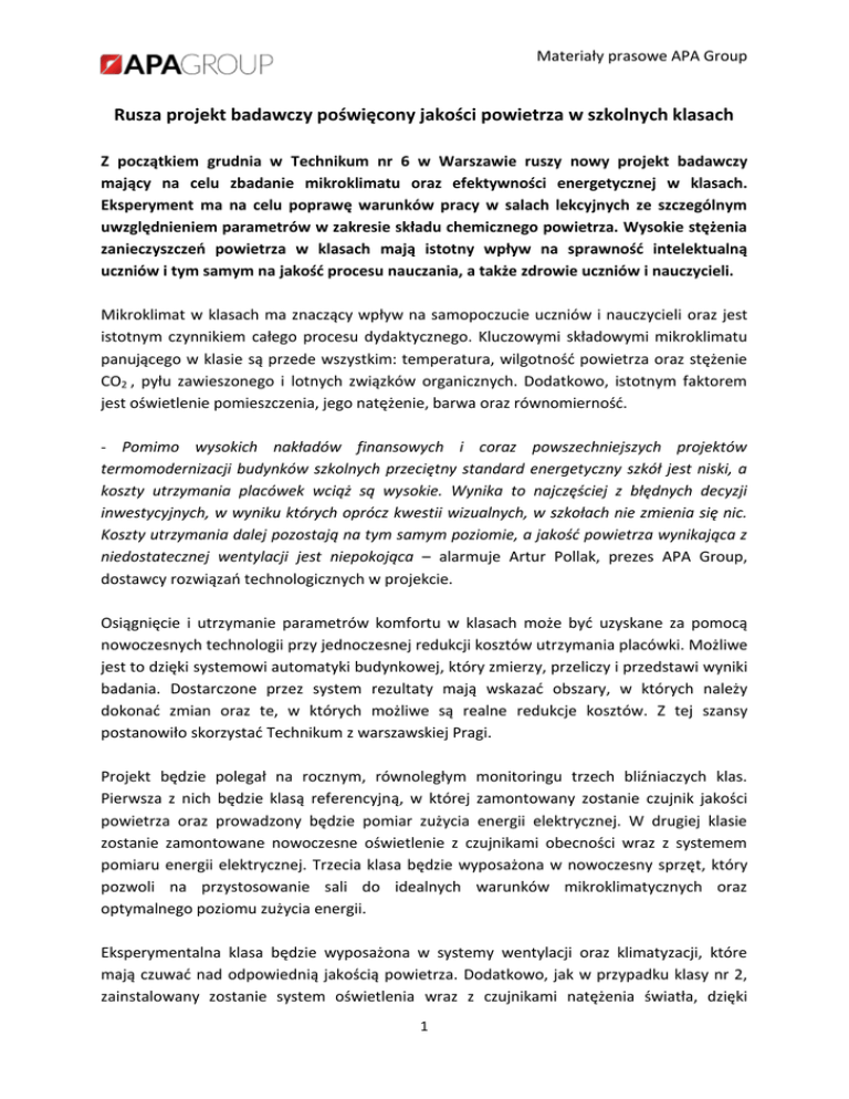Materiały prasowe APA Group Rusza projekt badawczy poświęcony jakości powietrza w szkolnych klasach Z początkiem grudnia w Technikum nr 6 w Warszawie ruszy nowy projekt badawczy mający na celu zbadanie mikroklimatu oraz efektywności energetycznej w klasach. Eksperyment ma na celu poprawę warunków pracy w salach lekcyjnych ze szczególnym uwzględnieniem parametrów w zakresie składu chemicznego powietrza. Wysokie stężenia zanieczyszczeń powietrza w klasach mają istotny wpływ na sprawność intelektualną uczniów i tym samym na jakość procesu nauczania, a także zdrowie uczniów i nauczycieli. Mikroklimat w klasach ma znaczący wpływ na samopoczucie uczniów i nauczycieli oraz jest istotnym czynnikiem całego procesu dydaktycznego. Kluczowymi składowymi mikroklimatu panującego w klasie są przede wszystkim: temperatura, wilgotność powietrza oraz stężenie CO2 , pyłu zawieszonego i lotnych związków organicznych. Dodatkowo, istotnym faktorem jest oświetlenie pomieszczenia, jego natężenie, barwa oraz równomierność. - Pomimo wysokich nakładów finansowych i coraz powszechniejszych projektów termomodernizacji budynków szkolnych przeciętny standard energetyczny szkół jest niski, a koszty utrzymania placówek wciąż są wysokie. Wynika to najczęściej z błędnych decyzji inwestycyjnych, w wyniku których oprócz kwestii wizualnych, w szkołach nie zmienia się nic. Koszty utrzymania dalej pozostają na tym samym poziomie, a jakość powietrza wynikająca z niedostatecznej wentylacji jest niepokojąca – alarmuje Artur Pollak, prezes APA Group, dostawcy rozwiązań technologicznych w projekcie. Osiągnięcie i utrzymanie parametrów komfortu w klasach może być uzyskane za pomocą nowoczesnych technologii przy jednoczesnej redukcji kosztów utrzymania placówki. Możliwe jest to dzięki systemowi automatyki budynkowej, który zmierzy, przeliczy i przedstawi wyniki badania. Dostarczone przez system rezultaty mają wskazać obszary, w których należy dokonać zmian oraz te, w których możliwe są realne redukcje kosztów. Z tej szansy postanowiło skorzystać Technikum z warszawskiej Pragi. Projekt będzie polegał na rocznym, równoległym monitoringu trzech bliźniaczych klas. Pierwsza z nich będzie klasą referencyjną, w której zamontowany zostanie czujnik jakości powietrza oraz prowadzony będzie pomiar zużycia energii elektrycznej. W drugiej klasie zostanie zamontowane nowoczesne oświetlenie z czujnikami obecności wraz z systemem pomiaru energii elektrycznej. Trzecia klasa będzie wyposażona w nowoczesny sprzęt, który pozwoli na przystosowanie sali do idealnych warunków mikroklimatycznych oraz optymalnego poziomu zużycia energii. Eksperymentalna klasa będzie wyposażona w systemy wentylacji oraz klimatyzacji, które mają czuwać nad odpowiednią jakością powietrza. Dodatkowo, jak w przypadku klasy nr 2, zainstalowany zostanie system oświetlenia wraz z czujnikami natężenia światła, dzięki 1 Materiały prasowe APA Group którym możliwe będzie dostosowanie jego natężenia do potrzeb uczniów i nauczycieli. Aby dokonać pełnego pomiaru w sali, zamontowany zostanie szereg liczników i czujników, które mają kontrolować m.in. stężenie CO2, temperaturę, wilgotność oraz monitorować koszty eksploatacyjne. Nad prawidłowym funkcjonowaniem wszystkich układów projektu będzie czuwał system NAZCA stworzony przez APA Group, polską firmę dostarczającą inteligentne rozwiązania automatyki budynkowej. Ostateczne wyniki badania dostępne będą dopiero za rok, ale cały proces badawczy można śledzić na bieżąco na stronie internetowej projektu: www.technikum6.apasmart.pl. *** Więcej informacji na: www.apagroup.info Kontakt dla mediów: Przemysław Kozera [email protected] mobile: +48 786 100 058 2