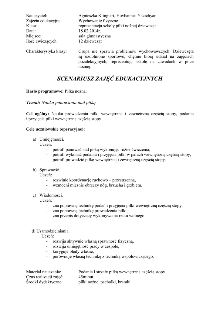 Nauczyciel: Zajęcia edukacyjne: Klasa: Data: Miejsce: Ilość ćwiczących: Agnieszka Klingiert, Hovhannes Yazichyan Wychowanie fizyczne reprezentacja szkoły piłki nożnej dziewcząt 18.02.2014r. sala gimnastyczna 12 dziewcząt Charakterystyka klasy: Grupa nie sprawia problemów wychowawczych. Dziewczęta są uzdolnione sportowo, chętnie biorą udział na zajęciach pozalekcyjnych, reprezentują szkołę na zawodach w piłce nożnej. SCENARIUSZ ZAJĘĆ EDUKACYJNYCH Hasło programowe: Piłka nożna. Temat: Nauka panowania nad piłką. Cel ogólny: Nauka prowadzenia piłki wewnętrzną i zewnętrzną częścią stopy, podania i przyjęcia piłki wewnętrzną częścią stopy. Cele uczniowskie (operacyjne): a) Umiejętności. Uczeń: - potrafi panować nad piłką wykonując różne ćwiczenia, - potrafi wykonać podania i przyjęcia piłki w parach wewnętrzną częścią stopy, - potrafi prowadzić piłkę wewnętrzną i zewnętrzną częścią stopy. b) Sprawność. Uczeń: - rozwinie koordynację ruchowo – przestrzenną, - wzmocni mięsnie obręczy nóg, brzucha i grzbietu. c) Wiadomości. Uczeń: - zna poprawną technikę podań i przyjęcia piłki wewnętrzną częścią stopy, - zna poprawną technikę prowadzenia piłki, - zna przepis dotyczący wykonywania rzutu wolnego. d) Usamodzielniania. Uczeń: - rozwija aktywnie własną sprawność fizyczną, - rozwija umiejętność pracy w zespole, - koryguje błędy własne, - porównuje własną technikę z techniką współćwiczącego. Materiał nauczania: Czas realizacji zajęć: Środki dydaktyczne: Podania i strzały piłką wewnętrzną częścią stopy. 45minut. piłki nożne, pachołki, bramki Sposoby pomiaru i ewaluacji osiąganych celów nauczyciela: obserwacja pracy uczniów i dokonywanie bieżącej korekty, porównywanie techniki podań i przyjęcia piłki wewnętrzną częścią stopy, prowadzenia piłki wewnętrzną i zewnętrzną częścią stopy z poprzednich zajęć. Część lekcji Część wstępna Część główna A Część główna B Czynności uczniów Docelowe Zadania Uczeń: Zapoznaje się z - słucha informacji zadaniem lekcji. nauczyciela. - przygotowuje się do aktywnego uczestnictwa w lekcji. Bierze aktywny udział w rozgrzewce: - bieg po długości sali - skip A, - skip C, - bieg skrzyżny, - bieg sprintem, - bieg z przeszkodami, Rozgrzewa mięśnie i stawy Rozciąga mięśnie nóg, brzucha, grzbietu i rąk. Przygotuje się do Uczeń słucha i obserwuje realizacji zadania nauczyciela. Wykonuje głównego lekcji. następujące ćw. w parach: - podskakiwanie na jednej nodze, drugą trzymając na piłce, - rysowanie ósemek nogami dookoła piłki, Realizuje zadanie - podawanie piłki z prawej główne lekcji. do lewej nogi, Nauka techniki - toczenie piłki w różne podań i przyjęcia strony, piłki wewnętrzną - podbijanie piłki częścią stopy, - zabawa „ Części ciała prowadzenia piłki i piłka”, wewnętrzną - podania stojącej piłki i zewnętrzną wewnętrzną częścią stopy częścią stopy w parach, - podania piłki z woleja wewnętrzną częścią stopy w parach, - prowadzenie piłki ze zmianą kierunku, - prowadzenie piłki po prostej w biegu, - prowadzenia piłki między pachołkami, Pobudza i przygotowuje organizm do wysiłku. Czynności nauczyciela Metody - Sprawdza listę Pogadanka. obecności i gotowość uczniów do zajęć - motywuje uczniów do lekcji, wyjaśnia znaczenie podania i strzału piłki wewnętrzną częścią stopy w grze. - Poleca wykonanie Zadaniowa ćwiczeń, -ścisła. - czuwa nad prawidłowym wykonaniem ćwiczeń. - demonstruje ćwiczenia, - kontroluje rytm i tempo wykonywanych ćwiczeń. Naśladowc za - ścisła. - Demonstruje poszczególne ćwiczenia, - daje sygnał gwizdkiem, - koryguje występujące błędy, - wyjaśnia celowość wykonywania poszczególnych ćwiczeń, - objaśnia poprawną technikę panowania nad piłką, Zadaniowa -ścisła. Pogadanka. Pogadanka. Zadaniowa -ścisła. - wyjaśnia zasady zabawy, Pogadanka. - demonstruje ćwiczenie, - ustawia uczniów, - zwraca uwagę na poprawną technikę, -gra w szkolną piłkę halową. Część końcowa Rozciąga i uspokaja organizm. Wykonuje ćwiczenia rozciągające: - skłony w rozkroku, - rozciąganie mięśni barkowych, - leżenie przodem, unoszenie tułowia. Stoi na zbiórce, słucha analizy i podsumowania nauczyciela. - ustawia uczniów na boisku i wyjaśnia przepis gry - sędziuje mecz i poprawia występujące błędy. - Demonstruje ćwiczenie, Naśladowc - czuwa nad poprawnością za – ścisła. wykonania ćwiczeń, - ustawia uczniów w szeregu - podsumowuje zajęcia. Pogadanka.