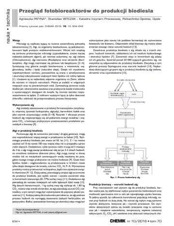 nauka • technika Przegląd fotobioreaktorów do produkcji biodiesla Agnieszka PATYNA*, Stanisław WITCZAK – Katedra Inżynierii Procesowej, Politechnika Opolska, Opole Prosimy cytować jako: CHEMIK 2016, 70, 10, 634–643 Wstęp Mikroalgi są najdłużej żyjącą na świecie autotroficzną jednostką taksonomiczną [1]. Algi, to organizmy beztkankowe, są jednokomórkowcami bądź prostymi wielokomórkowcami. Wśród nich znajdują się zarówno prokariotycze mikroalgi (cyjanobakterie, zwane inaczej niebiesko-zielonymi algami), jak również eukarionty, np. algi zielone (Chloroxybacteria), algi czerwone (Rhodophyta) oraz okrzemki (Bacillariophta). Algi mogą rozmnażać się płciowo lub bezpłciowo [2÷4]. Syntetyzują trzy główne związki biochemiczne, a mianowicie: węglowodany, białka i lipidy (naturalne oleje). Dzięki ich wysokiemu współczynnikowi wzrostu, powszechnie są znane z syntetyzowania i akumulacji zdecydowanie większych ilości lipidów niż rośliny lądowe [1]. Uważane są za najbardziej odporne organizmy na Ziemi, zdolne do wzrostu w różnych warunkach. Można je znaleźć w wilgotnych miejscach oraz na powierzchniach wód. Zamieszkują zarówno wody słodkie jak i ekstremalnie zasolone oraz praktycznie każde środowisko z wystarczającym dostępem do światła. Są również szeroko rozpowszechnione na lądzie. Z roślinami wyższymi łączy je tylko obecność chlorofilu i zdolność do przeprowadzania procesu fotosyntezy. wykorzystane jako nawóz lub poddane fermentacji do wytworzenia bioetanolu lub bioetanu. Odpowiedni skład biomasy alg można także zmieniać stosując różne warunki hodowli [13]. Zasadnicza produkcja biodiesla z alg składa się z trzech etapów: hodowli komórek, oddzielenia ich od medium hodowlanego i ekstrakcji lipidów [7]. Zawartość oleju w komórkach alg zależy od ich gatunku. Spośród ponad 50 000 żyjących gatunków alg, nie wszystkie są odpowiednie do produkcji biodiesla. Decydują o tym głównie procesy fizjologiczne oraz warunki hodowli [14]. Najbardziej obiecującymi grupami alg w produkcji biodiesla są algi zielone, okrzemki oraz cyjanobakterie [15]. Wykorzystanie alg Algi znalazły zastosowanie w produkcji farmaceutyków (antybiotyki, witaminy, żywność funkcjonalna, algicydy), barwników, białek oraz jako czynnik oczyszczający wodę [5÷8]. Rysunek 1 obrazuje proces hodowli alg rozpoczynający się od pobierania energii świetlnej i wiązania CO2, a kończący praktycznym przeznaczeniem produktów powstałych z biomasy [9]. Algi w produkcji biodiesla Porównując algi do surowców pierwszej i drugiej generacji, mogą one wyprodukować więcej energii w przeliczeniu na hektar [10]. Technologia produkcji biodiesla jest znana od 50. lat [11]. Z 1 ha można uzyskać od 10 do nawet 100 razy więcej oleju niż w przypadku upraw roślin olejnych. Dodatkowo, cykle życiowe roślin trwają od 3 miesięcy do 3 lat, a algi mogą zacząć produkować olej już po 3–5 dniach hodowli, co umożliwia codzienne zbieranie plonu. Algi mogą rosnąć w słonej wodzie lub na nieużytkach zawierających wodę niezdatną do picia, gdzie niczego innego praktycznie nie można hodować [9]. Duże ilości lipidów, białek i węglowodanów są produkowane w krótkim czasie tylko dzięki dostępowi do światła, cukrów, CO2, N, P i K. Wymienione produkty można przetwarzać na biopaliwa, bądź inne użyteczne związki chemiczne [9, 12]. Dużą zaletą, pozwalającą uważać algi za surowiec do produkcji biodiesla, jest szybki wzrost i wysoka zawartość oleju w komórkach (stanowiąca 20–77% suchej masy) [11]. Dodatkowo algi potrzebują do wzrostu mniejszych od roślin lądowych ilości wody [13]. Wg danych literaturowych, 1 kg suchej masy alg utylizuje ok. 1,83 kg CO2, można więc śmiało stwierdzić, że algi pozwalają usuwać CO2 z atmosfery, a tym samym mogą być wykorzystane do poprawy jakości powietrza [11]. Kolejną zaletą dla środowiska jest także to, że algi podczas procesu hodowli nie wymagają stosowania żadnych herbicydów, ani pestycydów. Białka i pozostałości biomasy po ekstrakcji oleju mogą być *Autor do korespondencji: Mgr inż. Agnieszka PATYNA, e-mail: [email protected] 634 • Rys. 1. Proces hodowlany alg Produkcja biomasy – warunki hodowli alg Przy rozważaniach nad użyciem alg do produkcji biodiesla, bardzo ważne jest, by zdefiniować wpływ parametrów hodowlanych oraz możliwość operowania nimi w celu jak największego uzysku biomasy. To jedyny sposób, by całkowicie kontrolować populację mikroalg, nawet przy hodowli na dużą skalę. Na wzrost alg wpływ mają zarówno czynniki abiotyczne, biotyczne jak i czynniki procesowe. Do czynników abiotycznych zalicza się światło (znaczenie mają tu zarówno czas jak i natężenie naświetlania), temperaturę, stężenie substancji odżywczych, O2, CO2, pH, zasolenie oraz obecność toksycznych che- nr 10/2016 • tom 70 Systemy produkcji glonów Hodowlę alg można prowadzić w systemach otwartych (stawach hodowlanych) oraz w kontrolowanych systemach zamkniętych, nazwanych fotobioreaktorami. Fotobioreaktory (PBR), to systemy, w któ- nr 10/2016 • tom 70 rych kultura hodowlana jest ograniczona przezroczystym materiałem. Urządzenia te mogą mieć rożne rozmiary i kształty; mogą przybierać formę plastikowych toreb, płaskich paneli, rur lub fermentatorów. Najbardziej popularne są pionowe rury; są względnie proste w utrzymaniu, tanie oraz mają dużą powierzchnię w stosunku do objętości [20]. Największymi zaletami fotobioreaktorów jest odporność na zanieczyszczenia, osiąganie wysokiej produktywności na jednostkę powierzchni oraz możliwość łatwej kontroli parametrów hodowlanych (pH, temperatury, intensywności światła). Można w nich również zapobiegać zbyt intensywnemu namnażaniu komórek alg; pozwalają na oszczędzanie wody i środków chemicznych [21]. Fotobioreaktory mogą znajdować się wewnąt