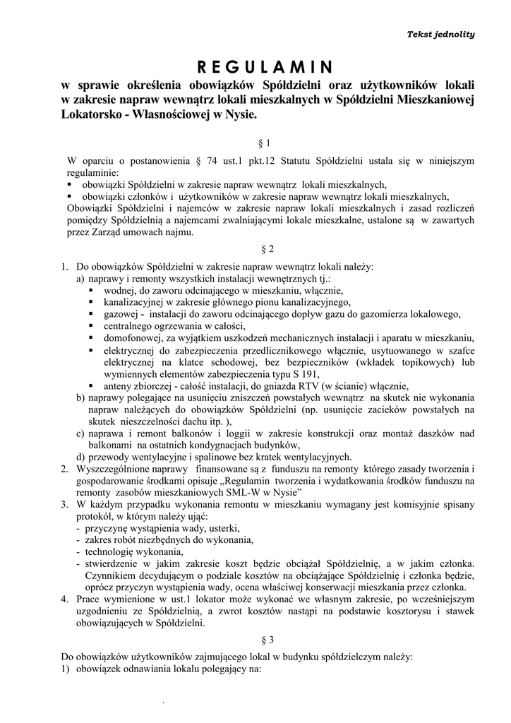 Tekst jednolity REGULAMIN w sprawie określenia obowiązków Spółdzielni oraz użytkowników lokali w zakresie napraw wewnątrz lokali mieszkalnych w Spółdzielni Mieszkaniowej Lokatorsko - Własnościowej w Nysie. §1 W oparciu o postanowienia § 74 ust.1 pkt.12 Statutu Spółdzielni ustala się w niniejszym regulaminie: obowiązki Spółdzielni w zakresie napraw wewnątrz lokali mieszkalnych, obowiązki członków i użytkowników w zakresie napraw wewnątrz lokali mieszkalnych, Obowiązki Spółdzielni i najemców w zakresie napraw lokali mieszkalnych i zasad rozliczeń pomiędzy Spółdzielnią a najemcami zwalniającymi lokale mieszkalne, ustalone są w zawartych przez Zarząd umowach najmu. §2 1. Do obowiązków Spółdzielni w zakresie napraw wewnątrz lokali należy: a) naprawy i remonty wszystkich instalacji wewnętrznych tj.: wodnej, do zaworu odcinającego w mieszkaniu, włącznie, kanalizacyjnej w zakresie głównego pionu kanalizacyjnego, gazowej - instalacji do zaworu odcinającego dopływ gazu do gazomierza lokalowego, centralnego ogrzewania w całości, domofonowej, za wyjątkiem uszkodzeń mechanicznych instalacji i aparatu w mieszkaniu, elektrycznej do zabezpieczenia przedlicznikowego włącznie, usytuowanego w szafce elektrycznej na klatce schodowej, bez bezpieczników (wkładek topikowych) lub wymiennych elementów zabezpieczenia typu S 191, anteny zbiorczej - całość instalacji, do gniazda RTV (w ścianie) włącznie, b) naprawy polegające na usunięciu zniszczeń powstałych wewnątrz na skutek nie wykonania napraw należących do obowiązków Spółdzielni (np. usunięcie zacieków powstałych na skutek nieszczelności dachu itp. ), c) naprawa i remont balkonów i loggii w zakresie konstrukcji oraz montaż daszków nad balkonami na ostatnich kondygnacjach budynków, d) przewody wentylacyjne i spalinowe bez kratek wentylacyjnych. 2. Wyszczególnione naprawy finansowane są z funduszu na remonty którego zasady tworzenia i gospodarowanie środkami opisuje „Regulamin tworzenia i wydatkowania środków funduszu na remonty zasobów mieszkaniowych SML-W w Nysie” 3. W każdym przypadku wykonania remontu w mieszkaniu wymagany jest komisyjnie spisany protokół, w którym należy ująć: - przyczynę wystąpienia wady, usterki, - zakres robót niezbędnych do wykonania, - technologię wykonania, - stwierdzenie w jakim zakresie koszt będzie obciążał Spółdzielnię, a w jakim członka. Czynnikiem decydującym o podziale kosztów na obciążające Spółdzielnię i członka będzie, oprócz przyczyn wystąpienia wady, ocena właściwej konserwacji mieszkania przez członka. 4. Prace wymienione w ust.1 lokator może wykonać we własnym zakresie, po wcześniejszym uzgodnieniu ze Spółdzielnią, a zwrot kosztów nastąpi na podstawie kosztorysu i stawek obowiązujących w Spółdzielni. §3 Do obowiązków użytkowników zajmującego lokal w budynku spółdzielczym należy: 1) obowiązek odnawiania lokalu polegający na: Tekst jednolity obowiązujący od 07.12.2012r. 2 2) 3) 4) 5) 6) 7) 8) 9) a) malowaniu sufitów, ścian lub tapetowaniu ścian z częstotliwością wynikającą z właściwości techniczno - estetycznych użytych materiałów, b) konserwacji drzwi i okien obustronnie oraz drzwi zewnętrznych, ścian, podłóg przeznaczonych do malowania olejnego oraz grzejników, rur i innych urządzeń malowanych olejno dla zabezpieczenia przed korozją - w miarę wystąpienia takich potrzeb, c) konserwacji posadzek, d) cyklinowaniu i lakierowaniu posadzek drewnianych, naprawa instalacji i urządzeń techniczno - sanitarnych w mieszkaniu, łącznie z wymianą tych urządzeń tj.: montaż, naprawa, legalizacja, wymiana wodomierzy ciepłej i zimnej wody, naprawa lub wymiana instalacji wodnej od zaworu odcinającego w mieszkaniu, naprawa lub wymiana instalacji kanalizacyjnej od głównego pionu do urządzenia w mieszkaniu, naprawa lub wymiana urządzeń sanitarnych (muszle i spłuczki ustępowe, wanny, brodziki, kabiny prysznicowe, zlewozmywaki, umywalki, baterie wannowe, zlewozmywakowe i umywalkowe), ich szczelne podłączenia i uszczelnienia styków urządzeń ze ścianami (zabezpieczenie przed przedostawaniem się wody w szczeliny ścian i podłóg) oraz prawidłowe ich użytkowanie, czyszczenie (przetykanie) muszli ustępowych, syfonów, kratek ściekowych oraz podejść do pionów kanalizacyjnych, uszczelnienie i wymiana instalacji gazowej oraz urządzeń gazowych (piecyki wieloczerpalne, termy, kuchenki gazowe, gazomierze) w lokalu mieszkalnym od zaworu odcinającego dopływ gazu do gazomierza, naprawa lub wymiana instalacji elektrycznej w mieszkaniu od zabezpieczenia przedlicznikowego usytuowanego w szafce na klatce schodowej, łącznie z wymianą bezpieczników (wkładek topikowych) lub wymiennych elementów zabezpieczenia typu S 191, naprawa lub wymiana telewizyjnych kabli przyłączeniowych, naprawa i wymiana podłoży betonowych i cementowych oraz wykładzin podłogowych (tj. panele, parkiet, płytki ceramiczne, PCV itp.), usunięcie wszelkich uszkodzeń wewnątrz lokalu i w lokalach sąsiadujących powstałych z winy członka lub jego domowników lub w wyniku naturalnego zużycia, zabezpieczenie na okres zimowy mieszkania i przynależnej do mieszkania piwnicy przed stratami ciepła, naprawa lub wymiana drzwi wejściowych do mieszkania i do piwnic. naprawa i wymiana drzwi wewnątrz mieszkania, naprawa bądź wymiana zamków, wkładek, okuć, klamek w stolarce okiennej i drzwiowej, naprawa i wymiana stolarki okiennej w lokalu mieszkalnym wraz z parapetami w lokalu oraz uszczelnienie styku zewnętrznego (poziomego i pionowego) okna ze ścianą zewnętrzną i parapetem, W przypadku podjęcia przez Radę Nadzorczą uchwały o dofinansowaniu ze środków dodatkowych wymiany pierwszego etapu stolarki okiennej w mieszkaniach, Spółdzielnia zwraca koszty wymiany poniesione przez członka według niżej podanych zasad: a) wymiana okien wynika z kolejności zapis