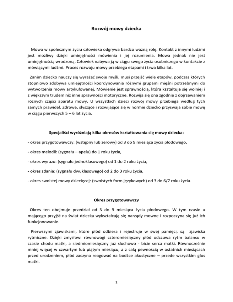 Rozwój mowy dziecka Mowa w społecznym życiu człowieka odgrywa bardzo ważną rolę. Kontakt z innymi ludźmi jest możliwy dzięki umiejętności mówienia i jej rozumienia. Mowa jednak nie jest umiejętnością wrodzoną. Człowiek nabywa ją w ciągu swego życia osobniczego w kontakcie z mówiącymi ludźmi. Proces rozwoju mowy przebiega etapami i trwa kilka lat. Zanim dziecko nauczy się wyrażać swoje myśli, musi przejść wiele etapów, podczas których stopniowo zdobywa umiejętności koordynowania różnymi grupami mięśni potrzebnymi do wytworzenia mowy artykułowanej. Mówienie jest sprawnością, która kształtuje się wolniej i z większym trudem niż inne sprawności motoryczne. Rozwija się ona zgodnie z dojrzewaniem różnych części aparatu mowy. U wszystkich dzieci rozwój mowy przebiega według tych samych prawideł. Zdrowe, słyszące i rozwijające się w normie dziecko przyswaja sobie mowę w ciągu pierwszych 5 – 6 lat życia. Specjaliści wyróżniają kilka okresów kształtowania się mowy dziecka: - okres przygotowawczy: (wstępny lub zerowy) od 3 do 9 miesiąca życia płodowego, - okres melodii: (sygnału – apelu) do 1 roku życia, - okres wyrazu: (sygnału jednoklasowego) od 1 do 2 roku życia, - okres zdania: (sygnału dwuklasowego) od 2 do 3 roku życia, - okres swoistej mowy dziecięcej: (swoistych form językowych) od 3 do 6/7 roku życia. Okres przygotowawczy Okres ten obejmuje przedział od 3 do 9 miesiąca życia płodowego. W tym czasie u mającego przyjść na świat dziecka wykształcają się narządy mowne i rozpoczyna się już ich funkcjonowanie. Pierwszymi zjawiskami, które płód odbiera i rejestruje w swej pamięci, są zjawiska rytmiczne. Dzięki zmysłowi równowagi czteromiesięczny płód odczuwa rytm balansu w czasie chodu matki, a siedmiomiesięczny już słuchowo - bicie serca matki. Równocześnie mniej więcej w czwartym lub piątym miesiącu, a z całą pewnością w ostatnich miesiącach przed urodzeniem, płód zaczyna reagować na bodźce akustyczne – przede wszystkim głos matki. 1 Okres melodii Okres ten rozpoczyna się z chwilą urodzenia dziecka i trwa do ukończenia przez nie pierwszego roku życia. Początkowo dziecko komunikuje się z otoczeniem za pomocą krzyku i płaczu, po którym matka rozpoznaje jego potrzeby. Krzyk jest ćwiczeniem narządu oddechowego, podczas którego można dostrzec krótki wdech i znacznie dłuższy wydech. Chociaż płacz dziecka jest odruchem bezwarunkowym, to uznajemy je za pierwsze reakcje prewokaliczne, za początek mowy. Między drugim a trzecim miesiącem życia pojawia się głużenie. Są to dźwięki podobne do samogłosek i spółgłosek. Z czasem daje się nawet usłyszeć grupy samogłoskowe oraz spółgłoskowe. Choć nie są świadomie wymawiane, to ich artykułowanie ćwiczy narządy mowy: język, wargi, żuchwę i podniebienie miękkie. Głużą wszystkie dzieci, także głuche od urodzenia. Około szóstego miesiąca życia rozpoczyna się gaworzenie. Teraz dziecko zaczyna świadomie powtarzać i naśladować dźwięki mowy. Dzięki nabywaniu takich cech jak spostrzegawczości, koncentracja uwagi, bardziej pewna pamięć, dziecko naśladuje teraz dźwięki, które wydało przypadkowo oraz dźwięki, których brzmienie uchwyciło z otoczenia. W gaworzeniu słyszymy sylaby: ma - ma, la - la, ba - ba , ta - ta, z których następnie zbuduje pierwsze słowa. Przed ukończeniem pierwszego roku życia powinny pojawić się pierwsze słowa. Najczęściej są nimi: mama, tata, baba. Należy zauważyć, że wraz z omawianymi etapami kształtowania mowy równolegle przebiega rozwój fizyczny dziecka – dziecko zaczyna unosić głowę, siadać, stać, chodzić. Okres wyrazu Okres wyrazu trwa zazwyczaj od pierwszego do drugiego roku życia. Szybki rozwój ruchowy dziecka w tym czasie pozwala na intensywne poznawanie otaczającego świata, nazywanie interesujących go przedmiotów i odkrywanie ich cech. Mniej więcej w tym wieku u wielu dzieci obserwujemy zjawisko określane jako eksplozja nazywania. Polega ono na etykietowaniu wszystkiego, co znajduje się w zasięgu wzroku. Maluch rozumie o wiele więcej słów, wyrażeń i zdań niż jest w stanie samodzielnie wypowiedzieć (mówimy wtedy o słowniku biernym). W wieku 18 miesięcy przeciętne dziecko posiada słownik liczący około 50 słów, które umie powiedzieć, oraz około 100 słów, które rozumie. Charakterystyczną cechą wymowy dziecka w tym okresie jest upraszczanie budowy słów przez określanie nazwy wyrazu jego pierwszą lub ostatnią sylabą (np. miś - mi, nie – ne, daj da, pomidor - midol). 2 Okres zdania Okres zdania trwa zazwyczaj od 2 od 3 roku życia. W tym okresie wyłaniają się poszczególne kategorie gramatyczne, gwałtownie wzbogaca się słownik. Mowa ulega dalszemu doskonaleniu. Dziecko powinno już wymawiać wszystkie samogłoski ustne i nosowe. Ze spółgłosek trudności sprawiają mu głoski: s, z, c, dz, sz, ż/rz, cz, dż, oraz r, gdyż narządy mowy nie są jeszcze dostatecznie sprawne. Toteż głoski trudniejsze są zastępowane łatwiejszymi. Samogłoski mogą być jeszcze wymawiane niewłaściwie. W sumie mowa jest już zrozumiała dla najbliższego otoczenia. Dziecko zaczyna mówić zdaniami 2 – 3 wyrazowymi. Są to zdania oznajmujące, rozkazujące, pytające, wykrzyknikowe. Najczęściej używa rzeczowników – nazw konkretnych przedmiotów. Czasowniki jako nazwy czynności używa w formie bezokolicznika, lecz w niedługim czasie pojawiają się w czasie teraźniejszym, przyszłym i przeszłym w formie strony czynnej, biernej i zwrotnej jednak nie zawsze poprawnie. Dwulatki używają kilkunastu przymiotników i pojawiają się spójniki. Okres swoistej mowy dziecięcej Okres swoistej mowy dziecięcej trwa od 3 do 6/7 lat. Kończy się wraz z opanowaniem przez dziecko poprawnej wymowy. Może trwać kilka lat. Jest to okres urokliwych rozmów pełnych uproszczeń, przestawi