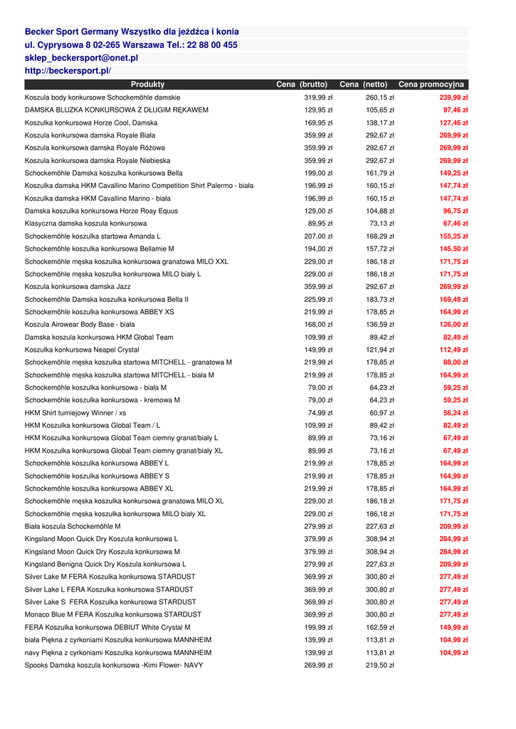 Becker Sport Germany Wszystko dla jeźdźca i konia ul. Cyprysowa 8 02-265 Warszawa Tel.: 22 88 00 455 [email protected] http://beckersport.pl/ Produkty Cena (brutto) Cena (netto) Cena promocyjna Koszula body konkursowe Schockemöhle damskie 319,99 zł 260,15 zł 239,99 zł DAMSKA BLUZKA KONKURSOWA Z DŁUGIM RĘKAWEM 129,95 zł 105,65 zł 97,46 zł Koszulka konkursowa Horze Cool, Damska 169,95 zł 138,17 zł 127,46 zł Koszula konkursowa damska Royale Biała 359,99 zł 292,67 zł 269,99 zł Koszula konkursowa damska Royale Różowa 359,99 zł 292,67 zł 269,99 zł Koszula konkursowa damska Royale Niebieska 359,99 zł 292,67 zł 269,99 zł Schockemöhle Damska koszulka konkursowa Bella 199,00 zł 161,79 zł 149,25 zł Koszulka damska HKM Cavallino Marino Competition Shirt Palermo - biała 196,99 zł 160,15 zł 147,74 zł Koszulka damska HKM Cavallino Marino - biała 196,99 zł 160,15 zł 147,74 zł Damska koszulka konkursowa Horze Roay Equus 129,00 zł 104,88 zł 96,75 zł Klasyczna damska koszula konkursowa 89,95 zł 73,13 zł 67,46 zł Schockemöhle koszulka startowa Amanda L 207,00 zł 168,29 zł 155,25 zł Schockemöhle koszulka konkursowa Bellamie M 194,00 zł 157,72 zł 145,50 zł Schockemöhle męska koszulka konkursowa granatowa MILO XXL 229,00 zł 186,18 zł 171,75 zł Schockemöhle męska koszulka konkursowa MILO biały L 229,00 zł 186,18 zł 171,75 zł Koszula konkursowa damska Jazz 359,99 zł 292,67 zł 269,99 zł Schockemöhle Damska koszulka konkursowa Bella II 225,99 zł 183,73 zł 169,49 zł Schockemöhle koszulka konkursowa ABBEY XS 219,99 zł 178,85 zł 164,99 zł Koszula Airowear Body Base - biała 168,00 zł 136,59 zł 126,00 zł Damska koszula konkursowa HKM Global Team 109,99 zł 89,42 zł 82,49 zł Koszulka konkursowa Neapel Crystal 149,99 zł 121,94 zł 112,49 zł Schockemöhle męska koszulka startowa MITCHELL - granatowa M 219,99 zł 178,85 zł 88,00 zł Schockemöhle męska koszulka startowa MITCHELL - biała M 219,99 zł 178,85 zł 164,99 zł Schockemöhle koszulka konkursowa - biała M 79,00 zł 64,23 zł 59,25 zł Schockemöhle koszulka konkursowa - kremowa M 79,00 zł 64,23 zł 59,25 zł HKM Shirt turniejowy Winner / xs 74,99 zł 60,97 zł 56,24 zł 109,99 zł 89,42 zł 82,49 zł HKM Koszulka konkursowa Global Team ciemny granat/biały L 89,99 zł 73,16 zł 67,49 zł HKM Koszulka konkursowa Global Team ciemny granat/biały XL 89,99 zł 73,16 zł 67,49 zł Schockemöhle koszulka konkursowa ABBEY L 219,99 zł 178,85 zł 164,99 zł Schockemöhle koszulka konkursowa ABBEY S 219,99 zł 178,85 zł 164,99 zł Schockemöhle koszulka konkursowa ABBEY XL 219,99 zł 178,85 zł 164,99 zł Schockemöhle męska koszulka konkursowa granatowa MILO XL 229,00 zł 186,18 zł 171,75 zł Schockemöhle męska koszulka konkursowa MILO biały XL 229,00 zł 186,18 zł 171,75 zł Biała koszula Schockemöhle M 279,99 zł 227,63 zł 209,99 zł Kingsland Moon Quick Dry Koszula konkursowa L 379,99 zł 308,94 zł 284,99 zł Kingsland Moon Quick Dry Koszula konkursowa M 379,99 zł 308,94 zł 284,99 zł Kingsland Benigna Quick Dry Koszula konkursowa L 279,99 zł 227,63 zł 209,99 zł Silver Lake M FERA Koszulka konkursowa STARDUST 369,99 zł 300,80 zł 277,49 zł Silver Lake L FERA Koszulka konkursowa STARDUST 369,99 zł 300,80 zł 277,49 zł Silver Lake S FERA Koszulka konkursowa STARDUST 369,99 zł 300,80 zł 277,49 zł Monaco Blue M FERA Koszulka konkursowa STARDUST 369,99 zł 300,80 zł 277,49 zł FERA Koszulka konkursowa DEBIUT White Crystal M 199,99 zł 162,59 zł 149,99 zł biała Piękna z cyrkoniami Koszulka konkursowa MANNHEIM 139,99 zł 113,81 zł 104,99 zł navy Piękna z cyrkoniami Koszulka konkursowa MANNHEIM 139,99 zł 113,81 zł 104,99 zł Spooks Damska koszula konkursowa -Kimi Flower- NAVY 269,99 zł 219,50 zł HKM Koszulka konkursowa Global Team / L Spooks Damska koszula konkursowa -Kimi Flower- CHALK PINK 269,99 zł 219,50 zł Spooks Damska koszula konkursowa -Showshirt Bicolor- WHITE/NAVY 269,99 zł 219,50 zł Spooks Damska koszula konkursowa -Kimi Flower-WHITE 269,99 zł 219,50 zł