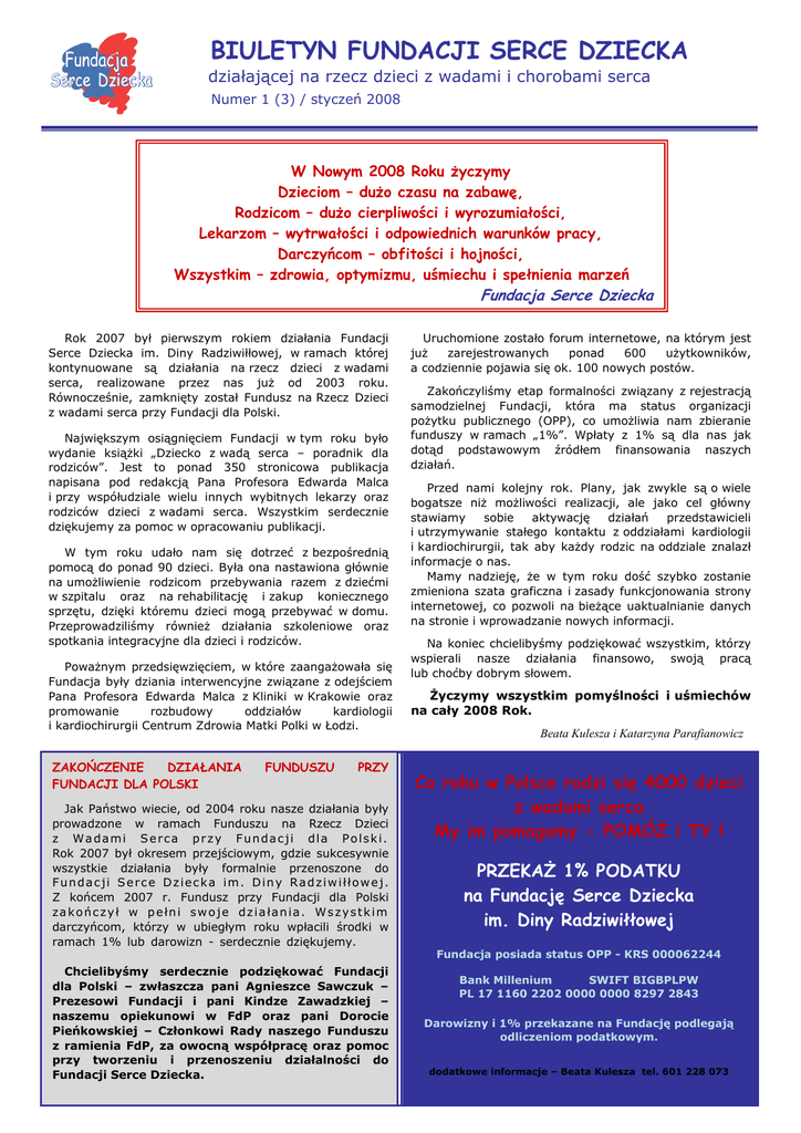 BIULETYN FUNDACJI SERCE DZIECKA działającej na rzecz dzieci z wadami i chorobami serca Numer 1 (3) / styczeń 2008 W Nowym 2008 Roku Ŝyczymy Dzieciom – duŜo czasu na zabawę, Rodzicom – duŜo cierpliwości i wyrozumiałości, Lekarzom – wytrwałości i odpowiednich warunków pracy, Darczyńcom – obfitości i hojności, Wszystkim – zdrowia, optymizmu, uśmiechu i spełnienia marzeń Fundacja Serce Dziecka Rok 2007 był pierwszym rokiem działania Fundacji Serce Dziecka im. Diny Radziwiłłowej, w ramach której kontynuowane są działania na rzecz dzieci z wadami serca, realizowane przez nas juŜ od 2003 roku. Równocześnie, zamknięty został Fundusz na Rzecz Dzieci z wadami serca przy Fundacji dla Polski. Największym osiągnięciem Fundacji w tym roku było wydanie ksiąŜki „Dziecko z wadą serca – poradnik dla rodziców”. Jest to ponad 350 stronicowa publikacja napisana pod redakcją Pana Profesora Edwarda Malca i przy współudziale wielu innych wybitnych lekarzy oraz rodziców dzieci z wadami serca. Wszystkim serdecznie dziękujemy za pomoc w opracowaniu publikacji. W tym roku udało nam się dotrzeć z bezpośrednią pomocą do ponad 90 dzieci. Była ona nastawiona głównie na umoŜliwienie rodzicom przebywania razem z dziećmi w szpitalu oraz na rehabilitację i zakup koniecznego sprzętu, dzięki któremu dzieci mogą przebywać w domu. Przeprowadziliśmy równieŜ działania szkoleniowe oraz spotkania integracyjne dla dzieci i rodziców. PowaŜnym przedsięwzięciem, w które zaangaŜowała się Fundacja były dziania interwencyjne związane z odejściem Pana Profesora Edwarda Malca z Kliniki w Krakowie oraz promowanie rozbudowy oddziałów kardiologii i kardiochirurgii Centrum Zdrowia Matki Polki w Łodzi. ZAKOŃCZENIE DZIAŁANIA FUNDACJI DLA POLSKI FUNDUSZU PRZY Jak Państwo wiecie, od 2004 roku nasze działania były prowadzone w ramach Funduszu na Rzecz Dzieci z Wadami Serca przy Fundacji dla Polski. Rok 2007 był okresem przejściowym, gdzie sukcesywnie wszystkie działania były formalnie przenoszone do Fundacji Serce Dziecka im. Diny Radziwiłłowej. Z końcem 2007 r. Fundusz przy Fundacji dla Polski z a k o ń c z y ł w p e łn i s w o j e d z i a ła n i a . W s z y s t k i m darczyńcom, którzy w ubiegłym roku wpłacili środki w ramach 1% lub darowizn - serdecznie dziękujemy. Uruchomione zostało forum internetowe, na którym jest juŜ zarejestrowanych ponad 600 uŜytkowników, a codziennie pojawia się ok. 100 nowych postów. Zakończyliśmy etap formalności związany z rejestracją samodzielnej Fundacji, która ma status organizacji poŜytku publicznego (OPP), co umoŜliwia nam zbieranie funduszy w ramach „1%”. Wpłaty z 1% są dla nas jak dotąd podstawowym źródłem finansowania naszych działań. Przed nami kolejny rok. Plany, jak zwykle są o wiele bogatsze niŜ moŜliwości realizacji, ale jako cel główny stawiamy sobie aktywację działań przedstawicieli i utrzymywanie stałego kontaktu z oddziałami kardiologii i kardiochirurgii, tak aby kaŜdy rodzic na oddziale znalazł informacje o nas. Mamy nadzieję, Ŝe w tym roku dość szybko zostanie zmieniona szata graficzna i zasady funkcjonowania strony internetowej, co pozwoli na bieŜące uaktualnianie danych na stronie i wprowadzanie nowych informacji. Na koniec chcielibyśmy podziękować wszystkim, którzy wspierali nasze działania finansowo, swoją pracą lub choćby dobrym słowem. śyczymy wszystkim pomyślności i uśmiechów na cały 2008 Rok. Beata Kulesza i Katarzyna Parafianowicz Co roku w Polsce rodzi się 4000 dzieci z wadami serca My im pomagamy - POMÓś i TY ! PRZEKAś 1% PODATKU na Fundację Serce Dziecka im. Diny Radziwiłłowej Fundacja posiada status OPP - KRS 000062244 Chcielibyśmy serdecznie podziękować Fundacji dla Polski – zwłaszcza pani Agnieszce Sawczuk – Prezesowi Fundacji i pani Kindze Zawadzkiej – naszemu opiekunowi w FdP oraz pani Dorocie Pieńkowskiej – Członkowi Rady naszego Funduszu z ramienia FdP, za owocną współpracę oraz pomoc przy tworzeniu i przenoszeniu działalności do Fundacji Serce Dziecka. Bank Millenium SWIFT BIGBPLPW PL 17 1160 2202 0000 0000 8297 2843 Darowizny i 1% przekazane na Fundację podlegają odliczeniom podatkowym. dodatkowe informacje – Beata Kulesza tel. 601 228 073 Instytut Centrum Zdrowia Matki Polki w Łodzi ul. Rzgowska 281/289 93-338 Łódź; tel. (0-42) 271-10-00 www.iczmp.edu.pl Instytut Centrum Zdrowia Matki Polki w Łodzi jest jednym z największych wysokospecjalistycznych ośrodków medycznych w Polsce. Jako szpital został otwarty 26 maja 1988 r., a od 16 września 1997 r. działa jako instytut podlegający bezpośrednio Ministerstwu Zdrowia. Poradnia K ardio logiczna Wizytę naleŜy ustalić telefonicznie: (0-42) 271-17-81. Niestety, terminy są dość odległe (czas oczekiwania - ok. 6 mies.). Na wizytę wymagane jest "skierowanie do poradni specjalistycznej" od pediatry (nie dotyczy dzieci objętych stałą opieką tej poradni) oraz aktualna ksiąŜeczka ubezpieczeniowa. Wskazane jest posiadanie ze sobą dokumentacji kardiologicznej dziecka. Po przyjściu do poradni naleŜy najpierw udać się do rejestracji, skąd dziecko kierowane jest na EKG. Niemowlęta i dzieci na pierwszej wizycie po operacji mają pierwszeństwo w przypadku kolejki. Przyjęci e do szpitala W pierwszej kolejności naleŜy udać się rejestracji wraz z dokumentami (skierowanie, aktualna ksiąŜeczka zdrowia, kopie całej dokumentacji kardiologicznej dziecka). Następnie odbywa się badanie ogólne w gabinecie lekarskim, po którym pielęgniarka z Kardiologii prowadzi rodziców z dzieckiem na Oddział. Klinika Kardiochirurgii dysponuje 1 salą operacyjną i 6 stanowiskami pooperacyjnymi, co przy obecnej, stale rosnącej liczbie dzieci wymagających interwencji kardiochirurgicznych jest niewystarczające. Dlatego Lekarze i rodzice starają się o powiększenie, najlepiej podwojenie, obecnych zasobów lokalowo-technic