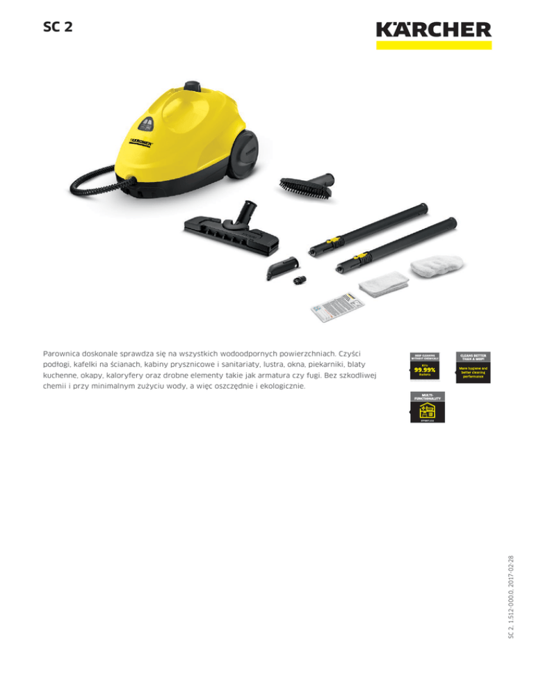 SC 2 Parownica doskonale sprawdza się na wszystkich wodoodpornych powierzchniach. Czyści * podłogi, kafelki na ścianach, kabiny prysznicowe i sanitariaty, lustra, okna, piekarniki, blaty kuchenne, okapy, kaloryfery oraz drobne elementy takie jak armatura czy fugi. Bez szkodliwej * When thoroughly cleaning with the Kärcher Steam Cleaner 99.99 % of all common household bacteria will be killed on common household hard surfaces. SC 2, 1.512-000.0, 2017-02-28 chemii i przy minimalnym zużyciu wody, a więc oszczędnie i ekologicznie. SC 2 Lekkie, kompaktowe urządzenie Dane techniczne 1.512-000.0 Numer katalogowy Wydajność powierzchniowa m² 75 Czas podgrzewania min. 6,5 Pojemność kotła / zbiornika wyrównawczego Maks. ciśnienie pary l 1+-/- bar 3,2 Moc grzałki W 1500 Przewód zasilający m 4 Ciężar bez wyposażenia kg 2,9 Wymiary (dł. x szer. x wys.) mm 380 × 254 × 260 Wyposażenie standardowe Bezpieczna blokada / Zawór bezpieczeństwa Regulacja ilości pary Wbudowany lejek do napełniania Zestaw do czyszczenia podłóg Comfort + Rury ssące 2 x 0,5 m Na rękojeści Dysza ręczna, dysza do detali, okrągła szczotka Wyposażenie Ściereczka podłogowa frotte szt. 1 Ściereczka frotte do dyszy ręcznej szt. 1 Odkamieniacz w pałeczkach Wąż parowy z pistoletem Pozycja parking Objęte dostawą. m 2 SC 2, 1.512-000.0, 2017-02-28 4054278040165 Akcesoria dla SC 2 1.512-000.0 1 2 3 4 5 6 7 9 10 11 12 13 14 15 Numer katalogowy Cena Opis Dysze Dysza ręczna 1 2.884-280.0 Dysza podłogowa Comfort Mini 2 2.863-244.0 Zestaw do czyszczenia podłóg "Comfort Plus" Dysza do czyszczenia okien 3 2.863-019.0 Dysza power 5 2.884-282.0 Dysza do pielęgnacji tekstyliów Dysza do pielęgnacji tekstyliów für SC Gumowa listwa do dyszy do okien 4 2.863-025.0 6 4.130-390.0 Dysza ręczna ze szczeciną do czyszczenia niewielkich powierzchni np. kabiny prysznicowe, płytki ścienne itp. Przeznaczona do pracy z lub bez powłoczki z mikrofibry. Dzięki swoim kompaktowym wymiarom dysza podłogowa "Comfort Mini" dociera do trudno dostępnych miejsc. W zestawie dysza podłogowa Comfort Plus i ściereczka do dyszy podłogowej wykonana z mikrofibry. Dysza do okien dokładnie czyści szkło, okna oraz lustra przy użyciu parownicy. Dysza Power z przedłużką znacznie zwiększa siłę czyszczenia dyszy do detali. Doskonała do łatwego, ekologicznego czyszczenia trudnodostępnych miejsc np. rogów. Dysza do pielęgnacji tekstyliów odświeża i usuwa zagięcia ubrań i tekstyliów, efektywnie usuwając nieprzyjemne zapachy. Posiada warstwę usuwającą meszek. 7 2.863-233.0 8 6.273-140.0 Gumowa listwa do dyszy do okien dla parownic. 9 2.863-243.0 Zestaw składa się z: 2 miękkich powłoczek z mikrofibry na dużą szczotkę okrągłą. Do czyszczenia silnie zabrudzonych powierzchni w kuchni i w łazience. Zestaw ściereczek zawiera cztery różne rodzaje ściereczek z mikrofibry do czyszczenia łazienki. Zestaw ściereczek zawiera cztery różne rodzaje ściereczek z mikrofibry do czyszczenia kuchni. Dwie miękkie welurowe ściereczki podłogowe do łatwego usuwania zabrudzeń. Zapewniają doskonale czystą podłogę. Zestaw składa się z dwóch miękkich powłoczek z mikrofibry na dyszę ręczną przeznaczonych do czyszczenia silnie zabrudzonych powierzchni w kuchni i w łazience. Zestaw pięciu ściereczek (2 podłogowych i 3 powłoczek na dyszę ręczną) z wysokiej jakości bawełny. Zestaw pięciu wysoce chłonnych, wąskich ściereczek podłogowych z wysokiej jakości bawełny. Zestaw pięciu wysoce chłonnych ściereczek podłogowych z wysokiej jakości bawełny. Zestaw pięciu wysoce chłonnych powłoczek na dyszę ręczną z wysokiej jakości bawełny. Zestawy ściereczek Miękkie powłoczki z mikrofibry na dużą szczotkę okrągłą Zestaw ścierek z mikrofibry do łazienki Zestaw ścierek z mikrofibry do kuchni Zestaw ścierek z mikrofibry do podłogi Zestaw powłoczek z mikrofibry 10 2.863-171.0 11 2.863-172.0 12 2.863-173.0 13 2.863-174.0 Zestaw ściereczek frotte 14 6.960-019.0 Ściereczki podłogowe frotte, wąskie Ściereczki frotte 5 sztuk 15 6.369-357.0 Powłoczki frotte 5 sztuk 17 6.370-990.0 16 6.369-481.0 Zestaw okrągłych szczotek 18 2.863-058.0 Zestaw szczotek z mosiężną szczeciną 19 2.863-061.0 Okrągła szczotka – duża 20 2.863-022.0 Szczotka okrągła ze skrobakiem 21 2.863-140.0 Objęte dostawą. Dostępne akcesoria. Praktyczny zestaw okrągłych szczotek dostępny w dwóch kolorach Zestaw szczotek okrągłych z mosiężną szczeciną do usuwania uporczywych, zaschniętych zabrudzeń. Doskonałe do niewrażliwych powierzchni. Dzięki dużej, okrągłej szczotce wyczyścisz większą powierzchnię w krótszym czasie. Szczotka okrągła z dwoma rzędami odpornej na wysokie temperatury szczeciny oraz skrobakiem do łatwego usuwania uporczywych zabrudzeń. Nie nadaje się do czyszczenia powierzchni wrażliwych. SC 2, 1.512-000.0, 2017-02-28 Zestawy szczotek Akcesoria dla SC 2 1.512-000.0 22 23 24 Numer katalogowy 25 Cena Opis 22 2.863-159.0 Parowa szczotka Turbo ogranicza czas czyszczenia o połowę. Dzięki jej silnemu działaniu nie ma potrzeby szoro- wania. Umożliwia oszczędność czasu. Dysza do usuwania tapet 23 2.863-062.0 Zestaw uniwersalnych akcesoriów 24 2.863-215.0 Zestaw O-ringów 25 2.884-312.0 Zdzieracz do tapet doskonale usuwa tapety oraz pozostałości kleju wykorzystując działanie pary. Zestaw akcesoriów do parownic. W skład zestawu wchodzą: trzy bawełniane ściereczki podłogowe, trzy bawełniane powłoczki na dyszę ręczną, dwie czerwone i dwie czarne okrągłe szczotki. Zamienny zestaw O-ringów do wyposażenia parownic. Parowa szczotka Turbo Inne akcesoria SC 2, 1.512-000.0, 2017-02-28 Objęte dostawą. Dostępne akcesoria.