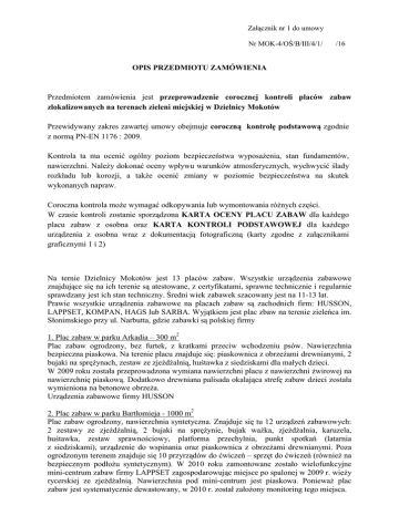 Załącznik nr 1 do umowy Nr MOK-4/OŚ/B/III/4/1/ /16 OPIS PRZEDMIOTU ZAMÓWIENIA Przedmiotem zamówienia jest przeprowadzenie corocznej kontroli placów zabaw zlokalizowanych na terenach zieleni miejskiej w Dzielnicy Mokotów Przewidywany zakres zawartej umowy obejmuje coroczną kontrolę podstawową zgodnie z normą PN-EN 1176 : 2009. Kontrola ta ma ocenić ogólny poziom bezpieczeństwa wyposażenia, stan fundamentów, nawierzchni. Należy dokonać oceny wpływu warunków atmosferycznych, wychwycić ślady rozkładu lub korozji, a także ocenić zmiany w poziomie bezpieczeństwa na skutek wykonanych napraw. Coroczna kontrola może wymagać odkopywania lub wymontowania różnych części. W czasie kontroli zostanie sporządzona KARTA OCENY PLACU ZABAW dla każdego placu zabaw z osobna oraz KARTA KONTROLI PODSTAWOWEJ dla każdego urządzenia z osobna wraz z dokumentacją fotograficzną (karty zgodne z załącznikami graficznymi 1 i 2) Na ternie Dzielnicy Mokotów jest 13 placów zabaw. Wszystkie urządzenia zabawowe znajdujące się na ich terenie są atestowane, z certyfikatami, sprawne technicznie i regularnie sprawdzany jest ich stan techniczny. Średni wiek zabawek szacowany jest na 11-13 lat. Prawie wszystkie urządzenia zabawowe na placach zabaw są zachodnich firm: HUSSON, LAPPSET, KOMPAN, HAGS lub SARBA. Wyjątkiem jest plac zbaw na terenie zieleńca im. Słonimskiego przy ul. Narbutta, gdzie zabawki są polskiej firmy 1. Plac zabaw w parku Arkadia – 300 m2 Plac zabaw ogrodzony, bez furtek, z kratkami przeciw wchodzeniu psów. Nawierzchnia bezpieczna piaskowa. Na terenie placu znajduje się: piaskownica z obrzeżami drewnianymi, 2 bujaki na sprężynach, zestaw ze zjeżdżalnią, huśtawka z siedziskami dla małych dzieci. W 2009 roku została przeprowadzona wymiana nawierzchni placu z nawierzchni żwirowej na nawierzchnię piaskową. Dodatkowo drewniana palisada okalająca strefę zabaw dzieci została wymieniona na betonowe obrzeża. Urządzenia zabawowe firmy HUSSON 2. Plac zabaw w parku Bartłomieja - 1000 m2 Plac zabaw ogrodzony, nawierzchnia syntetyczna. Znajduje się tu 12 urządzeń zabawowych: 2 zestawy ze zjeżdżalnią, 2 bujaki na sprężynie, bujak ważka, zjeżdżalnia, karuzela, huśtawka, zestaw sprawnościowy, platforma przechylnia, punkt spotkań (latarnia z siedziskami), urządzenie do wspinania oraz piaskownica z obrzeżami drewnianymi. Poza ogrodzonym terenem znajduje się 10 przyrządów do ćwiczeń – sprzęt do ćwiczeń (również na bezpiecznym podłożu syntetycznym). W 2010 roku zamontowane zostało wielofunkcyjne mini-centrum zabaw firmy LAPPSET zagospodarowując miejsce po spalonej w 2009 r. wieży rycerskiej ze zjeżdżalnią. Nawierzchnia pod mini-centrum jest piaskowa. Ponieważ plac zabaw jest systematycznie dewastowany, w 2010 r. został założony monitoring tego miejsca. 3. Plac zabaw w parku Dreszera - 260 m2 Plac zabaw znajduje się na terenie ogrodzonego parku, zamykanego na noc, jest ogrodzony, bez furtek, z kratkami przeciw wchodzeniu psów. Nawierzchnia bezpieczna syntetyczna. Urządzenia zabawowe: 4 bujaki na sprężynie, huśtawka, karuzela, zestaw ze zjeżdżalnią, zabawka lokomotywa z jednym wagonem. Plac zabaw jest remontowany wg zapotrzebowania, nie planowana jest w najbliższym czasie modernizacja placu. W okresie wiosna – jesień możliwość zakupu napoi i przekąsek w sąsiadującej restauracji. Dodatkową atrakcją jest znajdująca się obok fontanna. 4. Plac zabaw w Parku Mokotów przy ul. Dworkowej - 800 m2 Teren placu podzielony jest na 2 części: strefę zabaw dla dzieci młodszych 3-8 lat i strefę zabaw dzieci starszych 6-12 lat. Strefy te są wyraźnie wydzielone w przestrzeni. Plac zabaw dla dzieci najmłodszych położony jest na nawierzchni żwirowej i otoczony z trzech stron roślinnością. W skład urządzeń do zabawy wchodzą: pojedyncza huśtawka z siedziskiem dla małych dzieci, 6 bujaków na sprężynie, iglica wirująca, pociąg – ławka z wagonem, platforma na sprężynach, zjeżdżalnia i stolik do babek znajdujący się w piaskownicy. Plac zabaw dla dzieci starszych znajduje się wewnątrz obszernego placu piaskowego otoczonego obrzeżem z drewna oraz w części placu o nawierzchni żwirowej oddzielonego od placu dla najmłodszych dzieci za pomocą drewnianych palisad. Wewnątrz placu znajdują się następujące urządzenia do zabawy: statek, bocianie gniazdo, duża zjeżdżalnia, równoważnia, drążki gimnastyczne, zestaw do wspinania, bujak na sprężynie oraz iglica wirująca. W obrębie placu wokoło zabawek znajduje się nawierzchnia żwirowa lub piaskowa. Ruch po placu odbywa się po nawierzchni z kostki betonowej, łączącej wszystkie trzy wejścia. W 2009 roku plac zabaw był remontowany 5. Plac zabaw w Parku Mokotów przy ulicy Grottgera - 670 m2 Na ogrodzony plac w kształcie pięcioboku prowadzą 2 furtki. Na środku znajduje się plac piaskowy otoczony obrzeżem z drewna. Wewnątrz placu znajduje zlokalizowane są następujące urządzenia do zabawy: zestaw gimnastyczny, statek, stolik do zabawy piaskiem i 5 bujaków na sprężynach. Poza tym na obrzeżach placu znajdują się urządzenia: iglica wirująca, wirujący spodek i misa, wieża ze zjeżdżalnią, 2 huśtawki podwójne (w jednej 2 siedziska dla małych dzieci, w drugiej siedziska dla starszych dzieci) i lokomotywa. Komunikacja odbywa się po nawierzchni ziemnej ulepszonej otaczającej plac piaskowy. Obrzeże nawierzchni ziemnej stanowią betonowe krawężniki. Na obrzeżach placu znajdują się trawniki z krzewami. Plac był remontowany w 2009 roku. Nawierzchnia placu piaskowego została wymieniona w 2013 roku. Urządzenia zabawowe firmy HAGS i SARBA 6. Plac zabaw na terenie zieleńca przy ulicy Powsińskiej/Okrężnej -1651 m2 Plac zabaw nie jest ogrodzony. Nawierzchnia bezpieczna syntetyczna, na której stoi zestaw gimnastyczny, zestaw ze zjeżdżalnią, huśtawka, 2 stoły do ping-ponga i 2 bujaki na sprężynie. Pl